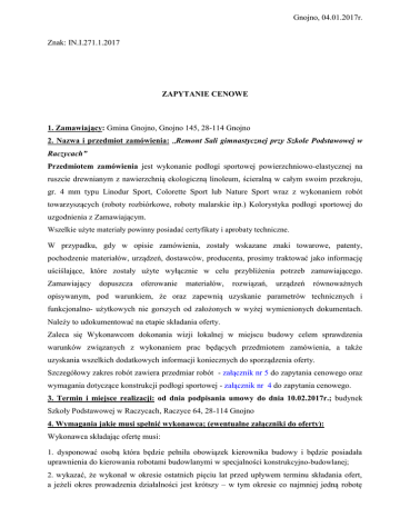 Gnojno, 04.01.2017r. Znak: IN.I.271.1.2017 ZAPYTANIE CENOWE 1. Zamawiający: Gmina Gnojno, Gnojno 145, 28-114 Gnojno 2. Nazwa i przedmiot zamówienia: „Remont Sali gimnastycznej przy Szkole Podstawowej w Raczycach” Przedmiotem zamówienia jest wykonanie podłogi sportowej powierzchniowo-elastycznej na ruszcie drewnianym z nawierzchnią ekologiczną linoleum, ścieralną w całym swoim przekroju, gr. 4 mm typu Linodur Sport, Colorette Sport lub Nature Sport wraz z wykonaniem robót towarzyszących (roboty rozbiórkowe, roboty malarskie itp.) Kolorystyka podłogi sportowej do uzgodnienia z Zamawiającym. Wszelkie użyte materiały powinny posiadać certyfikaty i aprobaty techniczne. W przypadku, gdy w opisie zamówienia, zostały wskazane znaki towarowe, patenty, pochodzenie materiałów, urządzeń, dostawców, producenta, prosimy traktować jako informację uściślające, które zostały użyte wyłącznie w celu przybliżenia potrzeb zamawiającego. Zamawiający dopuszcza oferowanie materiałów, rozwiązań, urządzeń równoważnych opisywanym, pod warunkiem, że oraz zapewnią uzyskanie parametrów technicznych i funkcjonalno- użytkowych nie gorszych od założonych w wyżej wymienionych dokumentach. Należy to udokumentować na etapie składania oferty. Zaleca się Wykonawcom dokonania wizji lokalnej w miejscu budowy celem sprawdzenia warunków związanych z wykonaniem prac będących przedmiotem zamówienia, a także uzyskania wszelkich dodatkowych informacji koniecznych do sporządzenia oferty. Szczegółowy zakres robót zawiera przedmiar robót - załącznik nr 5 do zapytania cenowego oraz wymagania dotyczące konstrukcji podłogi sportowej - załącznik nr 4 do zapytania cenowego. 3. Termin i miejsce realizacji: od dnia podpisania umowy do dnia 10.02.2017r.; budynek Szkoły Podstawowej w Raczycach, Raczyce 64, 28-114 Gnojno 4. Wymagania jakie musi spełnić wykonawca; (ewentualne załączniki do oferty): Wykonawca składając ofertę musi: 1. dysponować osobą która będzie pełniła obowiązek kierownika budowy i będzie posiadała uprawnienia do kierowania robotami budowlanymi w specjalności konstrukcyjno-budowlanej; 2. wykazać, że wykonał w okresie ostatnich pięciu lat przed upływem terminu składania ofert, a jeżeli okres prowadzenia działalności jest krótszy – w tym okresie co najmniej jedną robotę budowlaną polegającą na wykonaniu przedmiotu niniejszego zamówienia o wartości min. 40.000,00 zł brutto z podaniem daty i miejsca wykonania oraz załączeniem poświadczenia że roboty te zostały wykonane zgodnie z zasadami sztuki budowlanej i prawidłowo ukończone. Wykonawca może polegać na wiedzy i doświadczeniu, osobach zdolnych do wykonania zamówienia innych podmiotów, niezależnie od charakteru prawnego łączących go z nimi stosunków. Wykonawca w takiej sytuacji zobowiązany jest udowodnić zamawiającemu, iż będzie dysponował tymi zasobami w trakcie realizacji zamówienia, w szczególności przedstawiając w tym celu pisemne zobowiązanie tych podmiotów do oddania mu do dyspozycji niezbędnych zasobów na potrzeby wykonania zamówienia. 3. posiadać aktualny odpisu z właściwego rejestru, lub z centralnej ewidencji i informacji o działalności gospodarczej, wystawiony nie wcześniej niż 6 miesięcy przed upływem terminu składania ofert W przypadku podpisania oferty lub poświadczenia za zgodność z oryginałem kopii dokumentów przez osoby nie wymienione w załączonych do oferty dokumentach (np. z odpisu z rejestru przedsiębiorców Krajowego Rejestru Sądowego) należy do oferty dołączyć stosowne pełnomocnictwo, określające zakres pełnomocnictwa. Pełnomocnictwa powinny być przedstawione w formie oryginału, lub poświadczonej za zgodność z oryginałem kopii przez notariusza. Oferta powinna zawierać: 1. Formularz ofertowy – załącznik nr 1 2. Wykaz osób - załącznik nr 2 3. Wykaz robót – załącznik nr 3 4. Aktualny odpisu z właściwego rejestru, lub z centralnej ewidencji i informacji o działalności gospodarczej, 5. Opis sposobu obliczania oferty: 1. Zamawiający przyjął w celu wyboru najkorzystniejszej oferty jedno kryterium, którym jest: cena brutto za całość zamówienia - 100 %. 2. Liczba punktów w kryterium zostanie obliczona według następującego wzoru: najniższa cena oferty w postępowaniu ------------------------------------------------- x 100 = .............pkt cena badanej oferty Cenę należy podać w złotych polskich. Cenę należy wyliczyć do dwóch miejsc po przecinku. 3. O przyjętej podstawie wyceny decyduje sam wykonawca i to on ponosi odpowiedzialność za przyjęta podstawę wyceny i wynikające z tego konsekwencje. 4. Rzeczywiste wynagrodzenie Wykonawcy może okazać się wyższe lub niższe od ceny ofertowej w przypadku zmiany stawki podatku VAT, jeżeli zostanie ona wprowadzona ustawowo. 5. Kwota określone w ofercie nie mogą ulec zmianie w okresie obowiązywania umowy. 6. Komisja poprawi w ofercie: 1) oczywiste omyłki pisarskie. 2) oczywiste omyłki rachunkowe, z uwzględnieniem konsekwencji rachunkowych dokonanych poprawek, 3) inne omyłki polegające na niezgodności oferty z zapytaniem cenowym, niepowodujące istotnych zmian w treści oferty niezwłocznie zawiadamiając o tym Wykonawcę, którego oferta została poprawiona. 6. Informacje dotyczące warunków składania ofert. 1. Ofertę wraz z załącznikami należy złożyć w Urzędzie Gminy w Gnojnie, Gnojno 145, 28-114 Gnojno, w sekretariacie – pokój nr 11 w terminie do dnia 13.01.2017 r, do godziny 12:00 W zamkniętej kopercie opatrzonej napisem: Gmina Gnojno, Gnojno 145, 28 – 114 Gnojno Oferta na: „Remont Sali gimnastycznej przy Szkole Podstawowej w Raczycach” Nie otwierać przed dniem 13.01.2017r. do godz. 12:15 2. Oferta niekompletna lub złożona po terminie zostanie odrzucona. 3.Wykonawca związany jest ofertą przez okres 30 dni. Bieg terminu związania ofertą rozpoczyna się wraz z upływem 