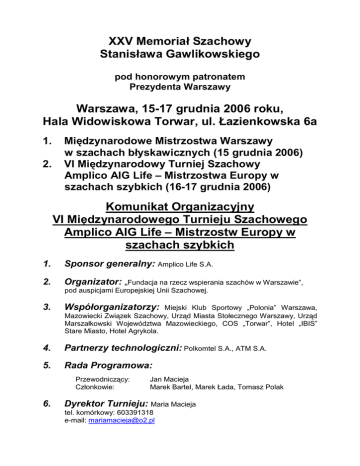 XXV Memoriał Szachowy Stanisława Gawlikowskiego pod honorowym patronatem Prezydenta Warszawy Warszawa, 15-17 grudnia 2006 roku, Hala Widowiskowa Torwar, ul. Łazienkowska 6a 1. 2. Międzynarodowe Mistrzostwa Warszawy w szachach błyskawicznych (15 grudnia 2006) VI Międzynarodowy Turniej Szachowy Amplico AIG Life – Mistrzostwa Europy w szachach szybkich (16-17 grudnia 2006) Komunikat Organizacyjny VI Międzynarodowego Turnieju Szachowego Amplico AIG Life – Mistrzostw Europy w szachach szybkich 1. Sponsor generalny: Amplico Life S.A. 2. Organizator: „Fundacja na rzecz wspierania szachów w Warszawie”, pod auspicjami Europejskiej Unii Szachowej. 3. Współorganizatorzy: 4. Partnerzy technologiczni: Polkomtel S.A., ATM S.A. 5. Rada Programowa: Miejski Klub Sportowy „Polonia” Warszawa, Mazowiecki Związek Szachowy, Urząd Miasta Stołecznego Warszawy, Urząd Marszałkowski Województwa Mazowieckiego, COS „Torwar”, Hotel „IBIS” Stare Miasto, Hotel Agrykola. Przewodniczący: Członkowie: 6. Jan Macieja Marek Bartel, Marek Łada, Tomasz Polak Dyrektor Turnieju: Maria Macieja tel. komórkowy: 603391318 e-mail: [email protected] Wicedyrektor Turnieju: Agnieszka Fornal – Urban e-mail: [email protected] 7. Sędzia główny: IA Tomasz Delega 8. Witryna internetowa: www.poloniachess.pl Z turnieju zostanie przeprowadzona transmisja on-line. 9. Termin i miejsce: 16-17.12.2006. , Hala Widowiskowa Torwar, ul Łazienkowska 6a, Warszawa 10. Warunki uczestnictwa: Zapisy do 4.12.2006.: • elektronicznie na adres: [email protected] • faksem: (22) 8876706 Wpisowe • juniorzy z rocznika 1992 lub młodsi: 40 zł lub 10 Euro • seniorzy z rocznika 1946 lub starsi: 40 zł lub 10 Euro • pozostali: 80 zł lub 20 Euro Wpisowe po terminie zgłoszeń (4.12.2006.): • juniorzy z rocznika 1992 lub młodsi: 60 zł lub 15 Euro • seniorzy z rocznika 1946 lub starsi: 60 zł lub 15 Euro • pozostali: 120 zł lub 30 Euro Uwaga: KaŜdy z zawodników zobowiązany jest do zgłoszenia się na przynajmniej dwa dni przed zawodami tj. do dnia 14.12.2006. Po tym terminie, organizator ma prawo odrzucić zgłoszenie zawodnika. 11. Opłaty: przelewem/przekazem do dnia 4.12.2006. na konto: Fundacja na rzecz wspierania szachów w Warszawie, bank: PEKAO S.A. XV O/Warszawa Nr 95124028871111001004853355 (proszę dokładnie wymienić, jakich zgłoszonych zawodników dotyczy opłata) w kasie Fundacji, ul. Konwiktorska 6, 00-206 Warszawa w godz. 10:00 – 15:00 do dnia 14.12.2006. w dniu 15.12.2006. w godz. 15:00 do 17:00 na sali gry w Hali Widowiskowej Torwar, ul Łazienkowska 6a, Warszawa (przed rozpoczęciem Międzynarodowych Mistrzostw Warszawy w Szachach Błyskawicznych) w dniu zawodów 16.12.2006. w godz. 8:00 do 9:00 na sali gry - opłata wyŜsza o 100% zawodnicy zagraniczni, pod warunkiem dokonania zgłoszenia do dnia 4.12.2006. , mogą dokonać opłaty wpisowego na sali gry w godz. 8:00 do 9:00 bez konieczności ponoszenia dodatkowych opłat bez opłat: medaliści Mistrzostw Europy w szachach szybkich 2005, zawodnicy z rankingiem ELO co najmniej 2600, zawodniczki z rankingiem ELO co najmniej 2400, pod warunkiem zachowania terminu zgłoszenia do 4.12.2006. 12. Weryfikacja uczestnictwa: Lista osób dopuszczonych do turnieju będzie systematycznie uaktualniana i publikowana na stronie internetowej www.poloniachess.pl , a ostateczna lista zawodników zostanie wywieszona do weryfikacji przez uczestników 16.12.2006. o godz. 9:15 na sali gry. Ewentualne poprawki do godz. 9:30. 13. System rozgrywek: Wszyscy zawodnicy rozegrają Turniej Eliminacyjny systemem szwajcarskim na dystansie 8 rund tempem P-15’+10” (15 minut na partię dla zawodnika z dodawaniem 10 sekund na kaŜde posunięcie). Po 8 rundzie i ewentualnych dogrywkach, 16 zawodników awansuje do Turnieju Finałowego, składającego się z 4 Turniejów Grupowych, Turniejów o miejsca 5-8, 9-12, 13-16, Półfinałów, Meczu o 3 miejsce i Finału. Pozostali zawodnicy rozegrają kolejnych 5 rund o zwycięstwo w Turnieju Szwajcarskim. Szczegóły systemu rozgrywek opisane zostały w Regulaminie Turnieju. 14. Terminarz zawodów: sobota 16.12.2006. (Turniej Eliminacyjny, osiem rund) 8.00 - 9.00 weryfikacja i zapisy 9.45 - pierwsza runda 11.00 – uroczyste rozpoczęcie Mistrzostw Europy 11.15 - druga runda 12.30 - trzecia runda 13.45 - czwarta runda 14.45 - 16.00 - przerwa obiadowa 16.00 - piąta runda 17.15 - szósta runda 18.30 - siódma runda 19.45 - ósma runda 21.00 - dogrywki o wejście do Turnieju Finałowego niedziela 17.12.2006. (Turniej Szwajcarski, pięć rund) 9.30 - dziewiąta runda 10.45 - dziesiąta runda 12.00 - jedenasta runda 13.15 - dwunasta runda 14:30 - trzynasta runda niedziela 17.12.2006. (Turniej Finałowy) 9.30 - Turnieje Grupowe (3 rundy) 12.30 - Półfinały i Turnieje o miejsca 5-16 14:30 Finał i Mecz o 3 miejsce 16:30 Zakończenie 15. Fundusz nagród – ogółem brutto 20.000 Euro W Turnieju Finałowym – fundusz 14.800 € za miejsce pierwsze za miejsce drugie za miejsce trzecie za miejsce czwarte za miejsce piąte za miejsce szóste za miejsce siódme za miejsce ósme za miejsce dziewiąte za miejsce dziesiąte za miejsce jedenaste za miejsce dwunaste za miejsce trzynaste za miejsce czternaste za miejsce piętnaste za miejsce szesnaste 4.000 € 2.000 € 1.000 € 900 € 850 € 800 € 750 € 700 € 650 € 600 € 550 € 500 € 450 € 400 € 350 € 300 € W Turnieju Szwajcarskim - fundusz 1.350 € za pierwsze miejsce (siedemnaste w ogólnej klasyfikacji) za drugie miejsce (osiemnaste w ogólnej klasyfikacji)) za trzecie miejsce (dziewiętnaste w ogólnej klasyfikacji) za czwarte miejsce (dwudzieste w ogólnej klasyfikacji) za piąte miejsce (dwudzieste pierwsze w ogólnej klasyfikacji) za szóste miejsce (dwudzieste drugie w ogólnej klasyfikacji) 350 € 300 € 250 € 200 € 150 € 100 € Nagrody specjalne – fundusz 3.750 € najlepsza kobieta najlepszy senior ur.1946 lub starszy najlepszy junior ur.1