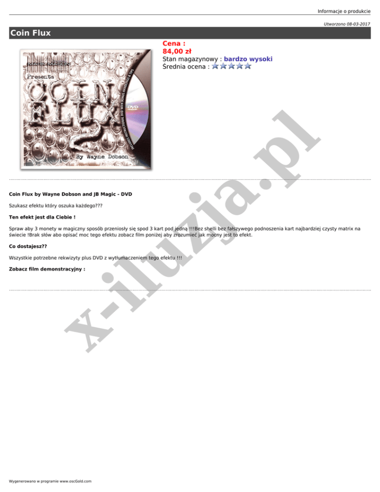 Informacje o produkcie Utworzono 08-03-2017 Coin Flux Cena : 84,00 zł Szukasz efektu który oszuka każdego??? Ten efekt jest dla Ciebie ! zj a Coin Flux by Wayne Dobson and JB Magic - DVD .p l Stan magazynowy : bardzo wysoki Średnia ocena : Spraw aby 3 monety w magiczny sposób przeniosły się spod 3 kart pod jedną !!!Bez shelli bez fałszywego podnoszenia kart najbardziej czysty matrix na świecie !Brak słów abo opisać moc tego efektu zobacz film poniżej aby zrozumieć jak mocny jest to efekt. Co dostajesz?? ilu Wszystkie potrzebne rekwizyty plus DVD z wytłumaczeniem tego efektu !!! x- Zobacz film demonstracyjny : Wygenerowano w programie www.oscGold.com