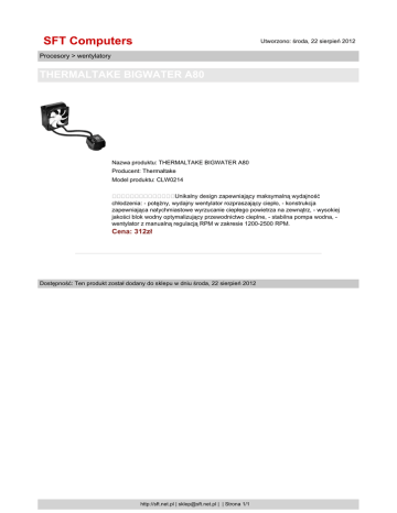 SFT Computers Utworzono: środa, 22 sierpień 2012 Procesory > wentylatory THERMALTAKE BIGWATER A80 Nazwa produktu: THERMALTAKE BIGWATER A80 Producent: Thermaltake Model produktu: CLW0214 Unikalny design zapewniający maksymalną wydajność chłodzenia: - potężny, wydajny wentylator rozpraszający ciepło, - konstrukcja zapewniająca natychmiastowe wyrzucanie ciepłego powietrza na zewnątrz, - wysokiej jakości blok wodny optymalizujący przewodnictwo cieplne, - stabilna pompa wodna, wentylator z manualną regulacją RPM w zakresie 1200-2500 RPM. Cena: 312zł Dostępność: Ten produkt został dodany do sklepu w dniu środa, 22 sierpień 2012 http://sft.net.pl | [email protected] | | Strona 1/1