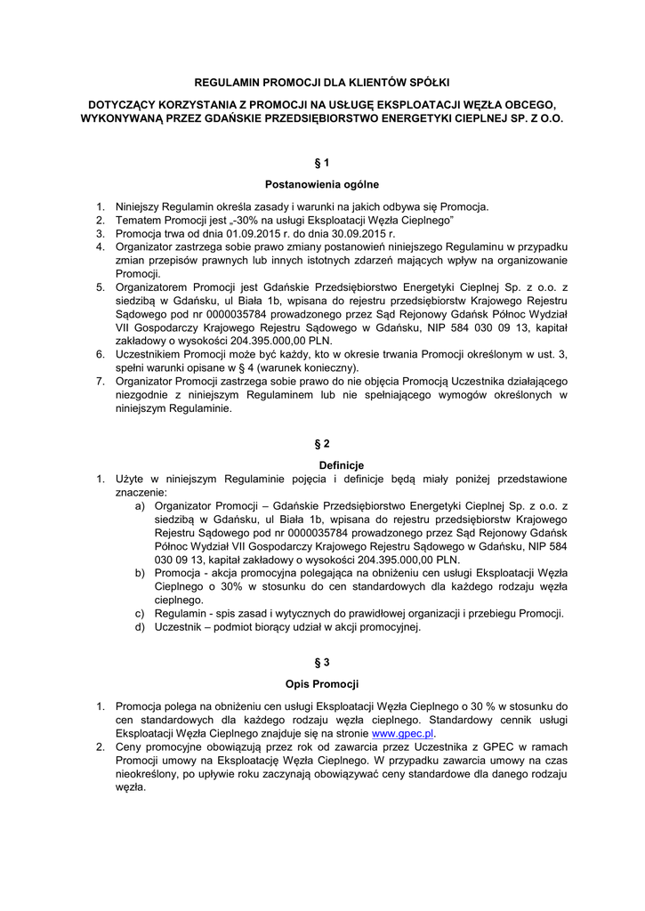 REGULAMIN PROMOCJI DLA KLIENTÓW SPÓŁKI DOTYCZĄCY KORZYSTANIA Z PROMOCJI NA USŁUGĘ EKSPLOATACJI WĘZŁA OBCEGO, WYKONYWANĄ PRZEZ GDAŃSKIE PRZEDSIĘBIORSTWO ENERGETYKI CIEPLNEJ SP. Z O.O. §1 Postanowienia ogólne Niniejszy Regulamin określa zasady i warunki na jakich odbywa się Promocja. Tematem Promocji jest „-30% na usługi Eksploatacji Węzła Cieplnego” Promocja trwa od dnia 01.09.2015 r. do dnia 30.09.2015 r. Organizator zastrzega sobie prawo zmiany postanowień niniejszego Regulaminu w przypadku zmian przepisów prawnych lub innych istotnych zdarzeń mających wpływ na organizowanie Promocji. 5. Organizatorem Promocji jest Gdańskie Przedsiębiorstwo Energetyki Cieplnej Sp. z o.o. z siedzibą w Gdańsku, ul Biała 1b, wpisana do rejestru przedsiębiorstw Krajowego Rejestru Sądowego pod nr 0000035784 prowadzonego przez Sąd Rejonowy Gdańsk Północ Wydział VII Gospodarczy Krajowego Rejestru Sądowego w Gdańsku, NIP 584 030 09 13, kapitał zakładowy o wysokości 204.395.000,00 PLN. 6. Uczestnikiem Promocji może być każdy, kto w okresie trwania Promocji określonym w ust. 3, spełni warunki opisane w § 4 (warunek konieczny). 7. Organizator Promocji zastrzega sobie prawo do nie objęcia Promocją Uczestnika działającego niezgodnie z niniejszym Regulaminem lub nie spełniającego wymogów określonych w niniejszym Regulaminie. 1. 2. 3. 4. §2 Definicje 1. Użyte w niniejszym Regulaminie pojęcia i definicje będą miały poniżej przedstawione znaczenie: a) Organizator Promocji – Gdańskie Przedsiębiorstwo Energetyki Cieplnej Sp. z o.o. z siedzibą w Gdańsku, ul Biała 1b, wpisana do rejestru przedsiębiorstw Krajowego Rejestru Sądowego pod nr 0000035784 prowadzonego przez Sąd Rejonowy Gdańsk Północ Wydział VII Gospodarczy Krajowego Rejestru Sądowego w Gdańsku, NIP 584 030 09 13, kapitał zakładowy o wysokości 204.395.000,00 PLN. b) Promocja - akcja promocyjna polegająca na obniżeniu cen usługi Eksploatacji Węzła Cieplnego o 30% w stosunku do cen standardowych dla każdego rodzaju węzła cieplnego. c) Regulamin - spis zasad i wytycznych do prawidłowej organizacji i przebiegu Promocji. d) Uczestnik – podmiot biorący udział w akcji promocyjnej. §3 Opis Promocji 1. Promocja polega na obniżeniu cen usługi Eksploatacji Węzła Cieplnego o 30 % w stosunku do cen standardowych dla każdego rodzaju węzła cieplnego. Standardowy cennik usługi Eksploatacji Węzła Cieplnego znajduje się na stronie www.gpec.pl. 2. Ceny promocyjne obowiązują przez rok od zawarcia przez Uczestnika z GPEC w ramach Promocji umowy na Eksploatację Węzła Cieplnego. W przypadku zawarcia umowy na czas nieokreślony, po upływie roku zaczynają obowiązywać ceny standardowe dla danego rodzaju węzła. §4 Warunki skorzystania z Promocji 1. Uczestnik może skorzystać z Promocji na usługę Eksploatacji Węzła Cieplnego pod warunkiem pozytywnej opinii, dotyczącej stanu technicznego węzła, potwierdzającej, że stan techniczny węzła spełnia aktualne wymogi prawne. Opinie wydaję pracownik Grupy GPEC. 2. Warunkiem udziału Uczestnika w Promocji jest: a) Kontakt telefoniczny lub e-mailowe do Biura Obsługi Klienta Organizatora Promocji. b) Przeprowadzenie wizji lokalnej węzła przez pracownika Organizatora Promocji do dnia 30.09.2015 r. c) Akceptacja stanu technicznego węzła przez pracownika Organizatora Promocji d) Podpisanie przez Uczestnika z GPEC w okresie trwania Promocji Umowy na Eksploatację węzła obcego na czas nieokreślony lub na okres jednego roku i dostarczenie jej do GPEC do dnia 15.10.2015 r. e) Z Promocji mogą skorzystać wyłącznie klienci Organizatora. 3. Kontakt telefoniczny z Biurem Obsługi Klienta, powinien zakończyć się ustaleniem konkretnej daty i miejsca wizji lokalnej przez pracownika Organizatora Promocji oraz przekazaniem przez Uczestnika wszelkich informacji potrzebnych do zawarcia umowy. 4. W przypadku, gdy zgłoszenie do Biura Obsługi Klienta Organizatora Promocji odbyło się do dnia 30.09.2015 r. jednak z przyczyn niezależnych od Uczestnika pracownik Organizatora Promocji nie może przeprowadzić wizji lokalnej do dnia 30.09.2015, należy ustalić z BOK taki termin wizji, aby zachować możliwość dostarczenia umowy do 15.10.2015. 5. W przypadku nie spełnienia warunków technicznych, o których mowa w pkt 1, Organizator ma prawo odmówić realizacji Promocji. §5 Postanowienia końcowe 1. Materiały reklamowo – promocyjne związane z Promocją mają jedynie charakter informacyjny. Wiążącą moc mają wyłącznie postanowienia niniejszego Regulaminu. 2. Regulamin Promocji dostępny będzie przez czas trwania Promocji w Biurze Obsługi Klienta Organizatora Promocji 3. Wszelkie ewentualne spory związane z niniejszym Regulaminem Promocji Strony będą starały się rozstrzygnąć polubownie. W przypadku gdyby nie doszło do porozumienia, spory rozstrzygane będą przez sąd właściwy zgodnie z przepisami kodeksu postępowania cywilnego.