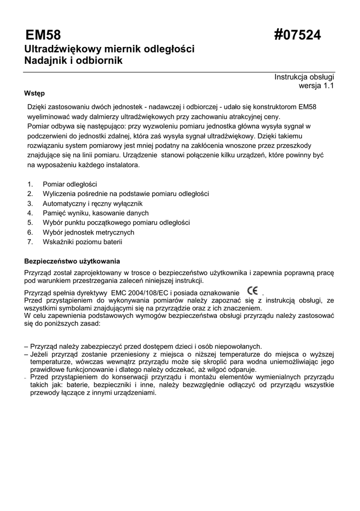 EM58 #07524 Ultradźwiękowy miernik odległości Nadajnik i odbiornik Instrukcja obsługi wersja 1.1 Wstęp Dzięki zastosowaniu dwóch jednostek - nadawczej i odbiorczej - udało się konstruktorom EM58 wyeliminować wady dalmierzy ultradźwiękowych przy zachowaniu atrakcyjnej ceny. Pomiar odbywa się następująco: przy wyzwoleniu pomiaru jednostka główna wysyła sygnał w podczerwieni do jednostki zdalnej, która zaś wysyła sygnał ultradźwiękowy. Dzięki takiemu rozwiązaniu system pomiarowy jest mniej podatny na zakłócenia wnoszone przez przeszkody znajdujące się na linii pomiaru. Urządzenie stanowi połączenie kilku urządzeń, które powinny być na wyposaŜeniu kaŜdego instalatora. 1. 2. 3. 4. 5. 6. 7. Pomiar odległości Wyliczenia pośrednie na podstawie pomiaru odległości Automatyczny i ręczny wyłącznik Pamięć wyniku, kasowanie danych Wybór punktu początkowego pomiaru odległości Wybór jednostek metrycznych Wskaźniki poziomu baterii Bezpieczeństwo uŜytkowania Przyrząd został zaprojektowany w trosce o bezpieczeństwo uŜytkownika i zapewnia poprawną pracę pod warunkiem przestrzegania zaleceń niniejszej instrukcji. . Przyrząd spełnia dyrektywy EMC 2004/108/EC i posiada oznakowanie Przed przystąpieniem do wykonywania pomiarów naleŜy zapoznać się z instrukcją obsługi, ze wszystkimi symbolami znajdującymi się na przyrządzie oraz z ich znaczeniem. W celu zapewnienia podstawowych wymogów bezpieczeństwa obsługi przyrządu naleŜy zastosować się do poniŜszych zasad: – Przyrząd naleŜy zabezpieczyć przed dostępem dzieci i osób niepowołanych. – JeŜeli przyrząd zostanie przeniesiony z miejsca o niŜszej temperaturze do miejsca o wyŜszej temperaturze, wówczas wewnątrz przyrządu moŜe się skroplić para wodna uniemoŜliwiając jego prawidłowe funkcjonowanie i dlatego naleŜy odczekać, aŜ wilgoć odparuje. – Przed przystąpieniem do konserwacji przyrządu i montaŜu elementów wymienialnych przyrządu takich jak: baterie, bezpieczniki i inne, naleŜy bezwzględnie odłączyć od przyrządu wszystkie przewody łączące z innymi urządzeniami. BUDOWA PRZYCISKI wykonanie pomiaru, przytrzymaj >2sek. aby wzbudzić tester po automatycznym wyłączeniu wyliczanie powierzchni i objętości dodawanie do siebie mierzonych odległości M1, M2, M3 zapisywanie i wyświetlanie zapamiętanych danych wyświetlanie wyniku obliczeń powierzchni lub objętości ustawianie punktu początkowego pomiaru ( przód lub tył testera) rys.1.odległość będzie mierzona z uwzględnieniem lub nie długości boku testera wybór jednostek (METER, YARD) przytrzymaj >2sek. aby wykasować bieŜący odczyt oraz wszystkie zapamiętane dane WYŚWIETLACZ indeks pracy obydwu modułów AREA – powierzchnia VOLUME – objętość LOW BATT - wskaźnik poziomu baterii M1 – odległość w pamięci M1 M2 – odległość w pamięci M2 M3 – odległość w pamięci M3 Oznaczenie punktów startowego pomiaru /przód, /tył Przełącznik wyboru L – dwa moduły, S – jeden moduł, OFF – wyłącznik. POMIARY 1. 2. 3. 4. 2 Włącz moduł główny, wybierz pozycję S lub L , wzbudzenie z czuwania naciśnij TEST/ON przez 2 sek.. Za kaŜdym razem po włączeniu modułu głównego na ekranie ukaŜe się przybliŜona temperatura otoczenia. Włącz moduł rozszerzeń przełącznikiem w pozycję ON zacznie pulsować zielona dioda LED. Naciśnij przycisk modułu głównego i ustaw punkt zerowy pomiaru. Aby wykasować wszystkie dane uŜyj przycisku UNIT/CLR przez >2sek.. Pomiar odległości: 1. UŜyj modułu głównego. JeŜeli tester jest w stanie czuwania naciśnij TEST/ON >2sek, ekran pokazuje przybliŜona temperaturę, zaczekaj 6sek., naciśnij dowolny przycisk aby opuścić tryb pomiaru temperatury. Trzymając detektor prostopadle do mierzonej powierzchni i naciśnij TEST/ON, odczytaj wynik. Stosowany do małych odległości 0,5 ÷ 18m 2. UŜyj dwóch modułów główny i rozszerzeń. Ustaw moduł rozszerzeń na wysokości > 1m od podłogi i włącz. Ustaw przełącznik w pozycji L., JeŜeli tester jest w stanie czuwania naciśnij TEST/ON >2sek, ekran pokazuje przybliŜoną temperaturę, zaczekaj 6sek., naciśnij dowolny przycisk aby opuścić tryb pomiaru temperatury. Naciśnij przycisk TEST/ON, odczytaj wynik. Stosowany do większych odległości 2 ÷ 50m Uwaga: symbol wyświetlany w przypadku błędu, sprawdź ostatnie operacje. Obliczanie powierzchni lub objętości 1. 2. Naciśnij i przytrzymaj aby usunąć poprzednie wyniki pomiarów. Naciśnij aby dokonać pomiaru, następnie naciśnij i przytrzymaj M1 aby zapisać uzyskany wynik. Na wyświetlaczu pojawi się symbol M1. Powtórz czynności aby uzyskać wyniki kolejnych pomiarów. Aby obliczyć powierzchnię naciśnij kolejno M1 -> X -> M2 -> = Postępując analogicznie moŜemy uzyskać wyniki obliczeń powierzchni lub objętości dla pozostałych zapamiętanych pomiarów. 3. Dodawanie odległości Metoda 1 1. Naciśnij i przytrzymaj 2. Naciśnij aby dokonać pomiaru, a następnie naciśnij przycisk aby dodać kolejne pomiary. aby usunąć poprzednie wyniki pomiarów. , powtórz czynność Metoda 2 1. Naciśnij i przytrzymaj 2. Naciśnij aby usunąć poprzednie wyniki pomiarów. 3. Naciśnij aby dokonać drugiego pomiaru, naciśnij M2 a następnie wyświetlaczu pojawi się suma pierwszego i drugiego pomiaru. . Na 4. Naciśnij aby dokonać trzeciego pomiaru, naciśnij M3 a następnie wyświetlaczu pojawi się suma pierwszego, drugiego i trzeciego pomiaru. . Na aby dokonać pierwszego pomiaru, naciśnij M1 a następnie Wymiana baterii Wyczerpanie się baterii w module głównym sygnalizowane jest symbolem na wyświetlaczu przyrządu. W celu wymiany baterii naleŜy wyłączyć zasilanie urządzenia a następnie otworzyć pokrywę baterii. Wyjąć zuŜytą baterię i zastąpić ją nową – 9V F622 (zwracając szczególną uwagę na polaryzację). 3 Wyczerpanie się baterii w module rozszerzeń sygnalizowane je