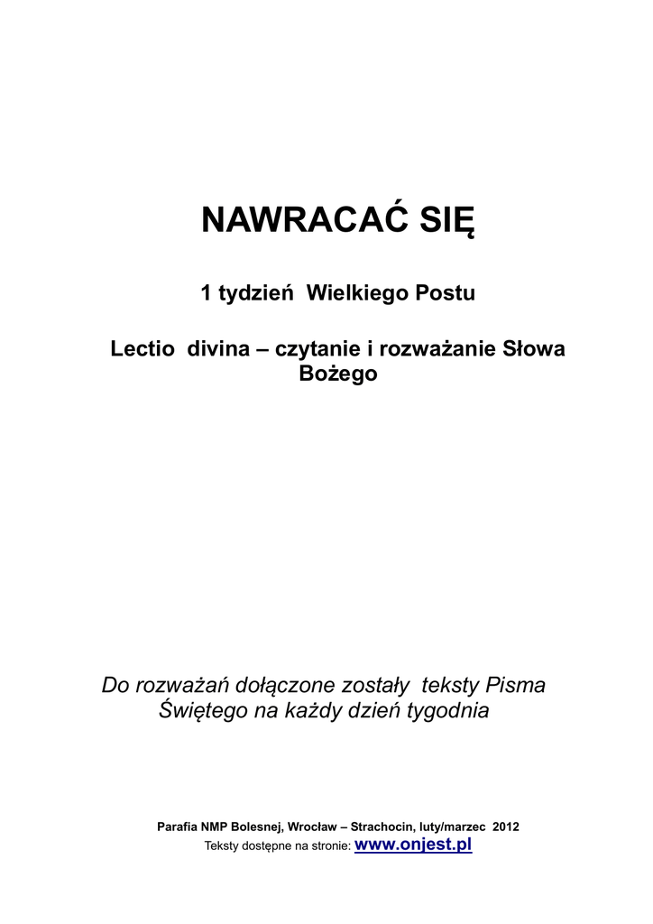 NAWRACAĆ SIĘ 1 tydzień Wielkiego Postu Lectio divina – czytanie i rozważanie Słowa Bożego Do rozważań dołączone zostały teksty Pisma Świętego na każdy dzień tygodnia Parafia NMP Bolesnej, Wrocław – Strachocin, luty/marzec 2012 Teksty dostępne na stronie: www.onjest.pl Opracowanie: Jolanta Prokopiuk, Dariusz Trocha, Wojciech Doliński, Monika Zimecka Korekta: Jerzy Prokopiuk Lectio divina - metoda osobistego studium Pisma Świętego Mnisi znali dwa sposoby medytacji Słowa Bożego: ruminatio – przetrawianie Słowa Bożego poprzez jego ciągłe powtarzanie oraz lectio divina– Bożą lekturę, czytanie Pisma Świętego. Ukształtowana była przez duchową egzegezę Pisma Świętego. Chodziło w niej o to, że wszystkie słowa Biblii rozumiem jako drogę do Boga, jako opis drogi duchowej. Chodzi tu raczej o pytanie: kim jestem, co jest tajemnicą mojego życia, kim i czym stałem się dzięki Jezusowi Chrystusowi? Kiedy bowiem poprzez medytację poczuję, kim jestem, zmieni się także moje działanie w świecie. Kilka uwag o miejscu modlitwy, czasie oraz pozycji modlitewnej. Miejsce – Idealne to kościół czy kaplica z wystawionym Najświętszym Sakramentem. W praktyce będzie to każde miejsce, w którym znajdziemy choć odrobinę wyciszenia. Czas – Przynajmniej kwadrans. Dobrze jeśli będzie to pół godziny. Pora dnia nie jest istotna, ważne tylko, byśmy byli przytomni i w czasie modlitwy nie zasnęli. Pozycja w czasie modlitwy. Godna i wygodna. Można w tej modlitwie klęczeć, można siedzieć na małej ławeczce, można też zwyczajnie usiąść na wygodnym krześle przy stole. Przebieg lectio divina– Istotą tej metody jest jej podział na: I. II. III. Czytanie (lectio) Medytację (meditatio) Modlitwę (oratio) Całość poprzedzona być powinna chwilą wyciszenia, skupienia, prośbą skierowaną do Ducha Świętego o dobre owoce. Na zakończenie powinniśmy podziękować Bogu oraz dokonać refleksji nad naszą modlitwą – jak się czuliśmy, co było dobre w tej modlitwie a co należałoby w niej poprawić w przyszłości. Czytanie (lectio) wybieramy dłuższy fragment tekstu – przynajmniej jeden rozdział. Nie zakładamy, że przeczytamy go w całości. Może się zdarzyć, że już pierwszy werset będzie tym fragmentem nad którym powinniśmy zatrzymać się dłużej. Czytam Pismo Święte powoli i uważnie, nie po to, by pomnożyć swoją wiedzę, lecz by spotkać Boga w Jego Słowie. W czytaniu chodzi bowiem o znalezienie takiego fragmentu (zwykle będzie to jeden werset), który nas poruszy. To poruszenie może mieć bardzo różny charakter. Może to być ciekawość, niezrozumienie, pociecha, piękno, niepokój. Poruszenie jest świadectwem, że ten werset jest dla nas osobiście ważny. Bardzo ważną informacją jest złość lub agresja rodząca się podczas czytania Słowa Bożego. Oznacza ona bowiem, że Jezus w Słowie Bożym dotyka naszej nieuporządkowanej dziedzina życia. Jest bardzo istotne zwrócenie uwagi na uczucia, które nam towarzyszą. Nie mamy wpływu na uczucia, które się rodzą. Są ważne ponieważ, ukazują nam one stan naszego serca. Nie ma uczuć dobrych i złych, ponieważ są one obojętne moralnie. Jeżeli rodzi się uczucie zazdrości lub niechęci to nie jest to grzechem. Materią grzechu będzie dopiero nasza odpowiedź na to uczucie. Znalezienie tekstu, który porusza jest sygnałem , że kończy się etap “lectio”. Medytacja (Meditatio) – Pierwotne, łacińskie znaczenie tego słowa to „powtarzanie”. W tej części koncentrujemy się na znalezionym urywku. Czytamy go wielokrotnie , powoli, jakby smakując – całość wersetu lub jego fragmenty. Czytając możemy akcentować różne części i wyrazy wersetu. Prawdopodobnie nauczymy się w ten sposób wersetu na pamięć. Powtarzajmy go zatem także w myśli – może nam pomóc zamknięcie oczu. Angażujmy na tym etapie nie tylko rozum ale także i serce. Modlitwa (Oratio) – Na pewnym etapie medytacji zamienia się ona w modlitwę. Będzie ona miała spontaniczny charakter. Czasami będzie to nasza aktywność, ale możemy też być „porwani” przez Boże natchnienie. Wtedy modlitwa stanie się bardziej działaniem Boga w nas niż naszym działaniem. Trudno przewidzieć, co przyniesie modlitwa, jaki dokładnie charakter i kierunek przybierze. Może to być zarówno przebłaganie, prośba jak i dziękczynienie i uwielbienie. Może mieć także charakter krótkiej, żarliwej modlitwy, proszącej Boga, by ukoił moja tęsknotę, by pozwolił się doświadczyć i ujrzeć. Warto wypowiedzieć się przed obliczem Boga osobiście, rozmawiając o swoich reakcjach - radościach skłaniających do uwielbienia, ale także o tym, co może trapić, powodować zawstydzenie czy wręcz poczucie bezsilności. 26.02.2012, niedziela NAWRACAĆ SIĘ TO UWIERZYĆ W EWANGELIĘ Wyciszenie Zapraszaj Ducha Świętego, aby On prowadził modlitwę Lectio (czytanie) Mk 1,12-15 Przeczytaj wybrany fragment Słowa Bożego. Zatrzymaj się na wersecie, który Cię poruszył. Rozważanie: ''Zaraz też Duch wyprowadził Go na pustynię,gdzie przez czterdzieści dni był kuszony przez szatana''. W Jezusie ujawnia się cała walka duchowa, jakiej każdy człowiek doświadcza w swoim życiu. Jezus pokonał kusiciela mocą Ducha Świętego, który na Niego zstąpił. Ciebie też Duch Święty chce wyprowadzić na pustynię codziennej modlitwy i zachęcić do chociażby małej ofiary, rezygnacji z czegoś dla Boga. Pokusa wiąże się z wiarą w to, że są rzeczy lepsze niż przyjaźń z Bogiem, że jest inne dobro niż sam Bóg. Pokusa przynosi jednak rozczarowanie, okrada nas, obnaża i upokarza. Czy wierzysz w to, że nie ma innego dobra poza Bogiem i że tylko On jest godzien uwielbienia? ''Przebywał tam wśród dzikich zwierząt, a aniołowie Mu służyli.''Jezus wchodził w świat mocy zła, by je ostatecznie pokonać. W przeciwieństwie do szatana aniołowie usługiw