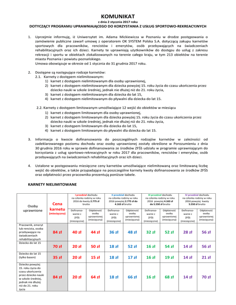 KOMUNIKAT z dnia 2 stycznia 2017 roku DOTYCZĄCY PROGRAMU UPRAWNIAJĄCEGO DO KORZYSTANIA Z USŁUG SPORTOWO-REKREACYJNYCH 1. Uprzejmie informuję, iż Uniwersytet im. Adama Mickiewicza w Poznaniu w drodze postępowania o zamówienie publiczne zawarł umowę z operatorem OK SYSTEM Polska S.A. dotyczącą zakupu karnetów sportowych dla pracowników, rencistów i emerytów, osób przebywających na świadczeniach rehabilitacyjnych oraz ich dzieci. Karnety te uprawniają użytkowników do dostępu do usług z zakresu rekreacji i sportu w obiektach zlokalizowanych na terenie całego kraju, w tym 213 obiektów na terenie miasta Poznania i powiatu poznańskiego. Umowa obowiązuje w okresie od 1 stycznia do 31 grudnia 2017 roku. 2. Dostępne są następujące rodzaje karnetów: 2.1. Karnety z dostępem nielimitowanym: 1) karnet z dostępem nielimitowanym dla osoby uprawnionej, 2) karnet z dostępem nielimitowanym dla dziecka powyżej 15. roku życia do czasu ukończenia przez dziecko nauki w szkole średniej, jednak nie dłużej niż do 21. roku życia, 3) karnet z dostępem nielimitowanym dla dziecka do lat 15, 4) karnet z dostępem nielimitowanym do pływalni dla dziecka do lat 15. 2.2. Karnety z dostępem limitowanym umożliwiające 12 wejść do obiektów w miesiącu 1) karnet z dostępem limitowanym dla osoby uprawnionej, 2) karnet z dostępem limitowanym dla dziecka powyżej 15. roku życia do czasu ukończenia przez dziecko nauki w szkole średniej, jednak nie dłużej niż do 21. roku życia, 3) karnet z dostępem limitowanym dla dziecka do lat 15, 4) karnet z dostępem limitowanym do pływalni dla dziecka do lat 15. 3. Informacja o kwocie dofinansowania do poszczególnych rodzajów karnetów w zależności od zadeklarowanego poziomu dochodu oraz osoby uprawnionej zostały określone w Porozumieniu z dnia 30 grudnia 2016 roku w sprawie dofinansowania ze środków ZFŚS udziału w programie uprawniającym do korzystania z usług sportowo-rekreacyjnych w roku 2017 dla pracowników, rencistów i emerytów, osób przebywających na świadczeniach rehabilitacyjnych oraz ich dzieci. 4. Ustalone w postępowaniu miesięczne ceny karnetów umożliwiające nielimitowaną oraz limitowaną liczbę wejść do obiektów, a także przypadające na poszczególne karnety kwoty dofinansowania ze środków ZFŚS oraz odpłatności przez pracownika prezentują poniższe tabele. KARNETY NIELIMITOWANE Osoby uprawnione Pracownik, emeryt lub rencista, osoba przebywające na świadczeniach rehabilitacyjnych Dziecko do lat 15 Dziecko do lat 15 (tylko basen) Dziecko powyżej 15. roku życia do czasu ukończenia przez dziecko nauki w szkole średniej, jednak nie dłużej niż do 21. roku życia Cena karnetu I przedział dochodu na członka rodziny w roku 2016 do kwoty 2.775 zł brutto II przedział dochodu na członka rodziny w roku 2016 powyżej 2.775 zł do 4.163 zł brutto III przedział dochodu na członka rodziny w roku 2016 powyżej 4.163 zł do 5.550 zł brutto IV przedział dochodu na członka rodziny w roku 2016 powyżej kwoty 5.550 zł brutto Dofinansowanie z ZFŚS (miesięczne) Odpłatność osoby uprawnionej (miesięczna) Dofinansowanie z ZFŚS (miesięczne) Odpłatność osoby uprawnionej (miesięczna) Dofinansowanie z ZFŚS (miesięczne) Odpłatność osoby uprawnionej (miesięczna) Dofinansowanie z ZFŚS (miesięczne) Odpłatność osoby uprawnionej (miesięczna) 84 zł 40 zł 44 zł 36 zł 48 zł 32 zł 52 zł 28 zł 56 zł 70 zł 20 zł 50 zł 18 zł 52 zł 16 zł 54 zł 14 zł 56 zł 35 zł 20 zł 15 zł 18 zł 17 zł 16 zł 19 zł 14 zł 21 zł 84 zł 20 zł 64 zł 18 zł 66 zł 16 zł 68 zł 14 zł 70 zł (miesięczna) KARNETY Z LIMITOWANĄ LICZBĄ WEJŚĆ (12 RAZY W MIESIĄCU) Osoby uprawnione Cena karnetu Dziecko do lat 15 (tylko basen) Dziecko powyżej 15. roku życia do czasu ukończenia przez dziecko nauki w szkole średniej, jednak nie dłużej niż do 21. roku życia II przedział dochodu na członka rodziny w roku 2016 powyżej 2.775 zł do 4.163 zł brutto III przedział dochodu na członka rodziny w roku 2016 powyżej 4.163 zł do 5.550 zł brutto IV przedział dochodu na członka rodziny w roku 2016 powyżej kwoty 5.550 zł brutto Dofinansowanie z ZFŚS (miesięczne) Odpłatność osoby uprawnionej (miesięczna) Dofinansowanie z ZFŚS (miesięczne) Odpłatność osoby uprawnionej (miesięczna) Dofinansowanie z ZFŚS (miesięczne) Odpłatność osoby uprawnionej (miesięczna) Dofinansowanie z ZFŚS (miesięczne) Odpłatność osoby uprawnionej (miesięczna) 64 zł 40 zł 24 zł 36 zł 28 zł 32 zł 32 zł 28 zł 36 zł 60 zł 20 zł 40 zł 18 zł 42 zł 16 zł 44 zł 14 zł 46 zł 30 zł 20 zł 10 zł 18 zł 12 zł 16 zł 14 zł 14 zł 16 zł 64 zł 20 zł 44 zł 18 zł 46 zł 16 zł 48 zł 14 zł 50 zł (miesięczna) Pracownik, emeryt lub rencista, osoba przebywające na świadczeniach rehabilitacyjnych Dziecko do lat 15 I przedział dochodu na członka rodziny w roku 2016 do kwoty 2.775 zł brutto 5. Przystąpienie do programu jest możliwe od dnia 20 stycznia 2017 roku, a w następnych miesiącach 2017 roku od pierwszego kalendarzowego dnia miesiąca. Odpłatność karnetu wykupionego na miesiąc styczeń będzie wynosiła wartość karnetu proporcjonalnie do ilości dni, w których był on aktywny (12 dni licząc od 20 do 31 stycznia br.). 6. Składanie wniosków i rezygnacja z uczestnictwa w Programie: 6.1. Pracownicy zainteresowani skorzystaniem z oferty składają wnioski o przystąpienie do programu i przyznanie dofinansowania, a także o ewentualną rezygnację z programu w formie elektronicznej poprzez formularz dostępny w aplikacji AMU_RAP. Z uwagi na wymogi przepisów prawa, dla skutecznego złożenia wniosku wymagane jest dosłanie do Działu Socjalnego podpisanego przez pracownika Wniosku wraz z załącznikami (oświadczenia: Zgoda na przetwarzanie danych osobowych oraz Akceptacja Regulaminu dla użytkowników kart) sporządzonego w systemie AMU_RAP. 6.2. Emeryci i renci