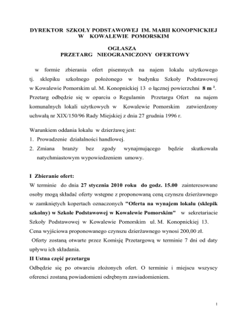 DYREKTOR SZKOŁY PODSTAWOWEJ IM. MARII KONOPNICKIEJ W KOWALEWIE POMORSKIM OGŁASZA PRZETARG NIEOGRANICZONY OFERTOWY w formie zbierania ofert pisemnych na najem lokalu użytkowego tj. sklepiku szkolnego położonego w budynku Szkoły Podstawowej w Kowalewie Pomorskim ul. M. Konopnickiej 13 o łącznej powierzchni 8 m 2. Przetarg odbędzie się w oparciu o Regulamin komunalnych lokali użytkowych w Przetargu Ofert Kowalewie Pomorskim na najem zatwierdzony uchwałą nr XIX/150/96 Rady Miejskiej z dnia 27 grudnia 1996 r. Warunkiem oddania lokalu w dzierżawę jest: 1. Prowadzenie działalności handlowej. 2. Zmiana branży bez zgody wynajmującego będzie skutkowała natychmiastowym wypowiedzeniem umowy. I Zbieranie ofert: W terminie do dnia 27 stycznia 2010 roku do godz. 15.00 zainteresowane osoby mogą składać oferty wstępne z proponowaną ceną czynszu dzierżawnego w zamkniętych kopertach oznaczonych "Oferta na wynajem lokalu (sklepik szkolny) w Szkole Podstawowej w Kowalewie Pomorskim" w sekretariacie Szkoły Podstawowej w Kowalewie Pomorskim ul. M. Konopnickiej 13. Cena wyjściowa proponowanego czynszu dzierżawnego wynosi 200,00 zł. Oferty zostaną otwarte przez Komisję Przetargową w terminie 7 dni od daty upływu ich składania. II Ustna część przetargu Odbędzie się po otwarciu złożonych ofert. O terminie i miejscu wszyscy oferenci zostaną powiadomieni odrębnym zawiadomieniem. 1 Cenę wywoławczą w części ustnej przetargu stanowić będzie najwyższa cena dzierżawy wyżej wymienionego gabinetu zaproponowana w złożonych ofertach. Oferta winna zawierać: • kserokopię wpisu do ewidencji działalności gospodarczej lub Krajowego Rejestru Sądowego, • datę sporządzenia oferty, • oferowaną miesięczną cenę za wynajem całego lokalu stanowiący przedmiot przetargu, • termin rozpoczęcia działalności - niedotrzymanie terminu skutkować będzie natychmiastowym wypowiedzeniem umowy, • kopię dowodu wpłaty wadium, • oświadczenie, że oferent zapoznał się z postanowieniami projektu umowy i na takich warunkach ją podpisze oraz Regulaminem Przetargu Ofert na najem komunalnych lokali użytkowych w Kowalewie Pomorskim. Oferent zobowiązany jest do wpłacenia na konto Urzędu Miejskiego w Kowalewie Pomorskim Bank Spółdzielczy Kowalewo Pomorskie Nr 53 9496 0008 0000 1720 2000 0045 do dnia 27 stycznia 2010 roku do godz. 14.30 kwoty wadium proponowanego miesięcznego czynszu przez oferenta o najem, którego się ubiega. W przypadku wygrania przetargu wadium będzie stanowić część kaucji zabezpieczającej. W celu zapoznania się z aktualnym stanem lokalu oraz funkcjonowaniem i kosztami utrzymania go należy kontaktować się z Dyrektorem Szkoły 2 Podstawowej w Kowalewie Pomorskim p. Benedyktem Mrozińskim tel. (056) 6841058 lub 606637317. Z projektem umowy można zapoznać się w sekretariacie Szkoły Podstawowej w Kowalewie Pomorskim. Dyrektor Szkoły Podstawowej w Kowalewie Pomorskim zastrzega sobie prawo odstąpienia od przetargu bez podania przyczyny. Benedykt Mroziński Dyrektor Szkoły 3