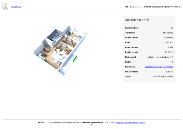 luk.net.pl Tel.: 81 532 34 11, E-mail: [email protected] Mieszkanie nr 26 Numer lokalu 26 Typ lokalu Mieszkalny Status lokalu Sprzedane Cena 385 000 Cena za metr 4 699 Powierzchnia 81.94 m2 Ilość pokoi 4 pokoje + aneks kuchenny(4) Piętro Inwestycja 1 Budynki mieszkalne - ul. Wróbla Data oddania Adres Tel.: 81 532 34 11, E-mail: [email protected], Dokument wygenerowano 8.3.2017, 13:44, http://luk.net.pl/-mieszkanie-nr-26.htm 1 2015-10 ul. Wróbla 66, Lublin luk.net.pl Tel.: 81 532 34 11, E-mail: [email protected] RZUT TECHNICZNY LOKALU Tel.: 81 532 34 11, E-mail: [email protected], Dokument wygenerowano 8.3.2017, 13:44, http://luk.net.pl/-mieszkanie-nr-26.htm 2 Tel.: 81 532 34 11, E-mail: [email protected] luk.net.pl OPIS INWESTYCJI Inwestycja budynków mieszkalnych przy ulicy Gęsiej jest świetnym rozwiązaniem dla młodych osób. Inwestycja znajduje się na młodym osiedlu, gdzie większość osób mieszkających stanowią młode rodziny z dziećmi. Co więcej, inwestycja znajduje się bardzo blisko sklepu spożywczego sieci „Biedronka” oraz dużych centrów handlowych jak „Selgros” czy „Agata Meble”. Bardzo blisko inwestycji znajduje się również stacja benzynowa „Orlen” oraz trochę dalej „Tesco” - otwarte całodobowo. Około 5 minut jazdy samochodem znajduje się Szkoła Podstawowa nr 50. Na osiedlu zaś funkcjonuje przedszkole. Dla osób niezmotoryzowanych powinien być również istotny fakt, że od inwestycji najbliższy przystanek jest oddalony o 5 minut drogi pieszo. Z przystanku bez problemu można dostać się jednym autobusem do centrum miasta. Nic dziwnego, że w Tej inwestycji mieszkania rozeszły się jak ciepłe bułeczki. Pozostało nam tylko kilka dostępnych mieszkań. Nie warto zwlekać. Zapraszamy do kontaktu z Naszym biurem. SZCZEGÓŁY Budynek B1, ul. Wróbla 66 Budynki mieszkalne, Gęsia II Mieszkań: 52 Lokali usługowych: 6 Data rozpoczęcia budowy: 04-2014 I KLATKA - 25 MIESZKAŃ, 3 LOKALE Data zakończenia budowy: 09-2015 USŁUGOWE Liczba budynków 2 II KLATKA - 12 MIESZKAŃ, 3 LOKALE Liczba lokali 111 USŁUGOWE Całkowita powierzchnia lokali III KLATKA - 15 MIESZKAŃ 6066.94 m2 GARAŻ PODZIEMNY - 54 MIEJSC Budynek B2, ul. Wróbla 68 Mieszkań: 52 Lokali usługowych: 1 I KLATKA - 34 MIESZKAŃ II KLATKA - 18 MIESZKAŃ GARAŻ PODZIEMNY - 52 MIEJSC POSTOJOWYCH POSTOJOWYCH Tel.: 81 532 34 11, E-mail: [email protected], Dokument wygenerowano 8.3.2017, 13:44, http://luk.net.pl/-mieszkanie-nr-26.htm 3 luk.net.pl Tel.: 81 532 34 11, E-mail: [email protected] LOKALIZACJA Tel.: 81 532 34 11, E-mail: [email protected], Dokument wygenerowano 8.3.2017, 13:44, http://luk.net.pl/-mieszkanie-nr-26.htm 4