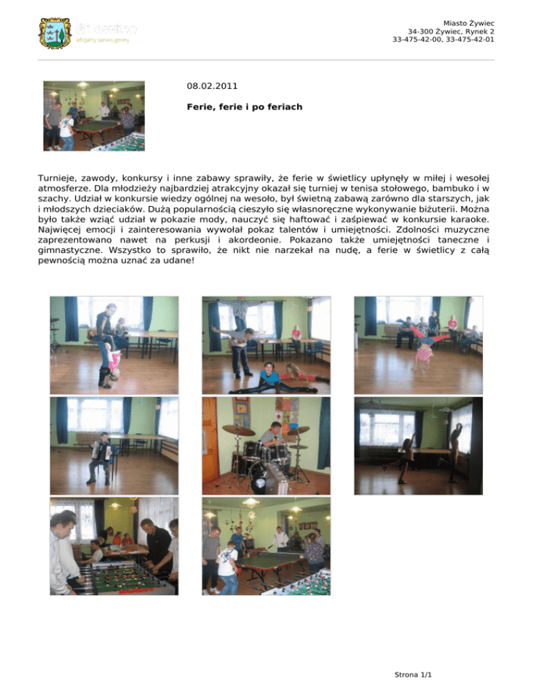 Miasto Żywiec 34-300 Żywiec, Rynek 2 33-475-42-00, 33-475-42-01 08.02.2011 Ferie, ferie i po feriach Turnieje, zawody, konkursy i inne zabawy sprawiły, że ferie w świetlicy upłynęły w miłej i wesołej atmosferze. Dla młodzieży najbardziej atrakcyjny okazał się turniej w tenisa stołowego, bambuko i w szachy. Udział w konkursie wiedzy ogólnej na wesoło, był świetną zabawą zarówno dla starszych, jak i młodszych dzieciaków. Dużą popularnością cieszyło się własnoręczne wykonywanie biżuterii. Można było także wziąć udział w pokazie mody, nauczyć się haftować i zaśpiewać w konkursie karaoke. Najwięcej emocji i zainteresowania wywołał pokaz talentów i umiejętności. Zdolności muzyczne zaprezentowano nawet na perkusji i akordeonie. Pokazano także umiejętności taneczne i gimnastyczne. Wszystko to sprawiło, że nikt nie narzekał na nudę, a ferie w świetlicy z całą pewnością można uznać za udane! Strona 1/1 Powered by TCPDF (www.tcpdf.org)