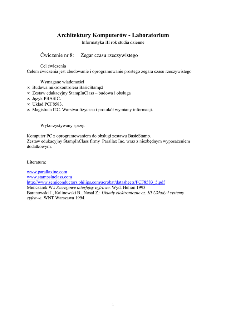 Architektury Komputerów - Laboratorium Informatyka III rok studia dzienne Ćwiczenie nr 8: Zegar czasu rzeczywistego Cel ćwiczenia Celem ćwiczenia jest zbudowanie i oprogramowanie prostego zegara czasu rzeczywistego • • • • • Wymagane wiadomości Budowa mikrokontrolera BasicStamp2 Zestaw edukacyjny StampInClass – budowa i obsługa Język PBASIC. Układ PCF8583. Magistrala I2C. Warstwa fizyczna i protokół wymiany informacji. Wykorzystywany sprzęt Komputer PC z oprogramowaniem do obsługi zestawu BasicStamp. Zestaw edukacyjny StampInClass firmy Parallax Inc. wraz z niezbędnym wyposaŜeniem dodatkowym. Literatura: www.parallaxinc.com www.stampsinclass.com http://www.semiconductors.philips.com/acrobat/datasheets/PCF8583_5.pdf Mielczarek W.: Szeregowe interfejsy cyfrowe. Wyd. Helion 1993 Baranowski J., Kalinowski B., Nosal Z.: Układy elektroniczne cz. III Układy i systemy cyfrowe. WNT Warszawa 1994. 1 Układ PCF 8583 jest znany z zastosowania jako pamięć RAM o pojemności 256 bajtów. Przy odpowiedniej aplikacji moŜe on zostać wykorzystany jako układ zegara z kalendarzem Pierwsze 16 bajtów pamięci w tym trybie pełni funkcje rejestrów układu zegara. Procedury obsługi układu w trybie zegara nie róŜnią się od procedur obsługi w trybie pracy jako pamięć. Jedynym zadaniem jest zatem zaprogramowanie odpowiednich funkcji w odpowiednich rejestrach, ustawienie zegara na aktualny czas, kalendarza na aktualna datę, i okresowa aktualizacja jego wskazań. 1 Układ pracy. Odłączyć układ prototypowy od zasilania ! Na podstawie informacji zawartych w instrukcji do poprzedniego ćwiczenia zbudować układ taki jak do pracy układu PCF8583 w trybie pamięci (moŜna wykorzystać jeśli nie został rozmontowany układ z poprzedniego ćwiczenia) Do niewykorzystywanych w poprzednim ćwiczeniu wyprowadzeń OSCI i OSCO podłączyć rezonator kwarcowy o częstotliwości 32768 Hz. Ze względu na delikatność wyprowadzeń rezonatora, jego montaŜ naleŜy przeprowadzić z duŜą delikatnością i ostroŜnością. Po sprawdzeniu układu połączeń przez prowadzącego moŜna podłączyć zasilanie 2 Przygotowanie programu Zadanie A Na podstawie dokumentacji układu PCF8583 przygotować odpowiednie wartości jakie wpisać do poszczególnych rejestrów aby pracował jako zegar w trybie 24 godzinnym , wskazywał aktualną godzinę oraz datę. Dysponując gotowymi procedurami z poprzedniego ćwiczenia zaprogramować nastawy zegara i uruchomić zegar. Zadanie B Przygotować program, który będzie pobierał aktualne wskazania godziny i daty i wyświetlał je w oknie debugera . Zadanie C Na podstawie dokumentacji zaimplementować funkcje alarmu. Do sygnalizacji stanu alarmu wykorzystać diodę LED podłączoną za pośrednictwem rezystora 200ohm do wyprowadzenia INT układu PCF8583. 2