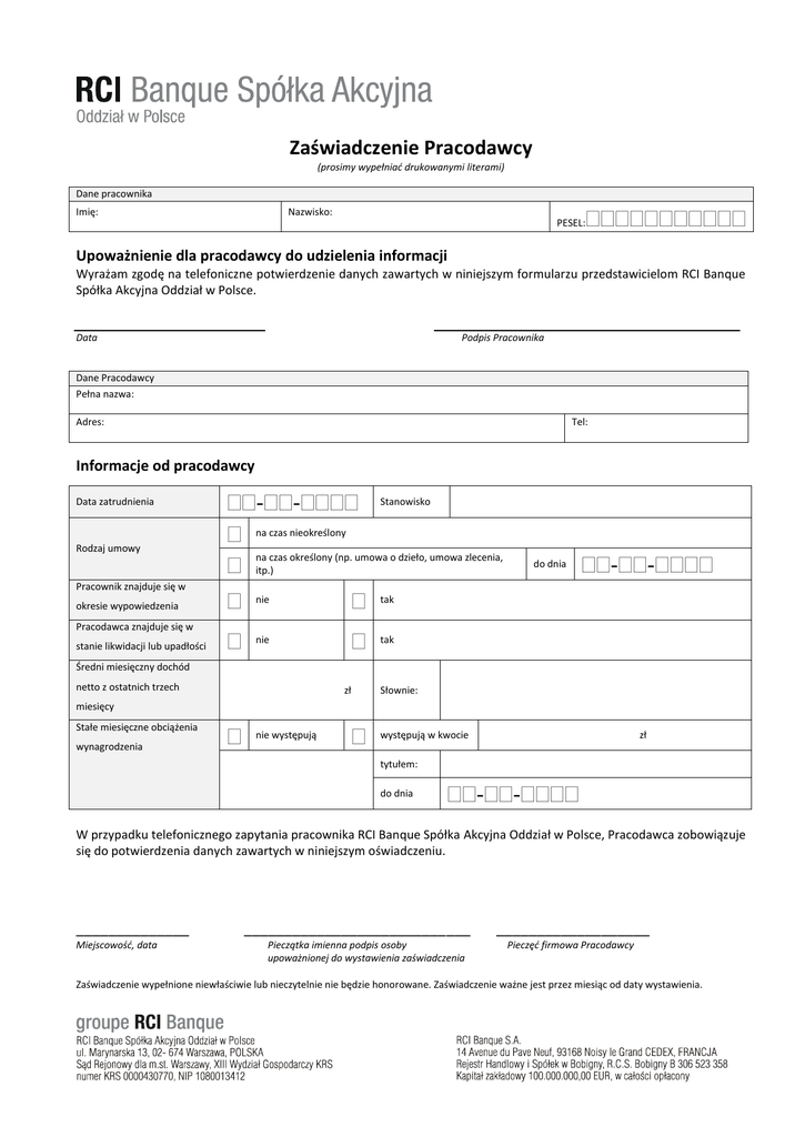Zaświadczenie Pracodawcy (prosimy wypełniać drukowanymi literami) Dane pracownika Imię: Nazwisko: PESEL: Upoważnienie dla pracodawcy do udzielenia informacji Wyrażam zgodę na telefoniczne potwierdzenie danych zawartych w niniejszym formularzu przedstawicielom RCI Banque Spółka Akcyjna Oddział w Polsce. Data Podpis Pracownika Dane Pracodawcy Pełna nazwa: Adres: Tel: Informacje od pracodawcy Data zatrudnienia Rodzaj umowy Pracownik znajduje się w okresie wypowiedzenia Pracodawca znajduje się w stanie likwidacji lub upadłości -- Stanowisko na czas nieokreślony na czas określony (np. umowa o dzieło, umowa zlecenia, itp.) nie tak nie do dnia -- tak Średni miesięczny dochód netto z ostatnich trzech zł Słownie: miesięcy Stałe miesięczne obciążenia wynagrodzenia nie występują występują w kwocie zł tytułem: do dnia -- W przypadku telefonicznego zapytania pracownika RCI Banque Spółka Akcyjna Oddział w Polsce, Pracodawca zobowiązuje się do potwierdzenia danych zawartych w niniejszym oświadczeniu. ______________ Miejscowość, data ____________________________ Pieczątka imienna podpis osoby upoważnionej do wystawienia zaświadczenia ___________________ Pieczęć firmowa Pracodawcy Zaświadczenie wypełnione niewłaściwie lub nieczytelnie nie będzie honorowane. Zaświadczenie ważne jest przez miesiąc od daty wystawienia.