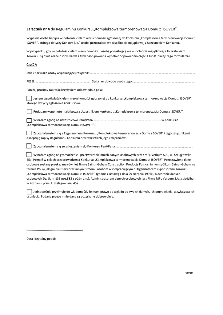 Załącznik nr 4 do Regulaminu Konkursu „Kompleksowa termorenowacja Domu z ISOVER”. Wypełnia osoba będąca współwłaścicielem nieruchomości zgłoszonej do konkursu „Kompleksowa termorenowacja Domu z ISOVER”, którego dotyczy Konkurs lub/i osoba pozostająca we wspólnocie majątkowej z Uczestnikiem Konkursu. W przypadku, gdy współwłaścicielem nieruchomości i osobą pozostającą we wspólnocie majątkowej z Uczestnikiem Konkursu są dwie różne osoby, każda z tych osób powinna wypełnić odpowiednio część A lub B niniejszego formularza). Część A Imię i nazwisko osoby wypełniającej załącznik: ……………………………………………………………………………………………………………………… PESEL: …………………………………………………………….. Seria i nr dowodu osobistego: …………………………………………………………………….. Poniżej prosimy zakreślić krzyżykiem odpowiednie pola: Jestem współwłaścicielem nieruchomości zgłoszonej do konkursu „Kompleksowa termorenowacja Domu z ISOVER”, którego dotyczy zgłoszenie konkursowe. Posiadam wspólnotę majątkową z Uczestnikiem Konkursu „„Kompleksowa termorenowacja Domu z ISOVER””. Wyrażam zgodę na uczestnictwo Pani/Pana …………………………………………………………………………… w Konkursie „Kompleksowa termorenowacja Domu z ISOVER”. Zapoznałam/łem się z Regulaminem Konkursu „Kompleksowa termorenowacja Domu z SOVER” i jego załącznikami. Akceptuję zapisy Regulaminu Konkursu oraz wszystkich jego załączników. Zapoznałam/łem się ze zgłoszeniem do Konkursu Pani/Pana ………………………………………………………………………………………. Wyrażam zgodę na gromadzenie i przetwarzanie moich danych osobowych przez MPL Verbum S.A., ul. Szelągowska 45a, Poznań w celach przeprowadzenia Konkursu „Kompleksowa termorenowacja Domu z ISOVER”. Pozostawione dane osobowe zostaną przekazane również firmie Saint - Gobain Construction Products Polska i innym spółkom Saint - Gobain na terenie Polski jak gminie Psary oraz innym firmom i osobom współpracującym z Organizatorem i Sponsorami Konkursu „Kompleksowa termorenowacja Domu z ISOVER” (godnie z ustawą z dnia 29 sierpnia 1997r., o ochronie danych osobowych Dz. U. nr 133 poz.883 z późn. zm.). Administratorem danych osobowych jest Firma MPL Verbum S.A. z siedzibą w Poznaniu przy ul. Szelągowskiej 45a. Jednocześnie przyjmuję do wiadomości, że mam prawo do wglądu do swoich danych, ich poprawiania, a zwłaszcza ich usunięcia. Podane przeze mnie dane są pozyskane dobrowolnie. ------------------------------------------------------Data i czytelny podpis verte Część B Imię i nazwisko osoby wypełniającej załącznik: ……………………………………………………………………………………………………………………… PESEL: …………………………………………………………….. Seria i nr dowodu osobistego: …………………………………………………………………….. Poniżej prosimy zakreślić krzyżykiem odpowiednie pola: Jestem współwłaścicielem działki budowlanej na której planowana jest budowa budynku jednorodzinnego, którego dotyczy zgłoszenie konkursowe. Posiadam wspólnotę majątkową z Uczestnikiem Konkursu „Kompleksowa termorenowacja Domu z ISOVER”. Wyrażam zgodę na uczestnictwo Pani/Pana …………………………………………………………………………… w Konkursie „Kompleksowa termorenowacja Domu z ISOVER”. Zapoznałam/łem się z Regulaminem Konkursu „Kompleksowa termorenowacja Domu z ISOVER” i jego załącznikami. Akceptuję zapisy Regulaminu Konkursu oraz wszystkich jego załączników. Zapoznałam/łem się ze zgłoszeniem do Konkursu Pani/Pana ………………………………………………………………………………………. Wyrażam zgodę na gromadzenie i przetwarzanie moich danych osobowych przez MPL Verbum S.A., ul. Szelągowska 45a, Poznań w celach przeprowadzenia Konkursu „Kompleksowa termorenowacja Domu z ISOVER”. Pozostawione dane osobowe zostaną przekazane również firmie Saint - Gobain Construction Products Polska i innym spółkom Saint - Gobain na terenie Polski jak gminie Psary oraz innym firmom i osobom współpracującym z Organizatorem i Sponsorami Konkursu „Kompleksowa termorenowacja Domu z ISOVER” (godnie z ustawą z dnia 29 sierpnia 1997r., o ochronie danych osobowych Dz. U. nr 133 poz.883 z późn. zm.). Administratorem danych osobowych jest Firma MPL Verbum S.A. z siedzibą w Poznaniu przy ul. Szelągowskiej 45a. Jednocześnie przyjmuję do wiadomości, że mam prawo do wglądu do swoich danych, ich poprawiania, a zwłaszcza ich usunięcia. Podane przeze mnie dane są pozyskane dobrowolnie. -------------------------------------------------------Data i czytelny podpis