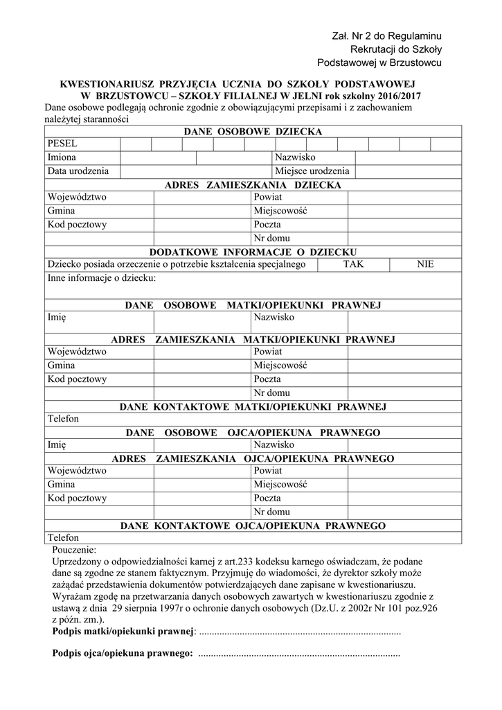 Zał. Nr 2 do Regulaminu Rekrutacji do Szkoły Podstawowej w Brzustowcu KWESTIONARIUSZ PRZYJĘCIA UCZNIA DO SZKOŁY PODSTAWOWEJ W BRZUSTOWCU – SZKOŁY FILIALNEJ W JELNI rok szkolny 2016/2017 Dane osobowe podlegają ochronie zgodnie z obowiązującymi przepisami i z zachowaniem należytej staranności DANE OSOBOWE DZIECKA PESEL Imiona Nazwisko Data urodzenia Miejsce urodzenia ADRES ZAMIESZKANIA DZIECKA Województwo Powiat Gmina Miejscowość Kod pocztowy Poczta Nr domu DODATKOWE INFORMACJE O DZIECKU Dziecko posiada orzeczenie o potrzebie kształcenia specjalnego TAK NIE Inne informacje o dziecku: DANE OSOBOWE Imię MATKI/OPIEKUNKI PRAWNEJ Nazwisko ADRES Województwo Gmina Kod pocztowy ZAMIESZKANIA MATKI/OPIEKUNKI PRAWNEJ Powiat Miejscowość Poczta Nr domu DANE KONTAKTOWE MATKI/OPIEKUNKI PRAWNEJ Telefon DANE OSOBOWE OJCA/OPIEKUNA PRAWNEGO Nazwisko ADRES ZAMIESZKANIA OJCA/OPIEKUNA PRAWNEGO Województwo Powiat Gmina Miejscowość Kod pocztowy Poczta Nr domu DANE KONTAKTOWE OJCA/OPIEKUNA PRAWNEGO Telefon Pouczenie: Uprzedzony o odpowiedzialności karnej z art.233 kodeksu karnego oświadczam, że podane dane są zgodne ze stanem faktycznym. Przyjmuję do wiadomości, że dyrektor szkoły może zażądać przedstawienia dokumentów potwierdzających dane zapisane w kwestionariuszu. Wyrażam zgodę na przetwarzania danych osobowych zawartych w kwestionariuszu zgodnie z ustawą z dnia 29 sierpnia 1997r o ochronie danych osobowych (Dz.U. z 2002r Nr 101 poz.926 z późn. zm.). Podpis matki/opiekunki prawnej: ................................................................................ Imię Podpis ojca/opiekuna prawnego: ................................................................................