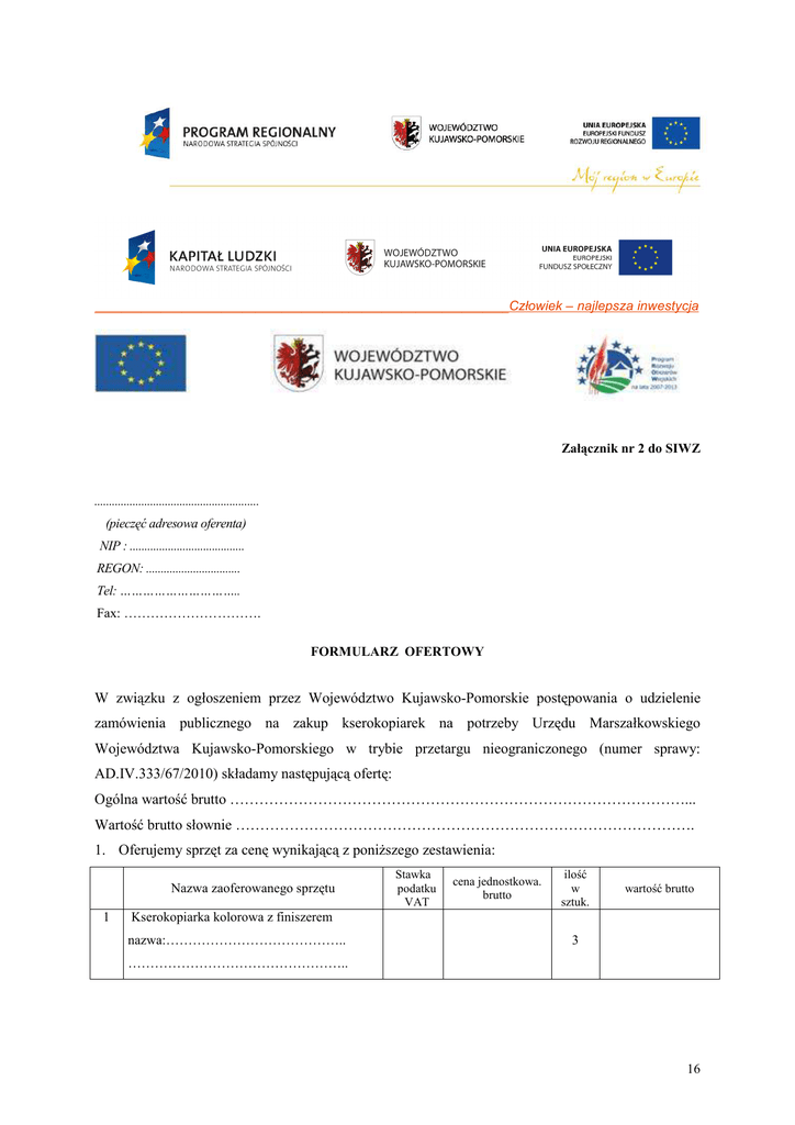 ______________________________________________________________Człowiek – najlepsza inwestycja Załącznik nr 2 do SIWZ ........................................................ (pieczęć adresowa oferenta) NIP : ....................................... REGON: ................................ Tel: ………………………….. Fax: …………………………. FORMULARZ OFERTOWY W związku z ogłoszeniem przez Województwo Kujawsko-Pomorskie postępowania o udzielenie zamówienia publicznego na zakup kserokopiarek na potrzeby Urzędu Marszałkowskiego Województwa Kujawsko-Pomorskiego w trybie przetargu nieograniczonego (numer sprawy: AD.IV.333/67/2010) składamy następującą ofertę: Ogólna wartość brutto …………………………………………………………………………………... Wartość brutto słownie …………………………………………………………………………………. 1. Oferujemy sprzęt za cenę wynikającą z poniŜszego zestawienia: Nazwa zaoferowanego sprzętu 1 Stawka podatku VAT cena jednostkowa. brutto ilość w sztuk. wartość brutto Kserokopiarka kolorowa z finiszerem nazwa:………………………………….. 3 ………………………………………….. 16 2 Kserokopiarka czarno-biała nazwa:……………………………………… 4 ……………………………………………… 3 Laserowe urządzenie wielofunkcyjne monochromatyczne, nazwa:……………………………………… 7 ……………………………………………… 4 Moduł faksu do Urządzenia Olivetti d-Copia 200, nazwa:……………………………………… 1 ………………………………………………. Razem: 2. Termin realizacji zamówienia: 21 dni o dnia podpisania umowy. 3. Oświadczamy, Ŝe w cenie naszej oferty zostały uwzględnione wszystkie koszty wykonania zamówienia. 4. Oświadczamy, Ŝe zapoznaliśmy się z treścią Specyfikacji Istotnych Warunków Zamówienia i nie wnosimy do niej zastrzeŜeń oraz przyjmujemy warunki w niej zawarte. 5. Oświadczamy, Ŝe uwaŜamy się za związanych niniejszą ofertą na czas wskazany w Specyfikacji Istotnych Warunków Zamówienia. 6. W przypadku przyznania nam zamówienia, zobowiązujemy się do zawarcia umowy w miejscu i terminie wskazanym przez Zamawiającego. 7. Oświadczamy, Ŝe zostaliśmy poinformowani, Ŝe moŜemy wydzielić z oferty informacje stanowiące tajemnicę przedsiębiorstwa w rozumieniu przepisów o zwalczaniu nieuczciwej konkurencji i zastrzec w odniesieniu do tych informacji, aby nie były one udostępnione innym uczestnikom postępowania. 8. Oferta została złoŜona na .............zapisanych stronach, kolejno ponumerowanych od nr ........... do nr ........... (uwaga — na ofertę składają się wszystkie dołączone dokumenty, formularze, oświadczenia, zaświadczenia, itp.). 9. Załączamy wszystkie dokumenty wymienione w SIWZ**., tj: 1. oświadczenia Wykonawcy, stanowiące załącznik nr 1A i 1B do SIWZ, 2. aktualny odpisu z właściwego rejestru, jeŜeli odrębne przepisy wymagają wpisu do rejestru 3. wykaz części zamówienia powierzonych do wykonania podwykonawcom (stanowiącym załącznik nr 4 do niniejszej SIWZ), 4. specyfikacja techniczna producenta potwierdzającą posiadanie wszystkich wymaganych funkcjonalności przez proponowane urządzenia 5. pozostałe: ……………………………………………… ……………………………………………… ……………………………………………… ……………………………………………… ……………………………………………… ........................................ dnia ................ .............................................................................. nazwisko i imię, podpis osoby/ osób/ upowaŜnionej/ych wraz z imienną pieczątką (**) niepotrzebne skreślić 17