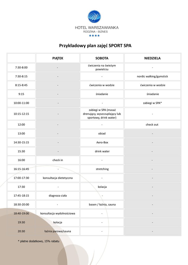 Przykładowy plan zajęć SPORT SPA PIĄTEK SOBOTA NIEDZIELA 7:30-8:00 - ćwiczenia na świeżym powietrzu - 7:30-8:15 - - nordic walking/gymstick 8:15-8:45 - ćwiczenia w wodzie ćwiczenia w wodzie 9:15 - śniadanie śniadanie 10:00-11:00 - - zabiegi w SPA* 10:15-12:15 - zabiegi w SPA (masaż drenujący, wyszczuplający lub sportowy, drink water) - 12:00 - - check out 13:00 - obiad - 14:30-15:15 - Aero-Box - 15:30 - drink water - 16:00 check in - - 16:15-16:45 - stretching - 17:00-17:30 konsultacja dietetyczna - - 17:30 - kolacja - 17:45-18:15 diagnoza ciała - - 18:30-20:00 - basen / łaźnia, sauna - 18:40-19:00 konsultacja wydolnościowa - - 19:30 kolacja - - 20:30 łaźnia parowa/sauna - - * płatne dodatkowo, 15% rabatu
