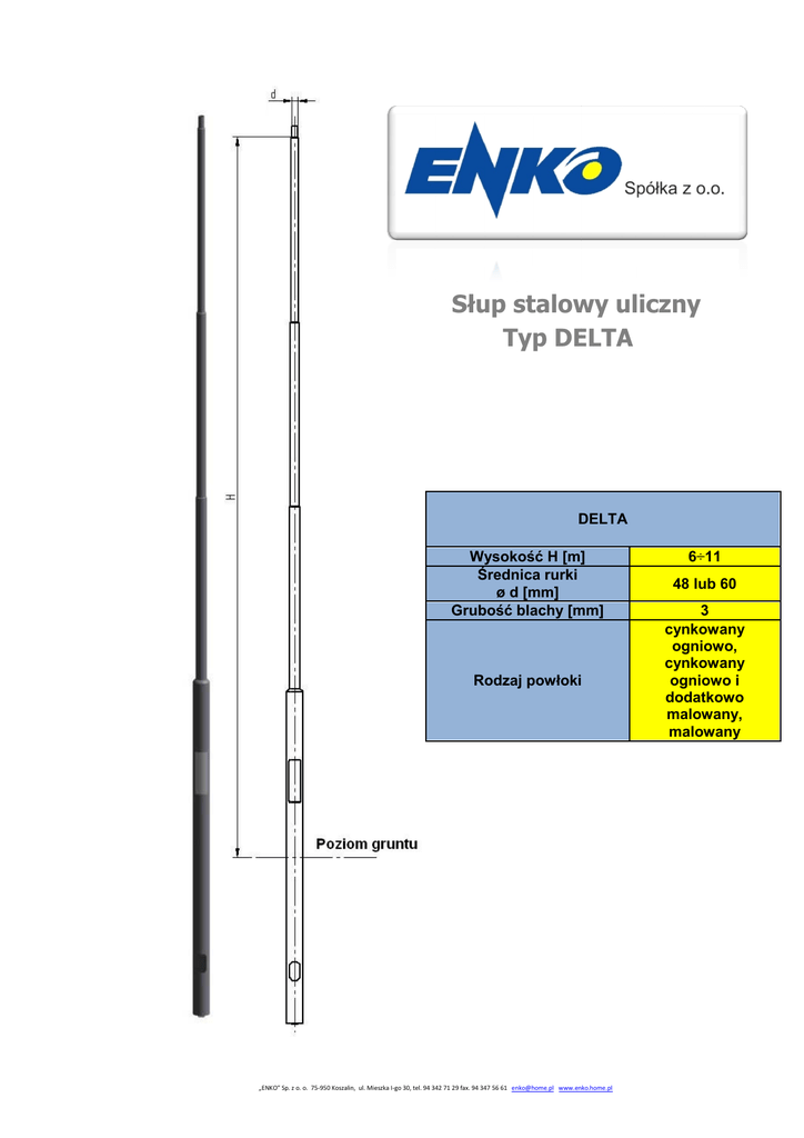 Słup stalowy uliczny Typ DELTA DELTA Wysokość H [m] Średnica rednica rurki ø d [mm] Grubość blachy [mm] Rodzaj powłoki „ENKO” Sp. z o. o. 75-950 75 Koszalin, ul. Mieszka I-go 30, tel. 94 342 71 29 fax. 94 347 56 61 [email protected] www.enko.home.pl 6÷11 48 lub 60 3 cynkowany ogniowo, cynkowany ogniowo i dodatkowo malowany, malowany