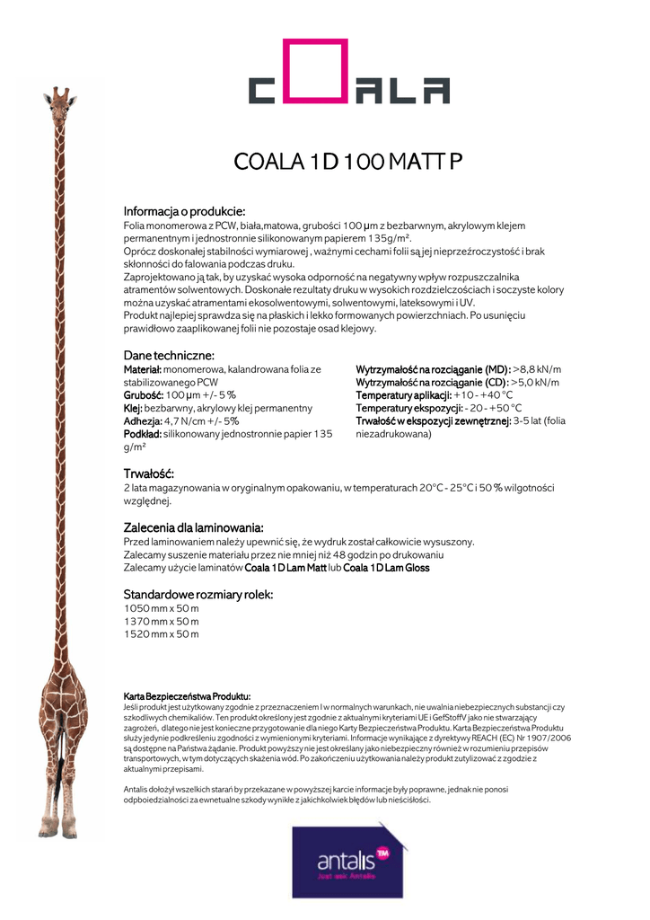 COALA 1D 100 MATT P Informacja o produkcie: Folia monomerowa z PCW, biała,matowa, grubości 100 µm z bezbarwnym, akrylowym klejem permanentnym i jednostronnie silikonowanym papierem 135g/m². Oprócz doskonałej stabilności wymiarowej , ważnymi cechami folii są jej nieprzeźroczystość i brak skłonności do falowania podczas druku. Zaprojektowano ją tak, by uzyskać wysoka odporność na negatywny wpływ rozpuszczalnika atramentów solwentowych. Doskonałe rezultaty druku w wysokich rozdzielczościach i soczyste kolory można uzyskać atramentami ekosolwentowymi, solwentowymi, lateksowymi i UV. Produkt najlepiej sprawdza się na płaskich i lekko formowanych powierzchniach. Po usunięciu prawidłowo zaaplikowanej folii nie pozostaje osad klejowy. Dane techniczne: Materiał: monomerowa, kalandrowana folia ze stabilizowanego PCW Grubość: 100 µm +/- 5 % Klej: bezbarwny, akrylowy klej permanentny Adhezja: 4,7 N/cm +/- 5% Podkład: silikonowany jednostronnie papier 135 g/m² Wytrzymałość na rozciąganie (MD): >8,8 kN/m Wytrzymałość na rozciąganie (CD): >5,0 kN/m Temperatury aplikacji: +10 - +40 °C Temperatury ekspozycji: - 20 - +50 °C Trwałość w ekspozycji zewnętrznej zewnętrznej: znej: 3-5 lat (folia niezadrukowana) Trwałość: 2 lata magazynowania w oryginalnym opakowaniu, w temperaturach 20°C - 25°C i 50 % wilgotności względnej. Zalecenia dla laminowania: Przed laminowaniem należy upewnić się, że wydruk został całkowicie wysuszony. Zalecamy suszenie materiału przez nie mniej niż 48 godzin po drukowaniu Zalecamy użycie laminatów Coala 1D Lam Matt lub Coala 1D Lam Gloss Standardowe rozmiary rolek: 1050 mm x 50 m 1370 mm x 50 m 1520 mm x 50 m Karta Bezpieczeństwa Produktu: Jeśli produkt jest użytkowany zgodnie z przeznaczeniem I w normalnych warunkach, nie uwalnia niebezpiecznych substancji czy szkodliwych chemikaliów. Ten produkt określony jest zgodnie z aktualnymi kryteriami UE i GefStoffV jako nie stwarzający zagrożeń, dlatego nie jest konieczne przygotowanie dla niego Karty Bezpieczeństwa Produktu. Karta Bezpieczeństwa Produktu służy jedynie podkreśleniu zgodności z wymienionymi kryteriami. Informacje wynikające z dyrektywy REACH (EC) Nr 1907/2006 są dostępne na Państwa żądanie. Produkt powyższy nie jest określany jako niebezpieczny również w rozumieniu przepisów transportowych, w tym dotyczących skażenia wód. Po zakończeniu użytkowania należy produkt zutylizować z zgodzie z aktualnymi przepisami. Antalis dołożył wszelkich starań by przekazane w powyższej karcie informacje były poprawne, jednak nie ponosi odpboiedzialności za ewnetualne szkody wynikłe z jakichkolwiek błędów lub nieściśłości.