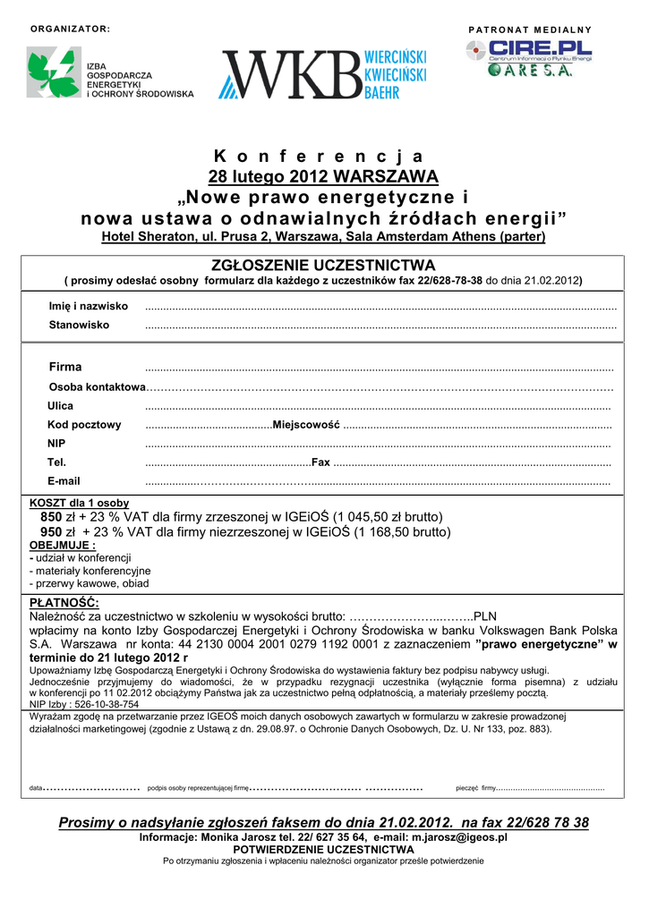O R G AN I Z AT O R : P ATR O N AT M EDI AL N Y K o n f e r e n c j a 28 lutego 2012 WARSZAWA „Now e praw o energetyczne i now a ustaw a o odnaw ialnych źródłach energii ” Hotel Sheraton, ul. Prusa 2, Warszawa, Sala Amsterdam Athens (parter) ZGŁOSZENIE UCZESTNICTWA ( prosimy odesłać osobny formularz dla każdego z uczestników fax 22/628-78-38 do dnia 21.02.2012) Imię i nazwisko ............................................................................................................................................................ Stanowisko ............................................................................................................................................................ Firma ........................................................................................................................................................... Osoba kontaktowa………………………………………………………………………………………………………………… Ulica .......................................................................................................................................................... Kod pocztowy ..........................................Miejscowość ......................................................................................... NIP .......................................................................................................................................................... Tel. .......................................................Fax ............................................................................................ E-mail .................…………..………………................................................................................................... KOSZT dla 1 osoby 850 zł + 23 % VAT dla firmy zrzeszonej w IGEiOŚ (1 045,50 zł brutto) 950 zł + 23 % VAT dla firmy niezrzeszonej w IGEiOŚ (1 168,50 brutto) OBEJMUJE : - udział w konferencji - materiały konferencyjne - przerwy kawowe, obiad PŁATNOŚĆ: Należność za uczestnictwo w szkoleniu w wysokości brutto: …………………...……..PLN wpłacimy na konto Izby Gospodarczej Energetyki i Ochrony Środowiska w banku Volkswagen Bank Polska S.A. Warszawa nr konta: 44 2130 0004 2001 0279 1192 0001 z zaznaczeniem ”prawo energetyczne” w terminie do 21 lutego 2012 r Upoważniamy Izbę Gospodarczą Energetyki i Ochrony Środowiska do wystawienia faktury bez podpisu nabywcy usługi. Jednocześnie przyjmujemy do wiadomości, że w przypadku rezygnacji uczestnika (wyłącznie forma pisemna) z udziału w konferencji po 11 02.2012 obciążymy Państwa jak za uczestnictwo pełną odpłatnością, a materiały prześlemy pocztą. NIP Izby : 526-10-38-754 Wyrażam zgodę na przetwarzanie przez IGEOŚ moich danych osobowych zawartych w formularzu w zakresie prowadzonej działalności marketingowej (zgodnie z Ustawą z dn. 29.08.97. o Ochronie Danych Osobowych, Dz. U. Nr 133, poz. 883). data ........................... podpis osoby reprezentującej firmę ............................... ................ pieczęć firmy............................................. Prosimy o nadsyłanie zgłoszeń faksem do dnia 21.02.2012. na fax 22/628 78 38 Informacje: Monika Jarosz tel. 22/ 627 35 64, e-mail: [email protected] POTWIERDZENIE UCZESTNICTWA Po otrzymaniu zgłoszenia i wpłaceniu należności organizator prześle potwierdzenie