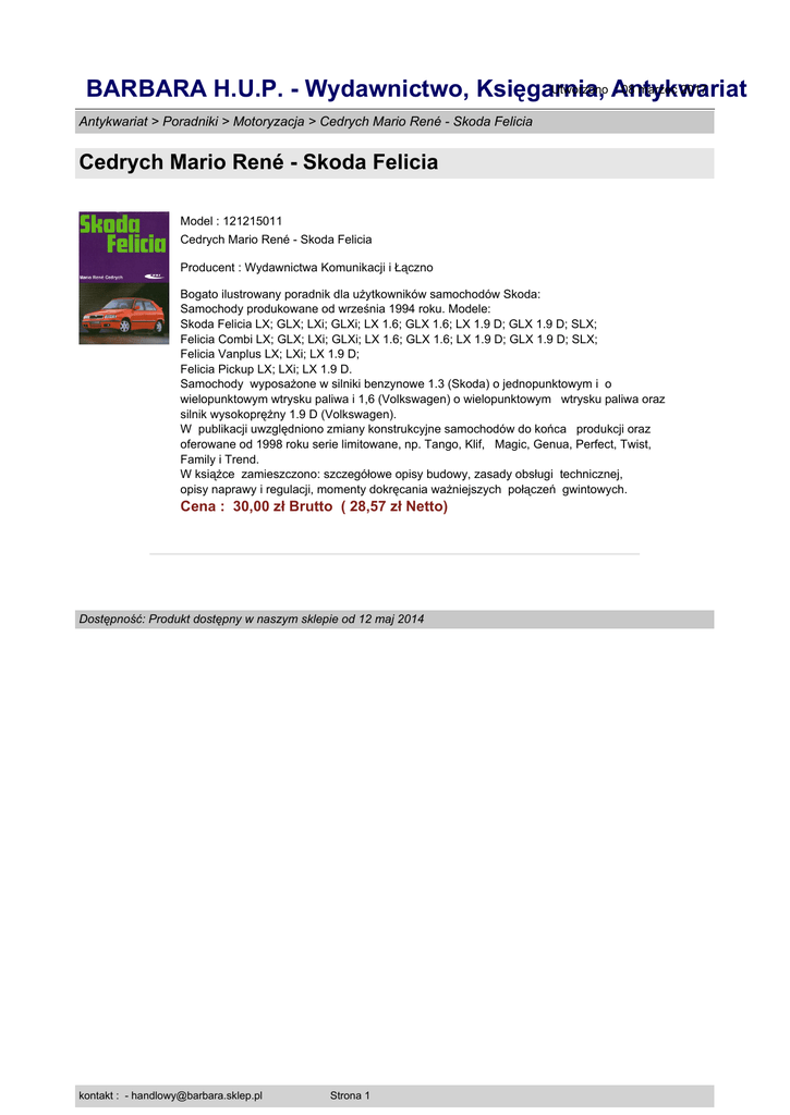 Utworzono Antykwariat : 08 marzec 2017 BARBARA H.U.P. - Wydawnictwo, Księgarnia, Antykwariat > Poradniki > Motoryzacja > Cedrych Mario René - Skoda Felicia Cedrych Mario René - Skoda Felicia Model : 121215011 Cedrych Mario René - Skoda Felicia Producent : Wydawnictwa Komunikacji i Łączno Bogato ilustrowany poradnik dla użytkowników samochodów Skoda: Samochody produkowane od września 1994 roku. Modele: Skoda Felicia LX; GLX; LXi; GLXi; LX 1.6; GLX 1.6; LX 1.9 D; GLX 1.9 D; SLX; Felicia Combi LX; GLX; LXi; GLXi; LX 1.6; GLX 1.6; LX 1.9 D; GLX 1.9 D; SLX; Felicia Vanplus LX; LXi; LX 1.9 D; Felicia Pickup LX; LXi; LX 1.9 D. Samochody wyposażone w silniki benzynowe 1.3 (Skoda) o jednopunktowym i o wielopunktowym wtrysku paliwa i 1,6 (Volkswagen) o wielopunktowym wtrysku paliwa oraz silnik wysokoprężny 1.9 D (Volkswagen). W publikacji uwzględniono zmiany konstrukcyjne samochodów do końca produkcji oraz oferowane od 1998 roku serie limitowane, np. Tango, Klif, Magic, Genua, Perfect, Twist, Family i Trend. W książce zamieszczono: szczegółowe opisy budowy, zasady obsługi technicznej, opisy naprawy i regulacji, momenty dokręcania ważniejszych połączeń gwintowych. Cena : 30,00 zł Brutto ( 28,57 zł Netto) Dostępność: Produkt dostępny w naszym sklepie od 12 maj 2014 kontakt : - [email protected] Strona 1