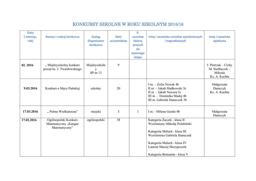 KONKURSY SZKOLNE W ROKU SZKOLNYM 2015/16 Data ( miesiąc, rok) Nazwa i rodzaj konkursu Zasięg Organizator konkursu Ilość uczestników „ Międzyszkolny konkurs poezji ks. J. Twardowskiego Międzyszkoln y SP nr 13 9 9.03.2016 Konkurs o Męce Pańskiej szkolny 20 17.03.2016 „ Palma Wielkanocna” miejski 5 Ogólnopolski Konkurs Matematyczny „Kangur Matematyczny” ogólnopolski 38 02. 2016 17.02.2016 Il. uczniów którzy przeszli do wyższego etapu Imię i nazwisko uczniów wyróżnionych i nagrodzonych Imię i nazwisko opiekuna J. Pietrzak – Cichy M. Siedlaczek – Mikoda Ks. A. Kuchta I m. – Zofia Nowak 4b II m. – Jakub Sladkowski 5c II m. – Jakub Nawara 5c III m. - Dominika Madej 4b III m. Gabriela Staneczek 3b 1 I m. - Milena Gustin 4b Kategoria Żaczek - klasa II Wyróżniony Mikołaj Polubiński Kategoria Maluch - klasa III Wyróżniona Gabriela Staneczek Kategoria Maluch - klasa IV Laureat Maciej Skrzyposzek Kategoria Beniamin - klasa V Małgorzata Damczyk Ks. A. Kuchta Małgorzata Damczyk Wyróżnienie : Laura Klencz Mikołaj Skuczeń Wiktor Skroch Paweł Wysoczański 13.04.2016 22.04.2016 04.2016 02-05.2016 02 – 05.2016 Anna Szymańska miejski 12 Rudzki Festiwal Kultury Młodzieży Szkolnej miejski 12 Wojewódzki Biblioteka Śląska 4 4 I m. – Martyna Pańczak II m. – Maciej Skrzyposzek Brayan Komar Patrycja Kula J. Pietrzak – Cichy 3 1 Karolina Wysoczańska Mirella Siedlaczek Mikoda 60 - I m. - Maciej Skrzyposzek IVa II m. – Marta Bodzianowska Va III m. – Julia Wilczyńska Va Natalia Szymańska Va Jakub Suliga Va Aleksandra Sowa Vc Dominik Cąkała Vc Szymon Szarafiński VI b Jakub Tomczyk IVa Oliwia Florek Vb Konkurs Interdyscyplinarny na projekt komiksu „ Śladami Tomka Wilmowskiego” UK i SOK 8 Internetowy konkurs wiedzy o Wielkiej Brytanii i krajach angielskiego obszaru językowego „Co to jest” - II edycja ( Konkurs cykliczny, raz w tygodniu) Regionalny SP 34 Katowice Szkolny 12 II m. - Chór szkolny Konkurs piosenki i poezji obcojęzycznej Anna Szymańska Anna Pełka III. 2016 „ Kolorowa Wielkanoc” – konkurs plastyczny Szkolny Karta świąteczna: I m Gabriela Staneczek IIIb II m Gracjan Mamiak IIa III m Emilia Kulawiak Ib Wyróżnienia: Jagoda Potomska IIIa Mateusz Opielka IIc Paweł Bodzianowski Ib 32 Monika Kot Agnieszka Kaleta Pisanka: I m Dominika Wadas Id II m Emilia Sikora Ic III m Paulina Gabryś IIa Wyróżnienia: Julia Nojdek IIb Martyna Kunc Ic Marcin Piątek Id III.2016 I – V. 2016 I – IV. 2016 Konkurs dla klas drugich Szkolny 18 „ Moje czyste Miasto” Ogólnopolski / wojewódzki Kl IV-VI „ Zaprzyjaźnij się z jednym z mieszkańców Oceanarium 3D” ogólnopolski 6 I m. – Mikołaj Połubiński IIc II m. - Karolina Molawska IIb Maja Strugała IId III m. - Daniel Iwanow IIb Julia Nojdek IIb Paulina Gabryś IIa - Sylwia Janota – Sikora Marzena Dubiel I miejsce – tytuł Lidera Segregacji 2016 roku Anna Pełka - Anna Pełka XII. 2015 – IV. 2016 IV. 2016 Konkurs Wiedzy Przyrodniczej szkolny 10 „Bateria Pomysłów” ogólnopolski Etap pierwszy – cała społeczność szkoły: uczniowie,na uczyciele, rodzice. II etap 10 osób III etap Społeczność szkoły i lokalna społeczność kl. I – VI „ Żywioły ziemi” Konkurs – zabawa z okazji Tygodnia Ziemi Szkolny 219 II etap - 7 osób III etap – 3 osoby - Wyróżnienie: Maciej Skrzyposzek IV a Marta Bodzianowska Va Julia Wilczyńska Va II miejsce w województwie śląskim ( nagroda dla całej szkoły) Nagrody indywidualne dla zespołu: Laura Klencz Natalia Szymańska Jakub Suliga Dominik Cąkała Przemysław Joszko Przemysław Miemiec Jakub Kaduk Patryk Rachuba Kamil Misztal Zuzanna Nowicka Ziemia Maja Pawlak Ia Jagoda Walenciak Ia Martyna Kunc Ic Oskar Czura Ic Zuzanna Gozdecko Id Dominika Kołodziejska Id Karolina Molawska IIb Natalia Pakura IId Paskal Grzesiczek IId Monika Nocoń III b Gabriela Staneczek IIIb Mateusz Mrozek IIIb Anna Pełka Anna Pełka Martyna Piwoń IIIc Karol Jeżdzewski IIIc Darek Złomowski IIIc Martyna Pańczak IVa Jakub Tomczyk IVb Anna Chmurek IVb Wiktor Paździoch Vb Woda Zuzanna Lewandowska Ia Marlena Wroblik Ia Szymon Polanek Ia Emilia Kulawik Ib Dominika Wojenek Ib Emilia Króliczek Ic Michalina Macha Id Vanessa Olendew Id Tomasz Jasiński Id Bartosz Gocha Id Paulina Szołtysek IIa Paulina Sitek IIb Emilia Gozdecka IId Anna Drewnik IIIc Igor Skwarc IIIc Krystian Magiera Va Hanna Unt Vc Kamila Opiołka VIb Julia Hess VIc Anna Szydłowska VIc Ogień Maja Florek Ia Zuzanna Krzesimowska Ia Oskar Ulkowski Ia Adrian Piecko Ib Adrian Twardoch Ic Aleksandra Gawron IIa Paulina Samol IIa Wojciech Gamola IIa Kamil Herok IIb Karolina Haas IIIb Piotr Witoszek IIIb Natalia Bernat IIIc Karolina Hewlik IIIc Wiktoria Sokoluk IIIc Judyta Szuba IIIc Justyna Gontarek IVa Milena Gustin IVb Oliwia Florek Vb Karol Paliwoda Vb Łukasz Bieras Vc Powietrze Emilia Torbiczok Ia Roksana Tobor Ia Paulina Jańczak Ib Wiktoria Martins Id Martyna Waniek Id Jakub Skrzypczak Id Julia Biniek Ie Maciej Kucharczyk Ie Anna Choroba IIa Hanna Sikora IIc Iga Pacyna IId Szymon Musioł IIIb Wojciech Nawara IIIb Sebastaian Kapica IIIc Iliwia Rokosz IVa Natalia Świerencz IVa Wiktoria Rolka IVb Zuzanna Kozłowska Vb Oliwia Warwas Vb Daria Sierant Vc Mirella Mikoda – Siedlaczek V. 2016 My English book - książka w języku angielskim Regionalny SP 43 Bytom 1 1 Rok szkolny 2015/16 SKO – Konkurs na najaktywniejszego członka szkolny 29 Aneta Hewlik Rok szkolny 2015/16 SKO – konkurs na hasło promujące oszczędzanie szkolny 9 Aneta Hewlik IV.2016 „ Dlaczego należy segregować śmieci” - konkurs na plakat I-III Szkolny Anna Pełka 5 I m. - Paulina Gabryś IIa II m. - Adrian Piecko Ib III m. - Emilia Sikora Ic - konkurs na komiks IV-VI 1 - „Ekozwierzak” 36 Jakub Tomczyk IVa Kl. IV - VI I m. - Kacper Piecko IVb II m. - Julia Wilczyńska Va III m. - Marta Bodzianowska Va Aleksandra Sowa Vc Jakub Tomczyk IVa Jakub Skodzki Vc Kl. I – III I m. - Maja Pawlak Ia I