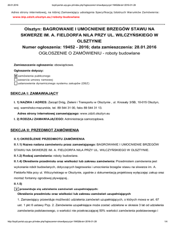 28.01.2016 bzp0.portal.uzp.gov.pl/index.php?ogloszenie=show&pozycja=19452&rok=20160128 Adres strony internetowej, na której Zamawiający udostępnia Specyfikację Istotnych Warunków Zamówienia: www.bip.zdzit.olsztyn.eu/robotybudowlane Olsztyn: BAGROWANIE I UMOCNIENIE BRZEGÓW STAWU NA SKWERZE IM. A. FIELDORFA NILA PRZY UL. WILCZYŃSKIEGO W OLSZTYNIE Numer ogłoszenia: 19452 2016; data zamieszczenia: 28.01.2016 OGŁOSZENIE O ZAMÓWIENIU roboty budowlane Zamieszczanie ogłoszenia: obowiązkowe. Ogłoszenie dotyczy: V zamówienia publicznego zawarcia umowy ramowej ustanowienia dynamicznego systemu zakupów (DSZ) SEKCJA I: ZAMAWIAJĄCY I. 1) NAZWA I ADRES: Zarząd Dróg, Zieleni i Transportu w Olsztynie , ul. Knosały 3/5B, 10015 Olsztyn, woj. warmińskomazurskie, tel. 89 544 31 00, faks 89 544 31 13. Adres strony internetowej zamawiającego: www.zdzit.olsztyn.eu I. 2) RODZAJ ZAMAWIAJĄCEGO: Administracja samorządowa. SEKCJA II: PRZEDMIOT ZAMÓWIENIA II.1) OKREŚLENIE PRZEDMIOTU ZAMÓWIENIA II.1.1) Nazwa nadana zamówieniu przez zamawiającego: BAGROWANIE I UMOCNIENIE BRZEGÓW STAWU NA SKWERZE IM. A. FIELDORFA NILA PRZY UL. WILCZYŃSKIEGO W OLSZTYNIE. II.1.2) Rodzaj zamówienia: roboty budowlane. II.1.4) Określenie przedmiotu oraz wielkości lub zakresu zamówienia: Przedmiotem zamówienia jest wykonanie robót budowlanych, dotyczących bagrowania i umocnienia brzegów stawu na skwerze im. A. Fieldorfa Nila przy ul. Wilczyńskiego w Olsztynie, zgodnie z dokumentacją projektową wyłączając zakup oraz montaż fontanny ogrodowej pływającej.. II.1.5) V przewiduje się udzielenie zamówień uzupełniających: Określenie przedmiotu oraz wielkości lub zakresu zamówień uzupełniających 1. Zamawiający przewiduje możliwość udzielenia zamówień uzupełniających, o których mowa w art. 67 ust. 1 pkt 6 ustawy Pzp. 2. Zamówienie uzupełniające może zostać udzielone w okresie 3 lat od udzielenia zamówienia podstawowego, o wartości nie przekraczającej 50% wartości zamówienia podstawowego i http://bzp0.portal.uzp.gov.pl/index.php?ogloszenie=show&pozycja=19452&rok=20160128 1/4 28.01.2016 bzp0.portal.uzp.gov.pl/index.php?ogloszenie=show&pozycja=19452&rok=20160128 będzie polegało na powtórzeniu tego samego rodzaju zamówień. II.1.6) Wspólny Słownik Zamówień (CPV): 45.00.00.007, 45.24.00.001. II.1.7) Czy dopuszcza się złożenie oferty częściowej: nie. II.1.8) Czy dopuszcza się złożenie oferty wariantowej: nie. II.2) CZAS TRWANIA ZAMÓWIENIA LUB TERMIN WYKONANIA: Okres w dniach: 70. SEKCJA III: INFORMACJE O CHARAKTERZE PRAWNYM, EKONOMICZNYM, FINANSOWYM I TECHNICZNYM III.1) WADIUM Informacja na temat wadium: Wykonawca przystępujący do postępowania zobowiązany jest wnieść wadium w wysokości: 10 000,00 zł (słownie: dziesięć tysięcy złotych 00/100). III.2) ZALICZKI III.3) WARUNKI UDZIAŁU W POSTĘPOWANIU ORAZ OPIS SPOSOBU DOKONYWANIA OCENY SPEŁNIANIA TYCH WARUNKÓW III. 3.1) Uprawnienia do wykonywania określonej działalności lub czynności, jeżeli przepisy prawa nakładają obowiązek ich posiadania Opis sposobu dokonywania oceny spełniania tego warunku Zamawiający nie dokonuje szczegółowego opisu sposobu dokonywania oceny spełniania tego warunku. III.3.2) Wiedza i doświadczenie Opis sposobu dokonywania oceny spełniania tego warunku W tym zakresie zamawiający wymaga, aby wykonawca w okresie ostatnich pięciu lat przed upływem terminu składania ofert, a jeżeli okres prowadzenia działalności jest krótszy w tym okresie, zrealizował co najmniej dwie roboty budowlane w zakresie wykonania bagrowania o wartości co najmniej 100 000,00 zł brutto każda. III.3.3) Potencjał techniczny Opis sposobu dokonywania oceny spełniania tego warunku Zamawiający nie dokonuje szczegółowego opisu sposobu dokonywania oceny spełniania tego warunku. III.3.4) Osoby zdolne do wykonania zamówienia Opis sposobu dokonywania oceny spełniania tego warunku Zamawiający nie dokonuje szczegółowego opisu sposobu dokonywania oceny spełniania tego warunku. III.3.5) Sytuacja ekonomiczna i finansowa Opis sposobu dokonywania oceny spełniania tego warunku Zamawiający nie dokonuje szczegółowego opisu sposobu dokonywania oceny spełniania tego http://bzp0.portal.uzp.gov.pl/index.php?ogloszenie=show&pozycja=19452&rok=20160128 2/4 28.01.2016 bzp0.portal.uzp.gov.pl/index.php?ogloszenie=show&pozycja=19452&rok=20160128 warunku. III.4) INFORMACJA O OŚWIADCZENIACH LUB DOKUMENTACH, JAKIE MAJĄ DOSTARCZYĆ WYKONAWCY W CELU POTWIERDZENIA SPEŁNIANIA WARUNKÓW UDZIAŁU W POSTĘPOWANIU ORAZ NIEPODLEGANIA WYKLUCZENIU NA PODSTAWIE ART. 24 UST. 1 USTAWY III.4.1) W zakresie wykazania spełniania przez wykonawcę warunków, o których mowa w art. 22 ust. 1 ustawy, oprócz oświadczenia o spełnianiu warunków udziału w postępowaniu należy przedłożyć: wykaz robót budowlanych wykonanych w okresie ostatnich pięciu lat przed upływem terminu składania ofert albo wniosków o dopuszczenie do udziału w postępowaniu, a jeżeli okres prowadzenia działalności jest krótszy w tym okresie, wraz z podaniem ich rodzaju i wartości, daty i miejsca wykonania oraz z załączeniem dowodów dotyczących najważniejszych robót, określających, czy roboty te zostały wykonane w sposób należyty oraz wskazujących, czy zostały wykonane zgodnie z zasadami sztuki budowlanej i prawidłowo ukończone; III.4.2) W zakresie potwierdzenia niepodlegania wykluczeniu na podstawie art. 24 ust. 1 ustawy, należy przedłożyć: oświadczenie o braku podstaw do wykluczenia; aktualny odpis z właściwego rejestru lub z centralnej ewidencji i informacji o działalności gospodarczej, jeżeli odrębne przepisy wymagają wpisu do rejestru lub ewidencji, w celu wykazania braku podstaw do wykluczenia w oparciu o art. 24 ust. 1 pkt 2 ustawy, wystawiony nie wcześniej niż 6 miesięcy przed upływem terminu składania wniosków o dopuszczenie do udziału w postępowaniu o udzielenie zamówienia albo składania o