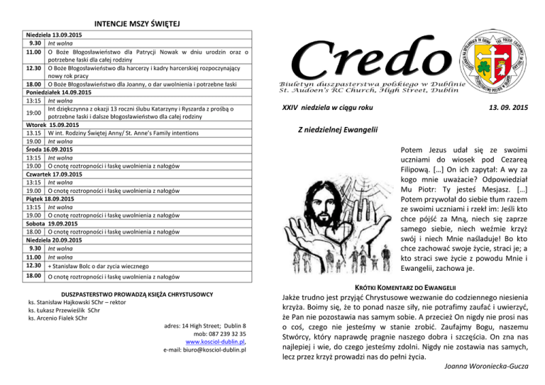 INTENCJE MSZY ŚWIĘTEJ 3 Niedziela 13.09.2015 9.30 Int wolna 11.00 O Boże Błogosławieństwo dla Patrycji Nowak w dniu urodzin oraz o potrzebne łaski dla całej rodziny 12.30 O Boże Błogosławieństwo dla harcerzy i kadry harcerskiej rozpoczynający nowy rok pracy 18.00 O Boże Błogosławieństwo dla Joanny, o dar uwolnienia i potrzebne łaski Poniedziałek 14.09.2015 13:15 Int wolna Int dziękczynna z okazji 13 roczni ślubu Katarzyny i Ryszarda z prośbą o 19:00 potrzebne łaski i dalsze błogosławieństwo dla całej rodziny Wtorek 15.09.2015 13.15 W int. Rodziny Świętej Anny/ St. Anne’s Family intentions 19.00 Int wolna Środa 16.09.2015 13:15 Int wolna 19.00 O cnotę roztropności i łaskę uwolnienia z nałogów Czwartek 17.09.2015 13:15 Int wolna 19.00 O cnotę roztropności i łaskę uwolnienia z nałogów Piątek 18.09.2015 13:15 Int wolna 19.00 O cnotę roztropności i łaskę uwolnienia z nałogów Sobota 19.09.2015 18.00 O cnotę roztropności i łaskę uwolnienia z nałogów Niedziela 20.09.2015 9.30 Int wolna 11.00 Int wolna 12.30 + Stanisław Bolc o dar zycia wiecznego 18.00 O cnotę roztropności i łaskę uwolnienia z nałogów DUSZPASTERSTWO PROWADZĄ KSIĘŻA CHRYSTUSOWCY ks. Stanisław Hajkowski SChr – rektor ks. Łukasz Przewieślik SChr ks. Arcenio Fialek SChr adres: 14 High Street; Dublin 8 mob: 087 239 32 35 www.kosciol-dublin.pl, e-mail: [email protected] XXIV niedziela w ciągu roku 13. 09. 2015 Z niedzielnej Ewangelii Potem Jezus udał się ze swoimi uczniami do wiosek pod Cezareą Filipową. […] On ich zapytał: A wy za kogo mnie uważacie? Odpowiedział Mu Piotr: Ty jesteś Mesjasz. […] Potem przywołał do siebie tłum razem ze swoimi uczniami i rzekł im: Jeśli kto chce pójść za Mną, niech się zaprze samego siebie, niech weźmie krzyż swój i niech Mnie naśladuje! Bo kto chce zachować swoje życie, straci je; a kto straci swe życie z powodu Mnie i Ewangelii, zachowa je. KRÓTKI KOMENTARZ DO EWANGELII Jakże trudno jest przyjąć Chrystusowe wezwanie do codziennego niesienia krzyża. Boimy się, że to ponad nasze siły, nie potrafimy zaufać i uwierzyć, że Pan nie pozostawia nas samym sobie. A przecież On nigdy nie prosi nas o coś, czego nie jesteśmy w stanie zrobić. Zaufajmy Bogu, naszemu Stwórcy, który naprawdę pragnie naszego dobra i szczęścia. On zna nas najlepiej i wie, do czego jesteśmy zdolni. Nigdy nie zostawia nas samych, lecz przez krzyż prowadzi nas do pełni życia. Joanna Woroniecka-Gucza PRZYGOTOWANIA DO SAKRAMENTÓW W DUSZPASTERSTWIE POLSKIM MSZA ŚWIĘTA Z UDZIAŁEM DZIECI Przygotowania do przyjęcia sakramentu I komunii świętej oraz sakramentu bierzmowania rozpoczną się we wrześniu. Pierwsze spotkanie dla zainteresowanych przyjęciem sakramentu bierzmowania w piątek 18 września po Mszy Świętej wieczornej. Zaś pierwsze spotkanie dotyczące przygotowanie do I komunii świętej w niedzielę 20 września po Mszy Świętej o godz. 12.30. Począwszy od pierwszej niedzieli września (06.09) Msza Święta sprawowana o godz. 11.00 będzie Mszą Św. z udziałem dzieci. Dlatego zachęcamy rodziców, aby ze swoimi pociechami uczestniczyli właśnie w tej Mszy Świętej. Podczas tej Eucharystii, będzie krótkie kazanie dla dzieci. Po komunii świętej błogosławieństwo dzieci. Każde dziecko uczestniczące w tej Eucharystii dostanie książeczkę, do której przez cały rok będzie wklejać obrazki, które otrzyma zawsze na zakończenie Mszy Świętej. ŚDM KRAKÓW 2016 W przyszłym roku w lipcu w Krakowie odbędą się Światowe Dni Młodzieży i spotkanie z papieżem Franciszkiem. Jest to spotkanie przeznaczone dla osób w wieku 16 – 35 lat. Zainteresowanych prosimy o kontakt z księdzem Łukaszem. Pierwsze spotkanie przygotowujące do wyjazdu 27 września po Mszy Świętej wieczornej. DZIECIĘCA SCHOLKA Zapraszamy rodziców do tworzenia dziecięcej scholki. Chętnych prosimy o kontakt z księdzem Łukaszem. Wszelkie ustalenia dotyczące prób i spotkań w późniejszym terminie. Zapraszamy już dziś. BIBLIJNE OPOWIEŚĆ – KATECHEZA DLA DZIECI PROGRAM PRZECIWKO RASIZMOWI Polacy pracujący w Gardzie zapraszają do zapoznania się z programem przeciwko rasizmowi. Przy wyjściu z kościoła są ulotki dotyczące tego programy. Informacje także na stornie www.ireport.ie Zapraszamy wszystkie dzieci po komunii świętej (wiek od 8 – 12lat) na dodatkową katechezę pt. Opowieści biblijne. Będą się one odbywały w każdy 2 i 4 piątek miesiąca. Chętnych rodziców prosimy o kontakt z księdzem Łukaszem. Pierwsze spotkanie 25 września ok. 19.30 KRĄG BIBLIJNY KOLEKTA POPRZEDNIEJ NIEDZIELI I Kolekta 530 € II Kolekta Koperty Koperty jednorazowe ŚWIATOWE DNI MŁODZIEŻY rejestrowane 270 € KRAKÓW 2016 145 € 40 € Bóg zapłać za składane ofiary Bóg zapłać za ofiary składane w kopertach, która są przeznaczone na bezpośrednie utrzymanie naszego kościoła. Są dwa rodzaje kopert – jednorazowe i rejestrowane. W zestawy kopert rejestrowanych można zaopatrzyć się w biurze duszpasterstwa. Zarejestrowana Ofiara większa niż 250 euro w ciągu roku od jednej osoby pozwoli nam ubiegać się o dodatkowe 20% od Revenue. Po wakacyjnej przerwie wracamy do spotkań kręgu biblijnego. Informujemy, że najbliższe spotkanie kręgu biblijnego odbędzie się w środę 23 września po Mszy Świętej wieczornej, ok. 19.45. w salce św. Anny. Do końca roku kalendarzowego nasze rozważania będziemy opierać o Ewangelię św. Mateusza