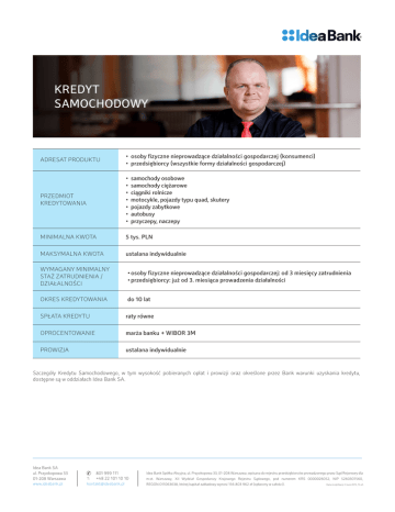 Duma Przedsiębiorcy. Jeden człowiek. Jedna firma. Jeden bank. KREDYT SAMOCHODOWY Adresat produktu • osoby fizyczne nieprowadzące działalności gospodarczej (konsumenci) • przedsiębiorcy (wszystkie formy działalności gospodarczej) Przedmiot kredytowania • samochody osobowe • samochody ciężarowe • ciągniki rolnicze • motocykle, pojazdy typu quad, skutery • pojazdy zabytkowe • autobusy • przyczepy, naczepy Minimalna kwota 5 tys. PLN Maksymalna kwota ustalana indywidualnie Wymagany minimalny staż zatrudnienia / działalności •osoby fizyczne nieprowadzące działalności gospodarczej: od 3 miesięcy zatrudnienia •przedsiębiorcy: już od 3. miesiąca prowadzenia działalności Okres kredytowania do 10 lat Spłata kredytu raty równe Oprocentowanie marża banku + WIBOR 3M Prowizja ustalana indywidualnie Szczegóły Kredytu Samochodowego, w tym wysokość pobieranych opłat i prowizji oraz określone przez Bank warunki uzyskania kredytu, dostępne są w oddziałach Idea Bank SA. Idea Bank SA ul. Domaniewska 39 Idea Bank SAWarszawa 02-672 www.ideabank.pl ul. Przyokopowa 33 01-208 Warszawa www.ideabank.pl 801 999 111 +48 22 288 80 12 +48 22 288 82 11 801 999 111 [email protected] T: +48 22 101 10 10 [email protected] T: F: Idea Bank Spółka Akcyjna, ul. Domaniewska 39, 02-672 Warszawa, wpisana do rejestru przedsiębiorców prowadzonego przez Sąd Rejonowy dla m.st. Warszawy, XIII Wydział Gospodarczy Krajowego Rejestru Sądowego, pod numerem KRS 0000026052, NIP 5260307560, REGON 011063638, której kapitał zakładowy wynosi 77 346 316 zł (opłacony w całości). Idea Bank Spółka Akcyjna, ul. Przyokopowa 33, 01-208 Warszawa, wpisana do rejestru przedsiębiorców prowadzonego przez Sąd Rejonowy dla m.st. Warszawy, XII Wydział Gospodarczy Krajowego Rejestru Sądowego, pod numerem KRS 0000026052, NIP 5260307560, REGON 011063638, której kapitał zakładowy wynosi 156 803 962 zł (opłacony w całości). Data modyfikacji: 3 June 2015, 15:45