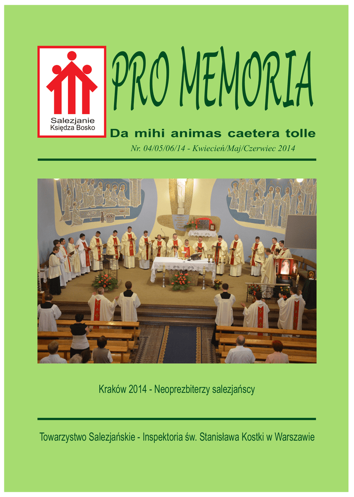 Salezjanie Księdza Bosko PRO MEMORIA Da mihi animas caetera tolle Nr. 04/05/06/14 - Kwiecień/Maj/Czerwiec 2014 Kraków 2014 - Neoprezbiterzy salezjańscy Towarzystwo Salezjańskie - Inspektoria św. Stanisława Kostki w Warszawie Nowi Salezjanie - Warszawa 25 maja 2014 r. Inspektoria pw. św. Stanisława Kostki wzbogaciła się o trzech neoprezbiterów: ks. Michała Chorążego, ks. Radosława Kuśmierza i ks. Leonarda Szewczyka. Sakramentu kapłaństwa udzielił im biskup senior archidiecezji warszawsko-praskiej ks. Kazimierz Romaniuk. Ceremonia odbyła się w Bazylice pw. Najświętszego Serca Jezusowego na warszawskiej Pradze. Słowo wstępne W numerze Umiłowani w Chrystusie Panu! Pozdrawiam Was serdecznie! Kończymy rok duszpasterski, rok uczenia i wychowywania, rok różnych naszych sukcesów i porażek, rok, który z pewnością był czasem danym nam od Boga. Bardzo dziękuję Wam za towarzyszenie nam, salezjanom Inspektorii św. Stanisława Kostki w różnych naszych wydarzeniach. Niewątpliwie, Wasze modlitwy i życzliwa obecność były nam pomocne w wielu różnych planach i zamiarach. Życzę Wszystkim, aby czas wakacji był też czasem odpoczynku, odzyskiwania sił na dalsze nasze życie. Najbliższy rok 2014-2015 jest dla Rodziny Salezjańskiej czasem szczególnym, bo obchodzimy w nim rocznicę 200-lecia urodzin Ks. Bosko. Dziękujemy Bogu za dar życia naszego Ks. Bosko, który jest dla nas Ojcem i Nauczycielem. W nadchodzącym roku czeka nas wiele wydarzeń, które pomogą nam świętować rocznicę urodzin Ks. Bosko. Przesyłam Wam nasze inspektorialne wydarzenia i zapraszam tam, gdzie możecie w nich uczestniczyć. Kochani! Niech Maryja Wspomożycielka strzeże Was w codziennym życiu i wyjednuje potrzebne łaski. Oddany w św. Janie Bosko ks. dr Andrzej WUJEK SDB Inspektor Inspektorialne obchody Jubileuszu 200-lecia Urodzin Księdza Bosko 23. 08. 2014 r. – uroczyste rozpoczęcie obchodów w Czerwińsku nad Wisłą w czasie trwania Campo Bosco 06-07. 09. 2014 r. – Familiada SSW w Ostródzie 10-12. 10. 2014 r. – Ogólnopolski Zjazd Dyrektorów Szkół Salezjańskich w Porszewicach 29. 11. 2014 r. – Dzień Jedności Rodziny Salezjańskiej w Ostródzie 28. 12 .2014 - 01. 01. 2015 r. – Ogólnopolskie Forum Animatorów w Tarnowskich Górach 01. 02. 2015 r. - Msza św. w Bazylice NSJ w Warszawie transmitowana przez TVP Polonia. 21. 04. 2015 r. - Sympozjum naukowe w Warszawie 20. 06. 2015 r. - Ogólnopolskie Spotkanie Rodziny Salezjańskiej i Młodzieży Salezjańskiej 20. 09. 2015 r. - Msza św. w Łodzi przy ul. Wodnej transmitowana przez TVP Polonia na zakończenie obchodów. Pro Memoria, Nr. 04/05/06/14 - Kwiecień/Maj/Czerwiec 2014 Nowi Salezjanie - Warszawa 25 maja 2014 r. ............................................................. 2 Słowo wstępne .............................................. 3 Umiłowani w Chrystusie Panu!............................... 3 Inspektorialne obchody Jubileuszu 200-lecia Urodzin Księdza Bosko .......................................... 3 Ojciec Święty i Przełożony Generalny wśród nas ..................................................... 4 Papież Franciszek: “Kocham szkołę” .................... Święty papież Jan Paweł II a charyzmat salezjański ............................................................. “Kim dla ciebie jest Maryja?” Ks. Fernández Artime na Uroczystości Maryi Wspomożycielki ........... Rewolucja czułości: nowy sposób “realizacji duszpasterstwa” ..................................................... Wywiad z Isabel Artime, mamą Przełożonego Generalnego .......................................................... 4 4 List ks. Inspektora .................................................. Czerwińsk nad Wisłą: Tysiące na misterium .......... Tolkmicko. Droga Krzyżowa ulicami miasta ........... Łódź: Droga krzyżowa ulicami Starego Widzewa .. Misterium Męki Pańskiej w Ostródzie .................... Tolkmicko. Konkurs na najpiękniejszą palmę ...... Święcenia kapłańskie 2014 ................................... List okólny - zmianny personalne ........................... Dyrektorzy i proboszczowie w Różanymstoku ....... Program spotkania duszpasterzy młodzieżowych .................................................... Łódź: św. Teresa ................................................. Żyrardów: „BOŻE CIAŁO” i dalej ......................... Uroczystość Najświętszego Ciała I Krwi Pańskiej 19.06.2014 ................................................ Wycieczka edukacyjna do CERN –u, czyli fizyka w praktyce ......................................... Dominikalia - podziękowanie .............................. Program Kursu Formacji Ciągłej ......................... Rumia: Spotkanie koadiutorów ........................... Ostróda: Dominikalia 2014 ................................. Ostróda: Lekcja patriotyzmu ............................... Rekolekcje powołaniowe w Częstochowie .......... Sokołów Podlaski: Projekt Forum USA ............... Włochy: Spotkanie salezjańskich nowicjatów Europy ................................................................. Nagroda Powiatu Mińskiego „Laura 2013” dla Salezjanów z Mińska Mazowieckiego ................ 8 9 10 10 11 12 13 13 14 W Rodzinie Salezjańskiej ........................................ Konsulta Rodziny Salezjańskiej w Polsce .......... Salezjanie i Salezjanki Współpracownicy świętują .............................................................. Spotkanie Rad generalnych Salezjanów i Córek Maryi Wspomożycielki ............................ Wiekanocne spotkanie SSW Warszawa ............. Płock: Pielgrzymka do relikwii błogosławionej Joanny ................................................................ 24 24 5 6 6 Iskierki str. 8-17 ............................................. 8 Z życia Inspektorii ......................................... 8 15 16 18 18 19 19 20 21 21 22 22 