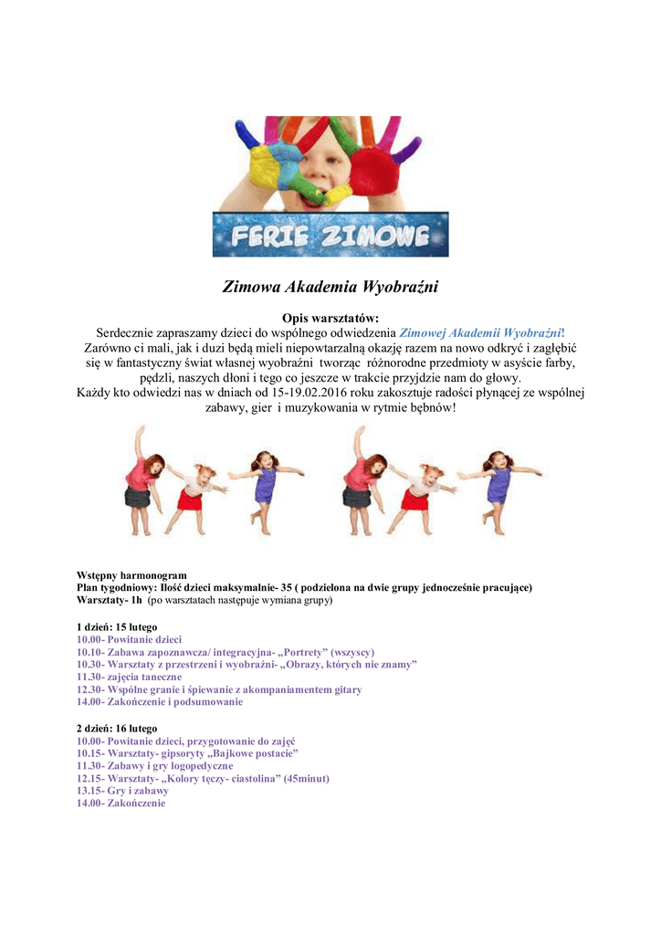 Zimowa Akademia Wyobra ni Opis warsztatów: Serdecznie zapraszamy dzieci do wspólnego odwiedzenia Zimowej Akademii Wyobra ni! Zarówno ci mali, jak i duzi b mieli niepowtarzaln okazj razem na nowo odkry i zag bi si w fantastyczny wiat w asnej wyobra ni tworz c ró norodne przedmioty w asy cie farby, dzli, naszych d oni i tego co jeszcze w trakcie przyjdzie nam do g owy. Ka dy kto odwiedzi nas w dniach od 15-19.02.2016 roku zakosztuje rado ci p yn cej ze wspólnej zabawy, gier i muzykowania w rytmie b bnów! Wst pny harmonogram Plan tygodniowy: Ilo dzieci maksymalnie- 35 ( podzielona na dwie grupy jednocze nie pracuj ce) Warsztaty- 1h (po warsztatach nast puje wymiana grupy) 1 dzie : 15 lutego 10.00- Powitanie dzieci 10.10- Zabawa zapoznawcza/ integracyjna- „Portrety” (wszyscy) 10.30- Warsztaty z przestrzeni i wyobra ni- „Obrazy, których nie znamy” 11.30- zaj cia taneczne 12.30- Wspólne granie i piewanie z akompaniamentem gitary 14.00- Zako czenie i podsumowanie 2 dzie : 16 lutego 10.00- Powitanie dzieci, przygotowanie do zaj 10.15- Warsztaty- gipsoryty „Bajkowe postacie” 11.30- Zabawy i gry logopedyczne 12.15- Warsztaty- „Kolory t czy- ciastolina” (45minut) 13.15- Gry i zabawy 14.00- Zako czenie 3 dzie : 17 lutego 10.00- Powitanie dzieci 10.10- Warsztaty: rze bienie w mydle „M dra Pani Sowa”, „Zimowe serduszka” 11.30- Zaj cia taneczne 12.30- Gry i zabawy integracyjne 14.00- Zako czenie 4 dzie : 18 lutego 10.00- Powitanie dzieci 10.10- Zabawa „oczko”(wspólnie) 10.30- Warsztaty plastyczne: „ W mojej wyobra ni”- konkurs plastyczny dla dzieci 11.30- Zaj cia taneczne 13.45- Og oszenie wyników konkursu plastycznego 14.00- Zako czenie 5 dzie : 19 lutego Akcja Afrykacja 10.00- Powitanie dzieci 10.15- Warsztaty- b bniarskie „Zimowa akcja Afrykacja!” (45min- 1 grupa/ oko o 12 osób ) 10.15- Warsztaty – tworzymy instrumenty (2 grupa) 11.30- Warsztaty b bniarskie „Zimowa akcja Afrykacja!” (45min- 2 grupa) 11.30- Warsztaty- tworzymy instrumenty (1 grupa) 12.30- Prezentacja uk adu tanecznego 14.00- Zako czenie ZAPISY DZIECI do dnia 10 lutego 600 947 398