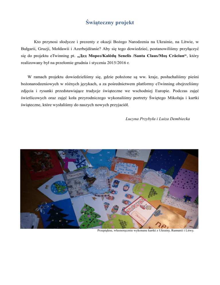 Świąteczny projekt Kto przynosi słodycze i prezenty z okazji Bożego Narodzenia na Ukrainie, na Litwie, w Bułgarii, Gruzji, Mołdawii i Azerbejdżanie? Aby się tego dowiedzieć, postanowiliśmy przyłączyć się do projektu eTwinning pt. „Дед Мороз/Kalėdų Senelis /Santa Claus/Moș Crăciun“, który realizowany był na przełomie grudnia i stycznia 2015/2016 r. W ramach projektu dowiedzieliśmy się, gdzie położone są ww. kraje, posłuchaliśmy pieśni bożonarodzeniowych w różnych językach, a za pośrednictwem platformy eTwinning obejrzeliśmy zdjęcia i rysunki przedstawiające tradycje świąteczne we wschodniej Europie. Podczas zajęć świetlicowych oraz zajęć koła przyrodniczego wykonaliśmy portrety Świętego Mikołaja i kartki świąteczne, które wysłaliśmy do naszych nowych przyjaciół. Lucyna Przybyła i Luiza Dembiecka Przepiękne, własnoręcznie wykonane kartki z Ukrainy, Rumunii i Litwy. Zajęcia świetlicowe w naszej szkole.
