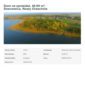 Dom na sprzedaż, 40.00 m², Sosnowica, Nowy Orzechów Numer oferty: 10316 Lokalizacja Sosnowica, Nowy Orzechów Rok budowy 2007 Metraż 40.00 m² Kształt działki prostokąt Cena 65000.00 PLN Cena za m² 1625.00 PLN Oferta dotyczy sprzedaży nieruchomości składającej się z 2 działek o łącznej pow. 1000 m2, ogrodzonych, częściowo zagospodarowanych. Na działce znajduje się domek z przerobionego barakowozu (remont 2007 rok)w dobrym stanie technicznym. Media: - gaz/butla - woda/własna - prąd/ siła - szambo Dojazd drogą asfaltową i utwardzoną. Do obejrzenia po wcześniejszym umówieniu się. Nr oferty: 10316 Treść niniejszego ogłoszenia nie stanowi oferty handlowej w rozumieniu Kodeksu Cywilnego. Treść ma charakter informacyjny i zalecamy ich osobistą weryfikację. Kontaktując się z biurem Klient wyraża zgodę na przetwarzanie danych osobowych zgodnie z przepisami ustawy z dnia 29 sierpnia 1997 roku o ochronie danych osobowych / Dz.U.Nr. 133 poz. 883/. Klientowi przysługuje prawo do wglądu do swoich danych osobowych i ich aktualizacji Opiekun oferty Grzegorz Flis Tel.: 535991886 [email protected] Jestśmy do Państwa dyspozycji 7 dni w tygodniu, w godz. 8:00-22:00.