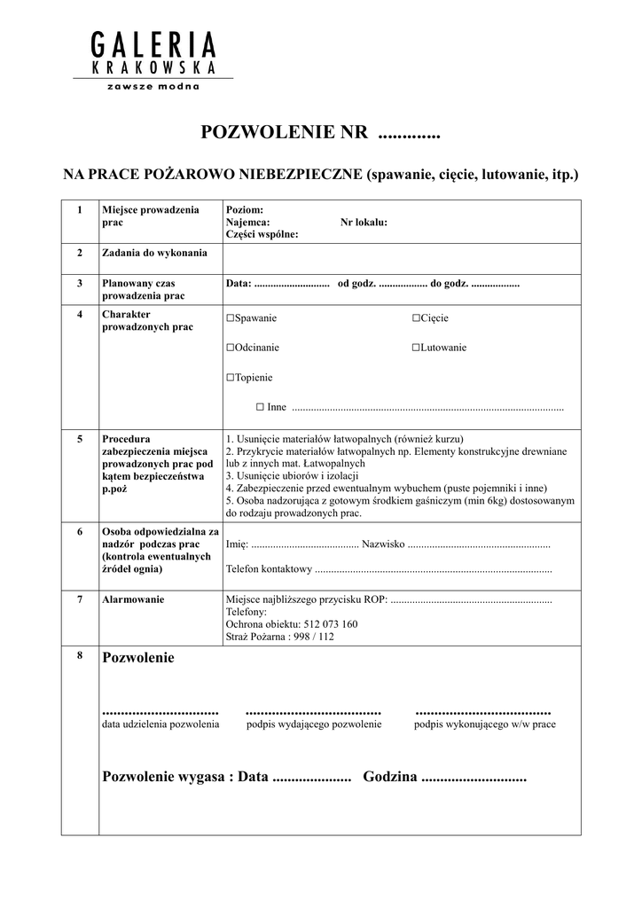 POZWOLENIE NR ............. NA PRACE POŻAROWO NIEBEZPIECZNE (spawanie, cięcie, lutowanie, itp.) 1 Miejsce prowadzenia prac Poziom: Najemca: Części wspólne: Nr lokalu: 2 Zadania do wykonania 3 Planowany czas prowadzenia prac Data: ............................ od godz. .................. do godz. .................. 4 Charakter prowadzonych prac □Spawanie □Cięcie □Odcinanie □Lutowanie □Topienie □ Inne ..................................................................................................... 1. Usunięcie materiałów łatwopalnych (również kurzu) 2. Przykrycie materiałów łatwopalnych np. Elementy konstrukcyjne drewniane lub z innych mat. Łatwopalnych 3. Usunięcie ubiorów i izolacji 4. Zabezpieczenie przed ewentualnym wybuchem (puste pojemniki i inne) 5. Osoba nadzorująca z gotowym środkiem gaśniczym (min 6kg) dostosowanym do rodzaju prowadzonych prac. 5 Procedura zabezpieczenia miejsca prowadzonych prac pod kątem bezpieczeństwa p.poż 6 Osoba odpowiedzialna za Imię: ........................................ Nazwisko ..................................................... nadzór podczas prac (kontrola ewentualnych Telefon kontaktowy ........................................................................................ źródeł ognia) 7 Alarmowanie 8 Pozwolenie Miejsce najbliższego przycisku ROP: ............................................................ Telefony: Ochrona obiektu: 512 073 160 Straż Pożarna : 998 / 112 ............................... .................................... .................................... data udzielenia pozwolenia podpis wydającego pozwolenie podpis wykonującego w/w prace Pozwolenie wygasa : Data ..................... Godzina ............................ Kraków, ................................ PROTOKÓŁ NR ........... Kontrola prac niebezpiecznych pożarowo 1 Miejsce prowadzonych prac Zgodne z pozwoleniem Niezgodne z pozwoleniem 2 Charakter prowadzonych prac Zgodny z pozwoleniem Niezgodny z pozwoleniem 3 Godzina rozpoczęcia prac 4 Godzina zakończenia prac 5 Osoba odpowiedzialna za zabezpieczenie prac 6 Sposób zabezpieczenia prac Zgodny z pozwoleniem Niezgodny z pozwoleniem Uwagi:.................................................................. Raport pracownika dokonującego kontroli prac niebezpiecznych pożarowo LP Kontrola 1 Podczas trwania prac 2 1 godzina po zakończeniu prac 3 2 godzina po zakończeniu prac Godzina kontroli .............................................. podpis kontrolującego Uwagi .............................................. podpis pracownika wykonującego prace