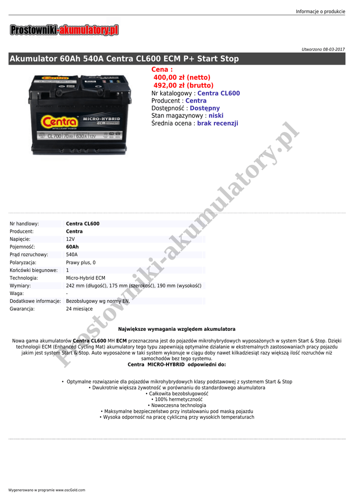 Informacje o produkcie Utworzono 08-03-2017 Akumulator 60Ah 540A Centra CL600 ECM P+ Start Stop Cena : 400,00 zł (netto) 492,00 zł (brutto) um ul at or y. p l Nr katalogowy : Centra CL600 Producent : Centra Dostępność : Dostępny Stan magazynowy : niski Średnia ocena : brak recenzji Centra CL600 Producent: Centra Napięcie: 12V Pojemność: 60Ah Prąd rozruchowy: 540A Polaryzacja: Prawy plus, 0 Końcówki biegunowe: 1 Technologia: Micro-Hybrid ECM Wymiary: 242 mm (długość), 175 mm (szerokość), 190 mm (wysokość) Waga: - Dodatkowe informacje: Bezobsługowy wg normy EN, Gwarancja: 24 miesiące Pr os to w ni ki -a k Nr handlowy: Największe wymagania względem akumulatora Nowa gama akumulatorów Centra CL600 MH ECM przeznaczona jest do pojazdów mikrohybrydowych wyposażonych w system Start & Stop. Dzięki technologii ECM (Enhanced Cycling Mat) akumulatory tego typu zapewniają optymalne działanie w ekstremalnych zastosowaniach pracy pojazdu jakim jest system Start & Stop. Auto wyposażone w taki system wykonuje w ciągu doby nawet kilkadziesiąt razy większą ilość rozruchów niż samochodów bez tego systemu. Centra MICRO-HYBRID odpowiedni do: • Optymalne rozwiązanie dla pojazdów mikrohybrydowych klasy podstawowej z systemem Start & Stop • Dwukrotnie większa żywotność w porównaniu do standardowego akumulatora • Całkowita bezobsługowość • 100% hermetyczność • Nowoczesna technologia • Maksymalne bezpieczeństwo przy instalowaniu pod maską pojazdu • Wysoka odporność na pracę cykliczną przy wysokich temperaturach Wygenerowano w programie www.oscGold.com