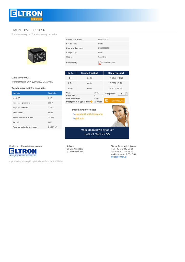 HAHNBVEI3052056 Tr ansfor m ator y > Tr ansfor m ator ydodr uku N a z wa p ro d u ktu : BVEI 3052056 P ro d u c en t: HAHN K o d p ro d u c en ta : BVEI 3052056 C ertyfi ka ty: RoHS Wa g a : 0.116 8 kg Ka rta ka ta logowa D o ku m en ty: O pis pro duktu: Tr ansfor m ator 3VA230V2x9V2x167 m A T a bela pa ra m etró wpro duktu: N a z wa : Wa rto ś ć : M o c VA 3VA N a p i ęc i ep i erwo tn e 230V N a p i ęc i ewtó rn e 2x9 V P ro d u c en t HAHN K l a s a tem p era tu ro wa T a 4 0F R d z eń EI 30 P rą d u z wo j en i a wtó rn eg o 2x16 7mA Ilo ś ć [brutto ] /[netto ] Cena [wa luta ] 5+ netto 7 ,6958 [PLN] 20+ netto 7 ,0991[PLN] 50+ netto 6,8 009[PLN] Vat: Ilośćmin.: Wielokrotność: 23% 5 5sz t. Dostępnewciąg u 3d ni: 2130sz t. Pod ajIlość: 5 + - dokosz yka Maszdodatkowepytania? +48713439755 Wł aści ci el skl epui nter netowego: https://skl ep.el tr on.pl /pl /p/18 47 49513451/bvei 3052056 Adres : 50-07 1Wr ocł aw pl .Wol ności 7 B Biuro O bs ługiKlienta : tel .:+48 7 134397 55 fax+48 7 13441141 Infol i ni apn-pt.8 .00-16.00 skl ep@ el tr on.pl