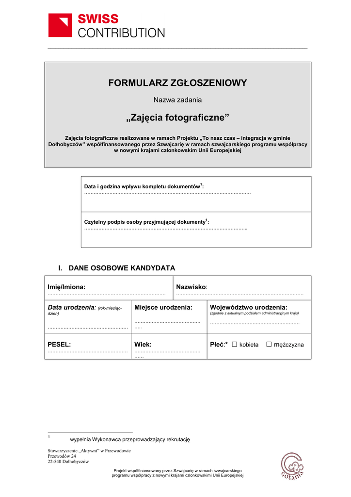___________________________________________________________________________________________________ FORMULARZ ZGŁOSZENIOWY Nazwa zadania „Zajęcia fotograficzne” Zajęcia fotograficzne realizowane w ramach Projektu „To nasz czas – integracja w gminie Dołhobyczów” współfinansowanego przez Szwajcarię w ramach szwajcarskiego programu współpracy w nowymi krajami członkowskim Unii Europejskiej 1 Data i godzina wpływu kompletu dokumentów : ……………………………………………………………………………………………. 1 Czytelny podpis osoby przyjmującej dokumenty : ………………………………………………………………………………………….. I. DANE OSOBOWE KANDYDATA Imię/Imiona: Nazwisko: ………………………………………………………………… ……………………………………………………………………… Data urodzenia: (rok-miesiąc- Miejsce urodzenia: Województwo urodzenia: (zgodnie z aktualnym podziałem administracyjnym kraju) dzień) ………………………………………………… …………………………………………… …………………………………… ….. PESEL: Wiek: Płeć:* …………………………………………… …………………………………… …… 1 □ kobieta □ mężczyzna wypełnia Wykonawca przeprowadzający rekrutację Stowarzyszenie „Aktywni” w Przewodowie Przewodów 24 22-540 Dołhobyczów Projekt współfinansowany przez Szwajcarię w ramach szwajcarskiego programu współpracy z nowymi krajami członkowskimi Unii Europejskiej ___________________________________________________________________________________________________ II. ADRES ZAMIESZKANIA (DO KORESPONDENCJI) Ulica: Nr domu: Nr lokalu: …………………………………………………………………………………… ………………………… …………………………… Kod pocztowy: ……………………………………………… Miejscowość: …………………………………………………………………………… Powiat: ……………………………………………………………………… Gmina: ………………………………………………………………… III. DANE KONTAKTOWE Telefon stacjonarny: Telefon komórkowy: …………………………………………………… ……………………………………………………… Adres e-mail: ………………………………………………………………………………………………………………………………………………… IV. WYKSZTAŁCENIE * □ □ □ □ □ podstawowe gimnazjalne ponadgimnazjalne [wykształcenie średnie lub zasadnicza szkoła zawodowa] pomaturalne [kontynuacja nauki po maturze w innej formie niż studia] wyższe [tytuł licencjata, inżyniera, magistra lub doktora] V. STATUS KANDYDATA * □ osoba bezrobotna □ rolnik □ osoba nieaktywna zawodowo □ uczeń □ osoba zatrudniona □ inne Stowarzyszenie „Aktywni” w Przewodowie Przewodów 24 22-540 Dołhobyczów Projekt współfinansowany przez Szwajcarię w ramach szwajcarskiego programu współpracy z nowymi krajami członkowskimi Unii Europejskiej ___________________________________________________________________________________________________ VI. OŚWIADCZENIE Wyrażam zgodę na udział mojego dziecka w zajęciach fotograficznych realizowanych w ramach projektu „To nasz czas – integracja w gminie Dołhobyczów” współfinansowanego przez Szwajcarię w ramach szwajcarskiego programu współpracy z nowymi krajami członkowskim Unii Europejskiej. Zostałam/zostałem pouczony, że składając dokumenty uczestnictwa w projekcie powinienem/powinnam podać wszystkie dane wskazane w w/w dokumentach zgodnie ze stanem faktycznym istniejącym w momencie ich składania. Oświadczam, że dane zawarte w złożonych przeze mnie dokumentach są zgodne z prawdą. Podanie danych niezgodnych z prawdą będzie rodzić po stronie podającego nieprawdziwe dane odpowiedzialność cywilną względem poszkodowanego. Oświadczam, że zapoznałem/am się, akceptuję i zobowiązuję się do przestrzegania „Regulaminu rekrutacji i realizacji szkoleń w ramach projektu „To nasz czas – integracja ”, w szczególności zobowiązuję się do regularnego udziału w zajęciach. Wyrażam zgodę na przetwarzanie moich danych osobowych przez Gminę Miejską Hrubieszów, Stowarzyszenie „Aktywni” w Przewodowie zgodnie z ustawą z dnia 29.08.1997 r. o ochronie danych osobowych (tj. Dz. U. z 2002 r., nr 101, poz. 926 z późn. zm.). Jednocześnie oświadczam, że akceptuję następujące warunki: 1) administratorem moich danych osobowych jest Gmina Miejska Hrubieszów, Stowarzyszenie „Aktywni” w Przewodowie, 2) moje dane osobowe mogą zostać udostępnione podmiotom realizującym zajęcia, podmiotom wdrażającym i kontrolującym Szwajcarsko-Polski Program Współpracy oraz innym podmiotom w celach związanych z realizacją projektu, 3) podanie danych jest dobrowolne, aczkolwiek odmowa ich podania jest równoznaczna z brakiem możliwości udzielenia wsparcia w ramach Projektu; 4) mam prawo dostępu do treści swoich danych i ich poprawiania. miejscowość i data czytelny podpis rodzica/opiekuna *proszę wstawić znak X przy odpowiedniej pozycji Stowarzyszenie „Aktywni” w Przewodowie Przewodów 24 22-540 Dołhobyczów Projekt współfinansowany przez Szwajcarię w ramach szwajcarskiego programu współpracy z nowymi krajami członkowskimi Unii Europejskiej