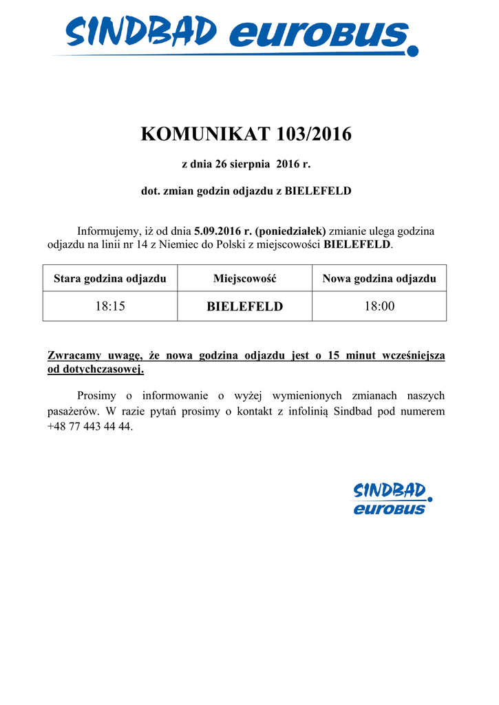 KOMUNIKAT 103/2016 z dnia 26 sierpnia 2016 r. dot. zmian godzin odjazdu z BIELEFELD Informujemy, iż od dnia 5.09.2016 r. (poniedziałek) zmianie ulega godzina odjazdu na linii nr 14 z Niemiec do Polski z miejscowości BIELEFELD. Stara godzina odjazdu Miejscowość Nowa godzina odjazdu 18:15 BIELEFELD 18:00 Zwracamy uwagę, że nowa godzina odjazdu jest o 15 minut wcześniejsza od dotychczasowej. Prosimy o informowanie o wyżej wymienionych zmianach naszych pasażerów. W razie pytań prosimy o kontakt z infolinią Sindbad pod numerem +48 77 443 44 44.