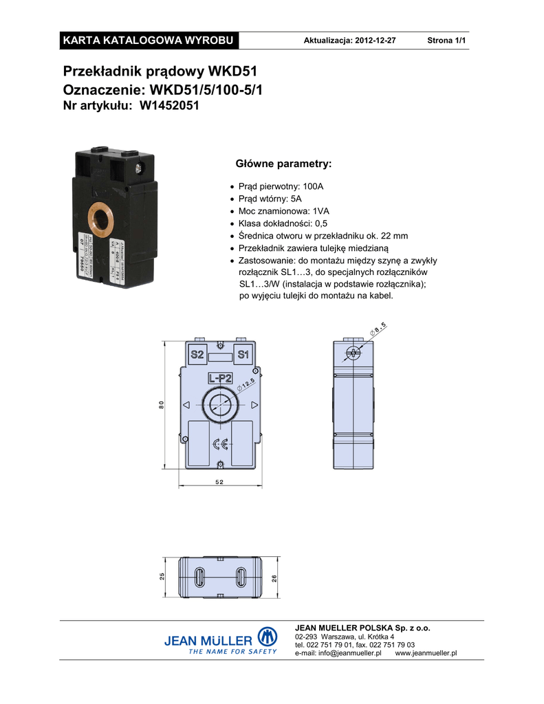 KARTA KATALOGOWA WYROBU Aktualizacja: 2012-12-27 Strona 1/1 Przekładnik prądowy WKD51 Oznaczenie: WKD51/5/100-5/1 Nr artykułu: W1452051 Główne parametry: • • • • • • • Prąd pierwotny: 100A Prąd wtórny: 5A Moc znamionowa: 1VA Klasa dokładności: 0,5 Średnica otworu w przekładniku ok. 22 mm Przekładnik zawiera tulejkę miedzianą Zastosowanie: do montażu między szynę a zwykły rozłącznik SL1…3, do specjalnych rozłączników SL1…3/W (instalacja w podstawie rozłącznika); po wyjęciu tulejki do montażu na kabel. JEAN MUELLER POLSKA Sp. z o.o. 02-293 Warszawa, ul. Krótka 4 tel. 022 751 79 01, fax. 022 751 79 03 e-mail: [email protected] www.jeanmueller.pl