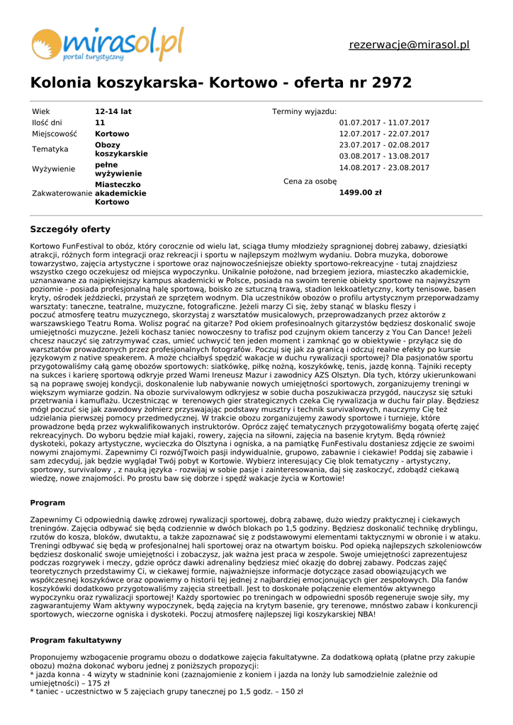 [email protected] Kolonia koszykarska- Kortowo - oferta nr 2972 Wiek 12-14 lat Ilość dni 11 01.07.2017 - 11.07.2017 Miejscowość Kortowo 12.07.2017 - 22.07.2017 Tematyka Obozy koszykarskie 23.07.2017 - 02.08.2017 Wyżywienie pełne wyżywienie 14.08.2017 - 23.08.2017 Miasteczko Zakwaterowanie akademickie Kortowo Terminy wyjazdu: 03.08.2017 - 13.08.2017 Cena za osobę 1499.00 zł Szczegóły oferty Kortowo FunFestival to obóz, który corocznie od wielu lat, sciąga tłumy młodzieży spragnionej dobrej zabawy, dziesiątki atrakcji, różnych form integracji oraz rekreacji i sportu w najlepszym możlwym wydaniu. Dobra muzyka, doborowe towarzystwo, zajęcia artystyczne i sportowe oraz najnowocześniejsze obiekty sportowo-rekreacyjne - tutaj znajdziesz wszystko czego oczekujesz od miejsca wypoczynku. Unikalnie położone, nad brzegiem jeziora, miasteczko akademickie, uznanawane za najpiękniejszy kampus akademicki w Polsce, posiada na swoim terenie obiekty sportowe na najwyższym poziomie - posiada profesjonalną halę sportową, boisko ze sztuczną trawą, stadion lekkoatletyczny, korty tenisowe, basen kryty, ośrodek jeździecki, przystań ze sprzętem wodnym. Dla uczestników obozów o profilu artystycznym przeporwadzamy warsztaty: taneczne, teatralne, muzyczne, fotograficzne. Jeżeli marzy Ci się, żeby stanąć w blasku fleszy i poczuć atmosferę teatru muzycznego, skorzystaj z warsztatów musicalowych, przeprowadzanych przez aktorów z warszawskiego Teatru Roma. Wolisz pograć na gitarze? Pod okiem profesinoalnych gitarzystów będziesz doskonalić swoje umiejętności muzyczne. Jeżeli kochasz taniec nowoczesny to trafisz pod czujnym okiem tancerzy z You Can Dance! Jeżeli chcesz nauczyć się zatrzymywać czas, umieć uchwycić ten jeden moment i zamknąć go w obiektywie - przyłącz się do warsztatów prowadzonych przez profesjonalnych fotografów. Poczuj się jak za granicą i odczuj realne efekty po kursie językowym z native speakerem. A może chciałbyś spędzić wakacje w duchu rywalizacji sportowej? Dla pasjonatów sportu przygotowaliśmy całą gamę obozów sportowych: siatkówkę, piłkę nożną, koszykówkę, tenis, jazdę konną. Tajniki recepty na sukces i karierę sportową odkryje przed Wami Ireneusz Mazur i zawodnicy AZS Olsztyn. Dla tych, którzy ukierunkowani są na poprawę swojej kondycji, doskonalenie lub nabywanie nowych umiejętności sportowych, zorganizujemy treningi w większym wymiarze godzin. Na obozie survivalowym odkryjesz w sobie ducha poszukiwacza przygód, nauczysz się sztuki przetrwania i kamuflażu. Uczestnicząc w terenowych gier strategicznych czeka Cię rywalizacja w duchu fair play. Będziesz mógł poczuć się jak zawodowy żołnierz przyswajając podstawy musztry i technik survivalowych, nauczymy Cię też udzielania pierwszej pomocy przedmedycznej. W trakcie obozu zorganizujemy zawody sportowe i turnieje, które prowadzone będą przez wykwalifikowanych instruktorów. Oprócz zajęć tematycznych przygotowaliśmy bogatą ofertę zajęć rekreacyjnych. Do wyboru będzie miał kajaki, rowery, zajęcia na siłowni, zajęcia na basenie krytym. Będą również dyskoteki, pokazy artystyczne, wycieczka do Olsztyna i ogniska, a na pamiątkę FunFestivalu dostaniesz zdjęcie ze swoimi nowymi znajomymi. Zapewnimy Ci rozwójTwoich pasji indywidualnie, grupowo, zabawnie i ciekawie! Poddaj się zabawie i sam zdecyduj, jak będzie wyglądał Twój pobyt w Kortowie. Wybierz interesujący Cię blok tematyczny - artystyczny, sportowy, survivalowy , z nauką języka - rozwijaj w sobie pasje i zainteresowania, daj się zaskoczyć, zdobądź ciekawą wiedzę, nowe znajomości. Po prostu baw się dobrze i spędź wakacje życia w Kortowie! Program Zapewnimy Ci odpowiednią dawkę zdrowej rywalizacji sportowej, dobrą zabawę, dużo wiedzy praktycznej i ciekawych treningów. Zajęcia odbywać się będą codziennie w dwóch blokach po 1,5 godziny. Będziesz doskonalić technikę dryblingu, rzutów do kosza, bloków, dwutaktu, a także zapoznawać się z podstawowymi elementami taktycznymi w obronie i w ataku. Treningi odbywać się będą w profesjonalnej hali sportowej oraz na otwartym boisku. Pod opieką najlepszych szkoleniowców będziesz doskonalić swoje umiejętności i zobaczysz, jak ważna jest praca w zespole. Swoje umiejętności zaprezentujesz podczas rozgrywek i meczy, gdzie oprócz dawki adrenaliny będziesz mieć okazję do dobrej zabawy. Podczas zajęć teoretycznych przedstawimy Ci, w ciekawej formie, najważniejsze informacje dotyczące zasad obowiązujących we współczesnej koszykówce oraz opowiemy o historii tej jednej z najbardziej emocjonujących gier zespołowych. Dla fanów koszykówki dodatkowo przygotowaliśmy zajęcia streetball. Jest to doskonałe połączenie elementów aktywnego wypoczynku oraz rywalizacji sportowej! Każdy sportowiec po treningach w odpowiedni sposób regeneruje swoje siły, my zagwarantujemy Wam aktywny wypoczynek, będą zajęcia na krytym basenie, gry terenowe, mnóstwo zabaw i konkurencji sportowych, wieczorne ogniska i dyskoteki. Poczuj atmosferę najlepszej ligi koszykarskiej NBA! Program fakultatywny Proponujemy wzbogacenie programu obozu o dodatkowe zajęcia fakultatywne. Za dodatkową opłatą (płatne przy zakupie obozu) można dokonać wyboru jednej z poniższych propozycji: * jazda konna - 4 wizyty w stadninie koni (zaznajomienie z koniem i jazda na lonży lub samodzielnie zależnie od umiejętności) – 175 zł * taniec - uczestnictwo w 5 zajęciach grupy tanecznej po 1,5 godz. – 150 zł * tenis - 4 treningi po 1,5 godz. na korcie tenisowym z partnerem do gry oraz instruktorem – 150 zł * fotografia - uczestnictwo w 5 zajęciach grupy fotograficznej po 1,5 godz. – 150 zł * gotowanie - uczestnictwo w 4 zajęciach grupy Master Cook po 2 godz. – 150 zł Zakwaterowanie Dom studencki, pokoje 2 osobowe z łazienkami. W akademiku znajduje się świetlica, sala TV, całodobowa recepcja.