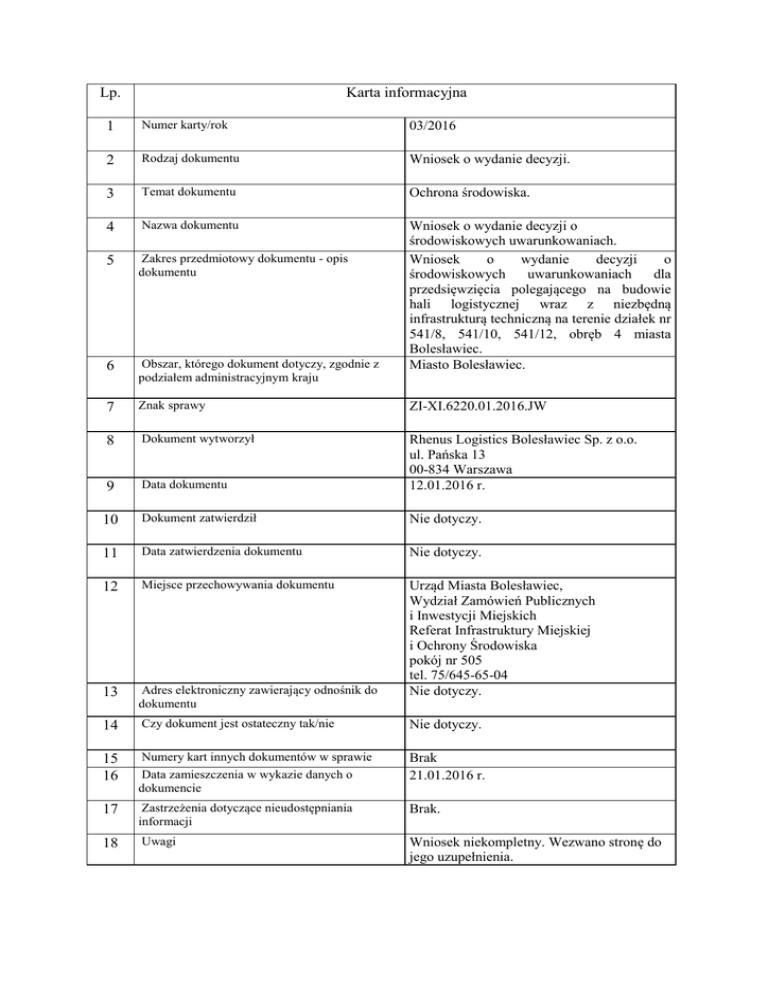 Lp. Karta informacyjna 1 Numer karty/rok 03/2016 2 Rodzaj dokumentu Wniosek o wydanie decyzji. 3 Temat dokumentu Ochrona środowiska. 4 Nazwa dokumentu 5 Zakres przedmiotowy dokumentu - opis dokumentu 6 Obszar, którego dokument dotyczy, zgodnie z podziałem administracyjnym kraju Wniosek o wydanie decyzji o środowiskowych uwarunkowaniach. Wniosek o wydanie decyzji o środowiskowych uwarunkowaniach dla przedsięwzięcia polegającego na budowie hali logistycznej wraz z niezbędną infrastrukturą techniczną na terenie działek nr 541/8, 541/10, 541/12, obręb 4 miasta Bolesławiec. Miasto Bolesławiec. 7 Znak sprawy ZI-XI.6220.01.2016.JW 8 Dokument wytworzył 9 Data dokumentu Rhenus Logistics Bolesławiec Sp. z o.o. ul. Pańska 13 00-834 Warszawa 12.01.2016 r. 10 Dokument zatwierdził Nie dotyczy. 11 Data zatwierdzenia dokumentu Nie dotyczy. 12 Miejsce przechowywania dokumentu 13 Adres elektroniczny zawierający odnośnik do dokumentu Urząd Miasta Bolesławiec, Wydział Zamówień Publicznych i Inwestycji Miejskich Referat Infrastruktury Miejskiej i Ochrony Środowiska pokój nr 505 tel. 75/645-65-04 Nie dotyczy. 14 Czy dokument jest ostateczny tak/nie Nie dotyczy. 15 16 Numery kart innych dokumentów w sprawie Data zamieszczenia w wykazie danych o dokumencie Brak 21.01.2016 r. 17 Zastrzeżenia dotyczące nieudostępniania informacji Brak. 18 Uwagi Wniosek niekompletny. Wezwano stronę do jego uzupełnienia.