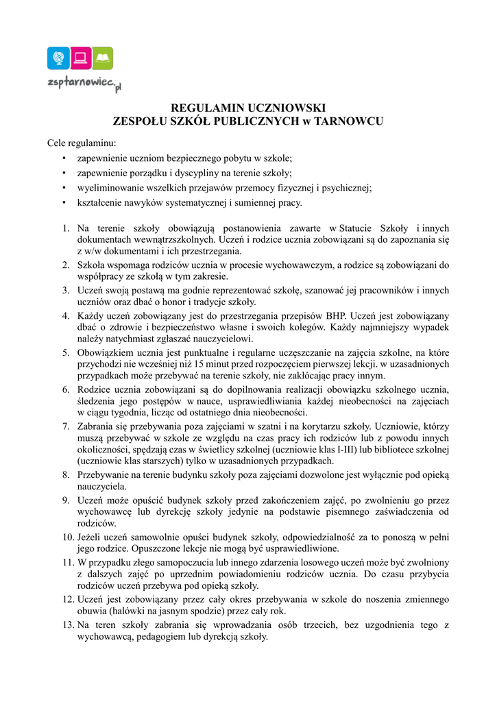 REGULAMIN UCZNIOWSKI ZESPOŁU SZKÓŁ PUBLICZNYCH w TARNOWCU Cele regulaminu: • zapewnienie uczniom bezpiecznego pobytu w szkole; • zapewnienie porządku i dyscypliny na terenie szkoły; • wyeliminowanie wszelkich przejawów przemocy fizycznej i psychicznej; • kształcenie nawyków systematycznej i sumiennej pracy. 1. Na terenie szkoły obowiązują postanowienia zawarte w Statucie Szkoły i innych dokumentach wewnątrzszkolnych. Uczeń i rodzice ucznia zobowiązani są do zapoznania się z w/w dokumentami i ich przestrzegania. 2. Szkoła wspomaga rodziców ucznia w procesie wychowawczym, a rodzice są zobowiązani do współpracy ze szkołą w tym zakresie. 3. Uczeń swoją postawą ma godnie reprezentować szkołę, szanować jej pracowników i innych uczniów oraz dbać o honor i tradycje szkoły. 4. Każdy uczeń zobowiązany jest do przestrzegania przepisów BHP. Uczeń jest zobowiązany dbać o zdrowie i bezpieczeństwo własne i swoich kolegów. Każdy najmniejszy wypadek należy natychmiast zgłaszać nauczycielowi. 5. Obowiązkiem ucznia jest punktualne i regularne uczęszczanie na zajęcia szkolne, na które przychodzi nie wcześniej niż 15 minut przed rozpoczęciem pierwszej lekcji. w uzasadnionych przypadkach może przebywać na terenie szkoły, nie zakłócając pracy innym. 6. Rodzice ucznia zobowiązani są do dopilnowania realizacji obowiązku szkolnego ucznia, śledzenia jego postępów w nauce, usprawiedliwiania każdej nieobecności na zajęciach w ciągu tygodnia, licząc od ostatniego dnia nieobecności. 7. Zabrania się przebywania poza zajęciami w szatni i na korytarzu szkoły. Uczniowie, którzy muszą przebywać w szkole ze względu na czas pracy ich rodziców lub z powodu innych okoliczności, spędzają czas w świetlicy szkolnej (uczniowie klas I-III) lub bibliotece szkolnej (uczniowie klas starszych) tylko w uzasadnionych przypadkach. 8. Przebywanie na terenie budynku szkoły poza zajęciami dozwolone jest wyłącznie pod opieką nauczyciela. 9. Uczeń może opuścić budynek szkoły przed zakończeniem zajęć, po zwolnieniu go przez wychowawcę lub dyrekcję szkoły jedynie na podstawie pisemnego zaświadczenia od rodziców. 10. Jeżeli uczeń samowolnie opuści budynek szkoły, odpowiedzialność za to ponoszą w pełni jego rodzice. Opuszczone lekcje nie mogą być usprawiedliwione. 11. W przypadku złego samopoczucia lub innego zdarzenia losowego uczeń może być zwolniony z dalszych zajęć po uprzednim powiadomieniu rodziców ucznia. Do czasu przybycia rodziców uczeń przebywa pod opieką szkoły. 12. Uczeń jest zobowiązany przez cały okres przebywania w szkole do noszenia zmiennego obuwia (halówki na jasnym spodzie) przez cały rok. 13. Na teren szkoły zabrania się wprowadzania osób trzecich, bez uzgodnienia tego z wychowawcą, pedagogiem lub dyrekcją szkoły. 14. Na terenie szkoły i w jej okolicach obowiązuje zakaz palenia papierosów, e-papierosów, spożywania napojów alkoholowych, środków odurzających oraz ich rozprowadzania. 15. Niedopuszczalne jest, aby uczeń używał wulgarnego słownictwa i zachowywał się agresywnie oraz stosował przemoc wobec innych na terenie szkoły i poza nią. 16. Obowiązuje zakaz przynoszenia do szkoły niebezpiecznych przedmiotów, np. petard, ostrych narzędzi, laserów itp. 17. Za rzeczy wartościowe, odzież niezabezpieczoną w szatni i przedmioty porzucone przez ucznia, szkoła nie ponosi odpowiedzialności. Obowiązkiem ucznia jest ochrona i zabezpieczenie własności prywatnej przed zniszczeniem i kradzieżą. 18. W przypadku konieczności wniesienia wartościowych rzeczy na teren szkoły należy je zdeponować u nauczyciela. 19. Uczniowi nie wolno, bez zgody nauczyciela korzystać z telefonu komórkowego podczas trwania zajęć lekcyjnych. Nauczyciel, który podczas prowadzenia zajęć zauważy u ucznia włączony telefon ma prawo go zarekwirować, a po odbiór ma zgłosić się rodzic ucznia. 20. Uczniów obowiązuje zakaz filmowania, nagrywania, robienia zdjęć podczas lekcji i przerw śródlekcyjnych. 21. W czasie przerwy uczeń nie może pozostawać w sali lekcyjnej, która w tym czasie powinna być zamknięta. 22. Podczas przerw obowiązuje zakaz: a) bezzasadnego przebywania w toaletach; b) opuszczania budynku szkoły; c) biegania, grania w piłkę na korytarzu szkolnym oraz innych niebezpiecznych zabaw; d) uprawiania hazardu; e) otwierania okien bez zgody nauczyciela dyżurującego; f) siadania na parapetach; g) zaśmiecania, brudzenia, plucia. 23. W stołówce szkolnej mogą przebywać jedynie ci uczniowie, którzy spożywają posiłek. 24. Uczeń jest zobowiązany do pozostawiania pomieszczeń, w których przebywa w należytym porządku. Ma obowiązek przeciwdziałać wszelkim przejawom nieodpowiedzialności, marnotrawstwa i niszczenia majątku szkolnego. 25. Każdy uczeń jest zobowiązany do codziennego noszenia Dzienniczka Ucznia. Wszelkie informacje wpisane przez nauczyciela lub na jego polecenie muszą być podpisane przez rodziców ucznia i bezzwłocznie przedstawione nauczycielowi do wglądu. w klasach młodszych dopuszcza się stosowanie także innych form przekazywania rodzicom informacji o uczniu. 26. Rodzice ucznia ponoszą odpowiedzialność materialną za zniszczenia dokonane przez ich dziecko na terenie szkoły. 27. Rodzice winni konsultować się z nauczycielami, pedagogiem lub dyrekcją szkoły na wywiadówkach, w wyznaczonych dniach konsultacji nauczycieli lub po wcześniejszym uzgodnieniu terminu spotkania. 28. Uczeń ma obowiązek przestrzegać obowiązujących w szkole regulaminów. 29. Wobec uczniów, którzy nie przestrzegają obowiązujących regulaminów i łamią podstawowe zasady współżycia, za każde przewinienie stosuje się kary statutowe.