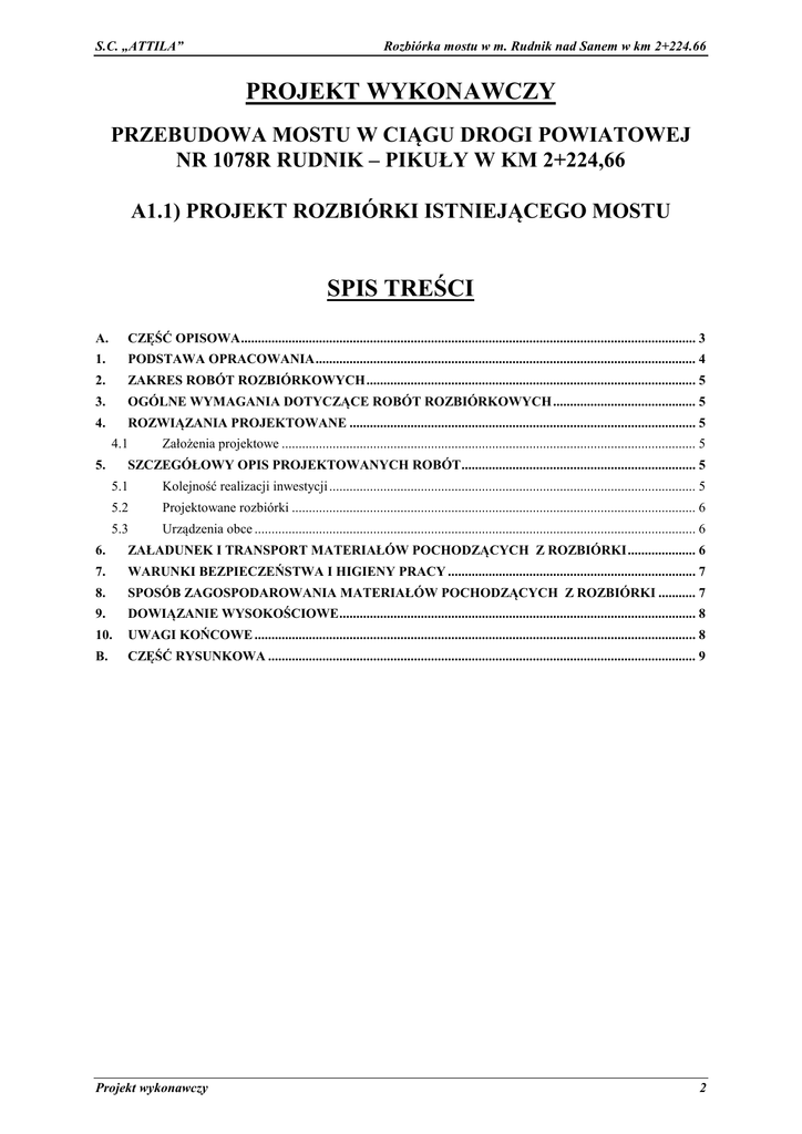 S.C. „ATTILA” Rozbiórka mostu w m. Rudnik nad Sanem w km 2+224.66 PROJEKT WYKONAWCZY PRZEBUDOWA MOSTU W CIĄGU DROGI POWIATOWEJ NR 1078R RUDNIK – PIKUŁY W KM 2+224,66 A1.1) PROJEKT ROZBIÓRKI ISTNIEJĄCEGO MOSTU SPIS TREŚCI A. CZĘŚĆ OPISOWA ...................................................................................................................................... 3 1. PODSTAWA OPRACOWANIA ................................................................................................................ 4 2. ZAKRES ROBÓT ROZBIÓRKOWYCH ................................................................................................. 5 3. OGÓLNE WYMAGANIA DOTYCZĄCE ROBÓT ROZBIÓRKOWYCH .......................................... 5 4. ROZWIĄZANIA PROJEKTOWANE ...................................................................................................... 5 4.1 Założenia projektowe .......................................................................................................................... 5 SZCZEGÓŁOWY OPIS PROJEKTOWANYCH ROBÓT ..................................................................... 5 5. 5.1 Kolejność realizacji inwestycji ............................................................................................................ 5 5.2 Projektowane rozbiórki ....................................................................................................................... 6 5.3 Urządzenia obce .................................................................................................................................. 6 6. ZAŁADUNEK I TRANSPORT MATERIAŁÓW POCHODZĄCYCH Z ROZBIÓRKI .................... 6 7. WARUNKI BEZPIECZEŃSTWA I HIGIENY PRACY ......................................................................... 7 8. SPOSÓB ZAGOSPODAROWANIA MATERIAŁÓW POCHODZĄCYCH Z ROZBIÓRKI ........... 7 9. DOWIĄZANIE WYSOKOŚCIOWE ......................................................................................................... 8 10. UWAGI KOŃCOWE .................................................................................................................................. 8 B. CZĘŚĆ RYSUNKOWA .............................................................................................................................. 9 Projekt wykonawczy 2 S.C. „ATTILA” Rozbiórka mostu w m. Rudnik nad Sanem w km 2+224.66 A. CZĘŚĆ OPISOWA Projekt wykonawczy 3 S.C. „ATTILA” Rozbiórka mostu w m. Rudnik nad Sanem w km 2+224.66 OPIS TECHNICZNY 1. PODSTAWA OPRACOWANIA Podstawą opracowania są następujące dokumenty: [1]. Umowa nr GM.272.6.2012.I z dnia 6.04.2012 zawarta pomiędzy Powiatem Niżańskim, Pl. Wolności 2 37-400 Nisko, reprezentowanym przez Zarząd Powiatu a S.C. „ATTILA” M. Królicki, W. Jóźwiak ul. Marcina Filipa 56/12, 35-323 Rzeszów, [2]. Mapa do celów projektowych opracowana na podstawie aktualizacji mapy zasadniczej, przyjęta do zasobu Powiatowego Ośrodka Dokumentacji Geodezyjnej i Kartograficznej w Nisku w dniu 07.05.2012 pod nr 2990-51/2012, [3]. Dokumentacja geologiczno inżynierska na przebudowę DP nr 1078R Rudnik – Pikuły, wykonana przez „Usługi geologiczne Tadeusz Śloński” 35-505 Rzeszów, ul. Kościelna 29, kwiecień 2012r. [4]. Wypis z rejestru gruntów oraz Wycinek z Mapy Ewidencyjnej obręb Rudnik z dnia 16.05.2012, [5]. Decyzja o ustaleniu lokalizacji inwestycji celu publicznego o znaczeniu lokalnym, znak BI.6733.4.2012, wydana przez Wójta gminy Rudnik nad Sanem dnia 08.10.2012r. dla inwestycji obejmującej przebudowę mostu w ciągu drogi powiatowej nr 1078R Rudnik – Pikuły w km 2+224,66 – na działkach nr ewid. 5708/9, 5708/11, 5709, 5710, 5774, 5775, 5776, w miejscowości Rudnik nad Sanem, [6]. Ustawa Prawo Budowlane z dnia 7 lipca 1994 r. (Dz.U. z 2000 r. Nr 103, poz. 1126 z późniejszymi zmianami), wraz z przepisami wykonawczymi, [7]. Madaj A. i Wołowicki W. „Mosty betonowe wymiarowanie i konstruowanie” WKŁ Warszawa 1998, [8]. Katalog Detali Mostowych. GDDP. Warszawa 1997, [9]. Katalog Powtarzalnych Elementów Drogowych. „Transprojekt” Warszawa 1979, [10]. Jarominiak A. Podpory mostów. Wybrane zagadnienia. WKŁ Warszawa 1981, [11]. Jarominiak A. Pale i fundamenty palowe. Arkady, Warszawa 1976, [12]. Szczygieł J., Mosty z betonu zbrojonego i sprężonego. WKŁ, Warszawa 1978, [13]. Stilger-Szydło E., Posadowienia budowli infrastruktury transportu lądowego. DWE, Wrocław 2005, [14]. Tymczasowe wytyczne projektowania fundamentów ze ścian szczelinowych. IBDiM, [15]. PN-85/S-10030. Obiekty mostowe. Obciążenia, [16]. PN-91/S-10042. Obiekty mostowe. Konstrukcje betonowe, żelbetowe i sprężone. Projektowanie, [17]. PN-83/B-03010. Ściany oporowe. Obliczenia statyczne i projektowanie, [18]. PN-81/B-003020. Posadowienie bezpośrednie budowli. Obliczenia statyczne i projektowanie, [19]. PN-EN 206-1 „Beton Część 1: Wymagania, właściwości, produkcja i zgodność. [20]. Rozporządzenie Ministra Transportu i Gospodarki Morskiej z dnia 2 marca 1999r. w sprawie warunków technicznych, jakim powinny odpowiadać drogi publiczne i ich usytuowanie (Dz. U. Nr 43/99, poz. 430), [21]. Rozporządzenie Ministra Transportu i Gospodarki Morskiej z dnia 30 maja 2000r. w sprawie warunków technicznych, jakim powinny odpowiadać drogowe obiekty inżynierskie i ich usytuowanie (Dz. U. Nr 63/00, poz. 735), Projekt wykonawczy 4 S.C. „ATTILA” Rozbiórka mostu w m. Rudnik nad Sanem w km 2+224.66 ZAKRES ROBÓT ROZBIÓRKOWYCH 2. Przedmiotem opracowania jest rozbiórka istniejącego mostu wchodząca w skład inwestycji pn. „Przebudowa mostu w ciągu drogi powiatowej nr 1078r Rudnik nad Sanem – Pikuły w km 2+224.66”. Zaprojektowano całkowitą rozbiórkę wszystkich elementów mostu. W pierwszej kolejności przewiduje się rozebranie elementów przęsła i przyczółków mostu. Ruch kołowy i pieszo - rowerowy na czas przebudowy zostanie zamknięty i 