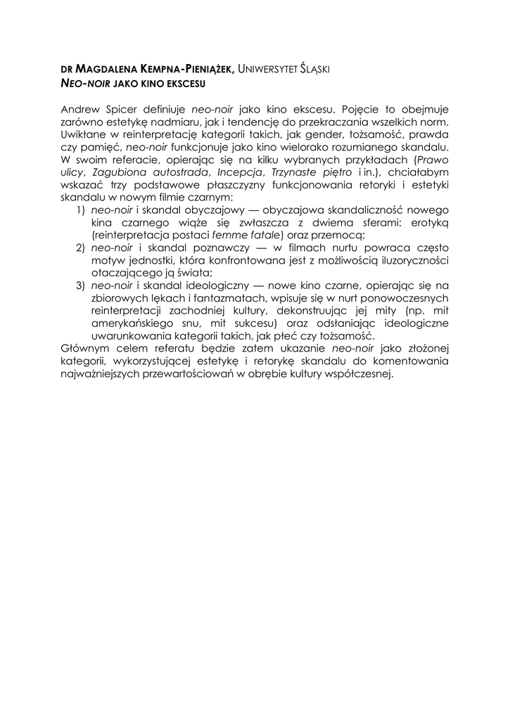 DR MAGDALENA KEMPNA-PIENIĄŻEK, UNIWERSYTET ŚLĄSKI NEO-NOIR JAKO KINO EKSCESU Andrew Spicer definiuje neo-noir jako kino ekscesu. Pojęcie to obejmuje zarówno estetykę nadmiaru, jak i tendencję do przekraczania wszelkich norm. Uwikłane w reinterpretację kategorii takich, jak gender, tożsamość, prawda czy pamięć, neo-noir funkcjonuje jako kino wielorako rozumianego skandalu. W swoim referacie, opierając się na kilku wybranych przykładach (Prawo ulicy, Zagubiona autostrada, Incepcja, Trzynaste piętro i in.), chciałabym wskazać trzy podstawowe płaszczyzny funkcjonowania retoryki i estetyki skandalu w nowym filmie czarnym: 1) neo-noir i skandal obyczajowy — obyczajowa skandaliczność nowego kina czarnego wiąże się zwłaszcza z dwiema sferami: erotyką (reinterpretacja postaci femme fatale) oraz przemocą; 2) neo-noir i skandal poznawczy — w filmach nurtu powraca często motyw jednostki, która konfrontowana jest z możliwością iluzoryczności otaczającego ją świata; 3) neo-noir i skandal ideologiczny — nowe kino czarne, opierając się na zbiorowych lękach i fantazmatach, wpisuje się w nurt ponowoczesnych reinterpretacji zachodniej kultury, dekonstruując jej mity (np. mit amerykańskiego snu, mit sukcesu) oraz odsłaniając ideologiczne uwarunkowania kategorii takich, jak płeć czy tożsamość. Głównym celem referatu będzie zatem ukazanie neo-noir jako złożonej kategorii, wykorzystującej estetykę i retorykę skandalu do komentowania najważniejszych przewartościowań w obrębie kultury współczesnej.