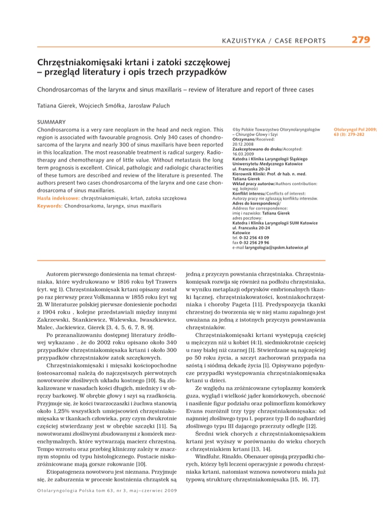 KAZUISTYKA / CASE REPORTS 279 Chrzęstniakomięsaki krtani i zatoki szczękowej – przegląd literatury i opis trzech przypadków Chondrosarcomas of the larynx and sinus maxillaris – review of literature and report of three cases Tatiana Gierek, Wojciech Smółka, Jarosław Paluch SUMMARY Chondrosarcoma is a very rare neoplasm in the head and neck region. This region is associated with favourable prognosis. Only 340 cases of chondrosarcoma of the larynx and nearly 300 of sinus maxillaris have been reported in this localization. The most reasonable treatment is radical surgery. Radiotherapy and chemotherapy are of little value. Without metastasis the long term prognosis is excellent. Clinical, pathologic and radiologic characterities of these tumors are described and review of the literature is presented. The authors present two cases chondrosarcoma of the larynx and one case chondrosarcoma of sinus maxillaries. Hasła indeksowe: chrzęstniakomięsaki, krtań, zatoka szczękowa Keywords: Chondrosarkoma, laryngx, sinus maxillaris Autorem pierwszego doniesienia na temat chrzęstniaka, które wydrukowano w 1816 roku był Trawers (cyt. wg 1). Chrzęstniakomięsak krtani opisany został po raz pierwszy przez Volkmanna w 1855 roku (cyt wg 2). W literaturze polskiej pierwsze doniesienie pochodzi z 1904 roku , kolejne przedstawiali między innymi Zakrzewski, Stankiewicz, Walewska, Iwaszkiewicz, Malec, Jackiewicz, Gierek [3, 4, 5, 6, 7, 8, 9]. Po przeanalizowaniu dostępnej literatury źródłowej wykazano , że do 2002 roku opisano około 340 przypadków chrzęstniakomięsaka krtani i około 300 przypadków chrzęstniaków zatok szczękowych. Chrzęstniakomięsaki i mięsaki kościopochodne (osteosarcoma) należą do najczęstszych pierwotnych nowotworów złośliwych układu kostnego [10]. Są zlokalizowane w nasadach kości długich, miednicy i w obręczy barkowej. W obrębie głowy i szyi są rzadkością. Przyjmuje się, że kości twarzoczaszki i żuchwa stanowią około 1,25% wszystkich umiejscowień chrzęstniakomięsaka w tkankach człowieka, przy czym dwukrotnie częściej stwierdzany jest w obrębie szczęki [11]. Są nowotworami złośliwymi zbudowanymi z komórek mezenchymalnych, które wytwarzają macierz chrzęstną. Tempo wzrostu oraz przebieg kliniczny zależy w znacznym stopniu od typu histologicznego. Postacie niskozróżnicowane mają gorsze rokowanie [10]. Etiopatogeneza nowotworu jest nieznana. Przyjmuje się, że zaburzenia w procesie kostnienia chrząstek są Otolar yngologia Polska tom 63, nr 3, maj – c zer wiec 20 0 9 ©by Polskie Towarzystwo Otorynolaryngologów – Chirurgów Głowy i Szyi Otrzymano/Received: 20.12.2008 Zaakceptowano do druku/Accepted: 16.03.2009 Katedra i Klinika Laryngologii Śląskiego Uniwersytetu Medycznego Katowice ul. Francuska 20-24 Kierownik Kliniki: Prof. dr hab. n. med. Tatiana Gierek Wkład pracy autorów/Authors contribution: wg. kolejności Konflikt interesu/Conflicts of interest: Autorzy pracy nie zgłaszają konfliktu interesów. Adres do korespondencji/ Address for correspondence: imię i nazwisko: Tatiana Gierek adres pocztowy: Katedra i Klinika Laryngologii SUM Katowice ul. Francuska 20-24 Katowice tel. 0-32 256 43 09 fax 0-32 256 29 96 e-mail [email protected] jedną z przyczyn powstania chrzęstniaka. Chrzęstniakomięsak rozwija się również na podłożu chrzęstniaka, w wyniku metaplazji odprysków embrionalnych tkanki łącznej, chrzęstniakowatości, kostniakochrzęstniaka i choroby Pageta [11]. Predyspozycja tkanki chrzestnej do tworzenia się w niej stanu zapalnego jest uważana za jedną z istotnych przyczyn powstawania chrzęstniaków. Chrzęstniakomięsaki krtani występują częściej u mężczyzn niż u kobiet (4:1), siedmiokrotnie częściej u rasy białej niż czarnej [1]. Stwierdzane są najczęściej po 50 roku życia, a szczyt zachorowań przypada na szóstą i siódmą dekadę życia [1]. Opisywano pojedyncze przypadki występowania chrzęstniakomięsaka krtani u dzieci. Ze względu na zróżnicowane cytoplazmy komórek guza, wygląd i wielkość jąder komórkowych, obecność i nasilenie figur podziału oraz polimorfizm komórkowy Evans rozróżnił trzy typy chrzęstniakomięsaka: od najmniej złośliwego typu I, poprzez typ II do najbardziej złośliwego typu III dającego przerzuty odległe [12]. Średni wiek chorych z chrzęstniakomięsakiem krtani jest wyższy w porównaniu do wieku chorych z chrzęstniakiem krtani [13, 14]. Windfuhr, Rinaldo, Obenauer opisują przypadki chorych, którzy byli leczeni operacyjnie z powodu chrzęstniaka krtani, natomiast wznowa nowotworu miała już typową strukturę chrzęstniakomięsaka [15, 16, 17]. Otolaryngol Pol 2009; 63 (3): 279-282 280 KAZU ISTYKA / CASE REPORTS Ryc. 1. Zmiana guzowata prawej zatoki szczękowej. Ryc. 2. Zmiana guzowata zlokalizowana w obrębie zatoki szczękowej i jamy nosowej po stronie prawej. Evans, Soleh, Faquin opisują przypadki wznów chrzęstniakomięsaka o wysokim stopniu złośliwości (high grade) u chorych leczonych pierwotnie z powodu chrzęstniakomięsaka o niskim stopniu złośliwości (low grade) [12, 18, 19]. W obrębie krtani najczęstszym punktem wyjścia nowotworu jest dystalny odcinek chrząstki pierścieniowatej oraz chrząstka tarczowata ( 90% przypadków). Ponadto chrzęstniakomięsak rozwija się w chrząstkach nalewkowatych, nagłośni i kości gnykowej [1, 20]. Przemiana tkanki chrzęstnej w nowotworową przebiega etapami: chondrometaplazja cechuje się brakiem mitoz, chondroma – mitozy miernie nasilone; chondrosarcoma charakteryzuje się licznymi mitozami [8]. Chrzęstniakomięsak, podobnie jak chrzęstniak to najczęściej gładki, kulisty guz, o twardej konsystencji i pokryty niezmienioną błoną śluzową. W zależności od lokalizacji różne są objawy kliniczne. Gdy punktem wyjścia jest chrząstka pierścieniowata u chorego pojawia się chrypka i stopniowo narastająca duszność. W przypadku nowotworu wycho