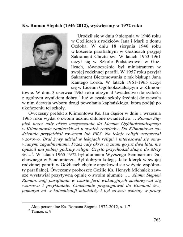 Ks. Roman Stępień (1946-2012), wyświęcony w 1972 roku Urodził się w dniu 9 sierpnia w 1946 roku w Goźlicach z rodziców Jana i Marii z domu Ozdoba. W dniu 18 sierpnia 1946 roku w kościele parafialnym w Goźlicach przyjął Sakrament Chrztu św. W latach 1953-1961 uczył się w Szkole Podstawowej w Goźlicach, równocześnie był ministrantem w swojej rodzinnej parafii. W 1957 roku przyjął Sakrament Bierzmowania z rąk biskupa Jana Kantego Lorka. W latach 1961-1965 uczył się w Liceum Ogólnokształcącym w Klimontowie. W dniu 3 czerwca 1965 roku otrzymał świadectwo dojrzałości z ogólnym wynikiem dobry.1 Już w czasie szkoły średniej dojrzewała w nim decyzja wyboru drogi powołania kapłańskiego, którą podjął po ukończeniu tej szkoły. Ówczesny prefekt z Klimontowa Ks. Jan Gąsior w dniu 1 września 1965 roku wydał o swoim uczniu chlubne świadectwo: …Roman Stępień przez cały okres uczęszczania do Liceum Ogólnokształcącego w Klimontowie zamieszkiwał u swoich rodziców. Do Klimontowa codziennie przyjeżdżał rowerem lub PKS. Na lekcje religii uczęszczał wzorowo. Brał żywy udział w lekcjach religii i interesował się omawianymi zagadnieniami. Przez cały okres, a znam go już dwa lata, nie opuścił ani jednej godziny religii. Często przychodził służyć do Mszy św…2. W latach 1965-1972 był alumnem Wyższego Seminarium Duchownego w Sandomierzu. Był dobrym kolegą. Jako kleryk w swojej rodzinnej parafii w Goźlicach chętnie angażował się w życie wspólnoty parafialnej. Ówczesny proboszcz Goźlic Ks. Henryk Michałek zawsze wystawiał pozytywną opinię o swoim alumnie …. Alumn Stępień Roman, mój parafianin w czasie ferii wakacyjnych zachowywał się wzorowo i przykładnie. Codziennie przystępował do Komunii św., pomagał mi w katechizacji młodzieży i był zawsze usłużny w pracy 1 2 Akta personalne Ks. Romana Stępnia 1972-2012, s. 1-7 Tamże, s. 9 763 parafialnej oraz w różnych dekoracjach przy kościele…3 W dniu 14 listopada 1971 roku w Katedrze w Sandomierzu przyjął święcenia subdiakonatu z rąk biskupa Piotra Gołębiowskiego. Z kolei diakonat otrzymał w dniu 20 lutego 1972 roku także w Bazylice Katedralnej w Sandomierzu z rąk biskupa Piotra Gołębiowskiego. Zwieńczeniem drogi w służbie powołania były święcenia kapłańskie, które otrzymał w dniu 10 czerwca 1972 roku w Katedrze w Sandomierzu z rąk biskupa Piotra Gołębiowskiego.4 Jako wikariusz pracował na różnych placówkach w diecezji w następujących latach: 1972-1974 – Wielka Wola 1974-1975 – Rajec 1975-1977 – Osiek 1977-1979 – Brzóza 1979-1980 – Skrzynno 1980-1981 – Pilczyca 1981-1982 – Miedzierza 1982-1984 – Iwaniska 1984-1986 – Mirzec 1986-1989 – Nowa Słupia 1989 – Waśniów Na ostatnim wikariacie w Waśniowie otrzymał także od władzy diecezjalnej specjalną delegację do tworzenia samodzielnej placówki duszpasterskiej w Boleszynie.5 Został pierwszym proboszczem tej parafii, która została erygowana 1 września 1989 roku.6 Zorganizował tę parafię od podstaw. Dokończył nowo wybudowany kościół i go wyposażył, wybudował plebanię i założył cmentarz grzebalny.7 W dniu 2 sierpnia 1996 roku został przeniesiony na stanowisko proboszcza do parafii Momina, sprawował także urząd wicedziekana dekanatu szewieńskiego.8 W tej wspólnocie parafialnej pra3 Tamże, s. 13 Tamże, s. 34, 39, 46 5 Tamże, s. 47, 48, 54, 59, 68, 73, 77, 80, 87, 90, 95 6 Akta parafii Boleszyn od 1998 roku 7 Akta personalne Ks. Romana Stępnia 1972-2012, s. 97 8 Tamże, s. 107, 113 4 764 cował 11 lat troszcząc się gorliwie o sprawy duchowe i materialne tej parafii. W dniu 27 lipca 2007 roku otrzymał translokatę na probostwo do parafii Baćkowice, pełnił także w dekanacie świętokrzyskim funkcję wicedziekana.9 Prowadził tę wspólnotę parafialną do końca swojego życia również z niezwykłą gorliwością zarówno w wymiarze duchowym i materialnym. W dniu 25 listopada 2006 roku otrzymał godność kanonika honorowego Kapituły Katedralnej w Sandomierzu. Biskup Andrzej Dzięga kierując list do księdza Romana z tej okazji napisał: …W całości dotychczasowych prac Księdza Kanonika na rzecz Diecezji Sandomierskiej należy przywołać przede wszystkim tworzenie od podstaw Parafii w Boleszynie, budowę plebanii oraz wyposażenie wnętrza kościoła parafialnego we wszystko co jest konieczne do sprawowania kultu Bożego. Należy podkreślić to, że prace materialne zawsze są motywowane w posłudze Czcigodnego Księdza wielką miłością pasterską i dbałością o to, by estetyczne wnętrze świątyni i jej otoczenie zachęcało wiernych do wielbienia Boga udziałem we Mszy świętej i innych nabożeństwach ...10 Zmarł nagle w dniu 20 kwietnia 2012 w Baćkowicach. Eksporta ciała zmarłego kapłana z plebanii do Kościoła parafialnego w Baćkowicach nastąpiła w niedzielę 22 kwietnia tegoż roku o godz. 18.00. Na plebanii modlitwie przewodniczył dziekan dekanatu świętokrzyskiego Ks. Kanonik Jerzy Beksiński. Po wprowadzeniu ciała zmarłego kapłana do kościoła parafialnego odmówiono najpierw Koronkę do Bożego Miłosierdzia. O godz. 18.00 rozpoczęła się Msza św. pod przewodnictwem biskupa Edwarda Frankowskiego. Na wstępie Eucharystii biskup powiedział między innymi: …Czas Wielkanocny, w którym radujemy się ze Zmartwychwstania naszego Pana Jezusa Chrystusa, który zwyciężył śmierć, piekło i szatana. Śmierć Chrystusa jak i nasza śmierć, śmierć każdego z nas i Zmartwychwstanie Chrystusa i nasze zmartwychwstanie – wierzymy w to bardzo mocno i jesteśmy pełni nadziei, że Chrystus Najwyższy Kapłan połączył ze sobą sługę swego kapłana, proboszcza tutejszego Księdza Kanonika Romana, który odszedł od nas zaledwie mając 66 lat życia, 40 kapłaństwa, a więc jeszcze mógł wiele pracować i służyć kościołowi i ludziom. Tym bardziej 9 Tamże, s. 124, 132 Tamże, 