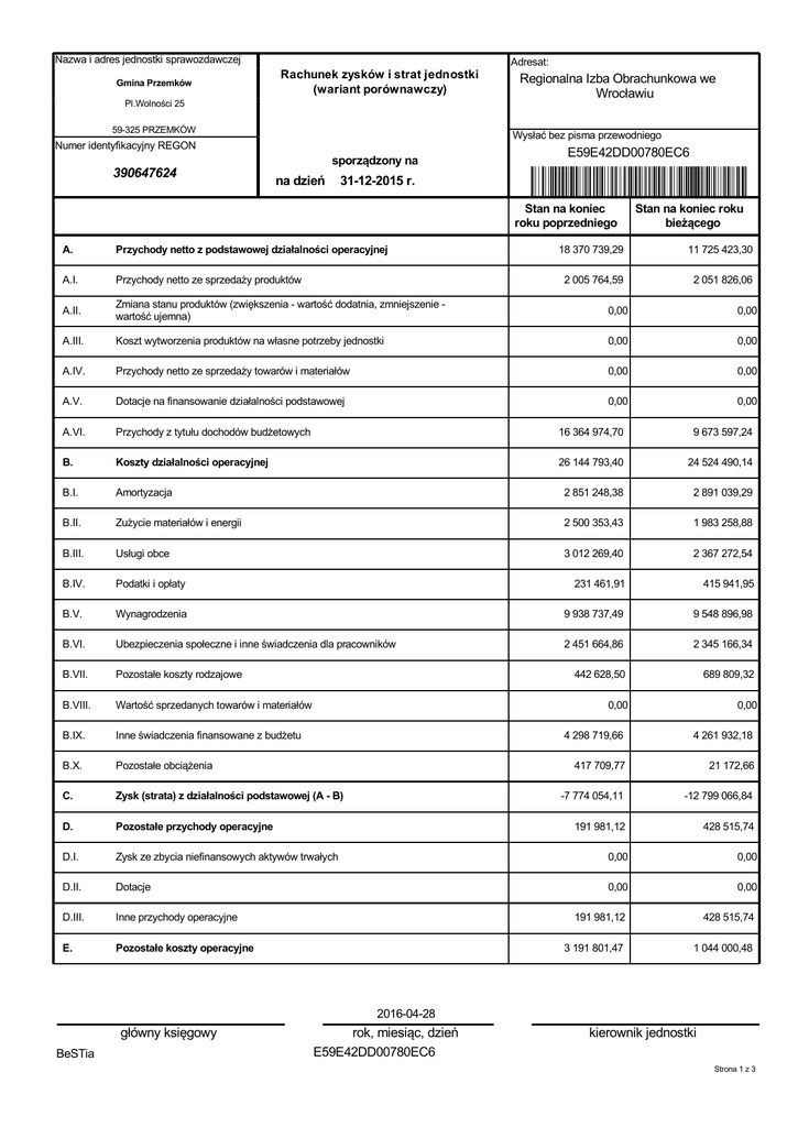 Nazwa i adres jednostki sprawozdawczej Gmina Przemków Pl.Wolności 25 Rachunek zysków i strat jednostki (wariant porównawczy) 59-325 PRZEMKÓW Numer identyfikacyjny REGON 390647624 na dzień sporządzony na 31-12-2015 r. A. Przychody netto z podstawowej działalności operacyjnej A.I. Przychody netto ze sprzedaży produktów A.II. Zmiana stanu produktów (zwiększenia - wartość dodatnia, zmniejszenie wartość ujemna) Adresat: Regionalna Izba Obrachunkowa we Wrocławiu Wysłać bez pisma przewodniego E59E42DD00780EC6 Stan na koniec roku poprzedniego Stan na koniec roku bieżącego 18 370 739,29 11 725 423,30 2 005 764,59 2 051 826,06 0,00 0,00 Koszt wytworzenia produktów na własne potrzeby jednostki 0,00 0,00 A.IV. Przychody netto ze sprzedaży towarów i materiałów 0,00 0,00 A.V. Dotacje na finansowanie działalności podstawowej 0,00 0,00 A.VI. Przychody z tytułu dochodów budżetowych 16 364 974,70 9 673 597,24 B. Koszty działalności operacyjnej 26 144 793,40 24 524 490,14 B.I. Amortyzacja 2 851 248,38 2 891 039,29 B.II. Zużycie materiałów i energii 2 500 353,43 1 983 258,88 B.III. Usługi obce 3 012 269,40 2 367 272,54 B.IV. Podatki i opłaty 231 461,91 415 941,95 B.V. Wynagrodzenia 9 938 737,49 9 548 896,98 B.VI. Ubezpieczenia społeczne i inne świadczenia dla pracowników 2 451 664,86 2 345 166,34 B.VII. Pozostałe koszty rodzajowe 442 628,50 689 809,32 B.VIII. Wartość sprzedanych towarów i materiałów 0,00 0,00 B.IX. Inne świadczenia finansowane z budżetu B.X. Pozostałe obciążenia C. Zysk (strata) z działalności podstawowej (A - B) D. Pozostałe przychody operacyjne D.I. A.III. 4 298 719,66 4 261 932,18 417 709,77 21 172,66 -7 774 054,11 -12 799 066,84 191 981,12 428 515,74 Zysk ze zbycia niefinansowych aktywów trwałych 0,00 0,00 D.II. Dotacje 0,00 0,00 D.III. Inne przychody operacyjne 191 981,12 428 515,74 E. Pozostałe koszty operacyjne 3 191 801,47 1 044 000,48 BeSTia główny księgowy 2016-04-28 rok, miesiąc, dzień E59E42DD00780EC6 kierownik jednostki Strona 1 z 3 E.I. E.II. Koszty inwestycji finansowanych ze środków własnych samorządowych zakładów budżetowych i dochodów jednostek budżetowych gromadzonych na wydzielonym rachunku Pozostałe koszty operacyjne 0,00 0,00 3 191 801,47 1 044 000,48 -10 773 874,46 -13 414 551,58 49 193,05 66 344,41 0,00 0,00 49 193,05 66 344,41 0,00 0,00 F. Zysk (strata) z działalności operacyjnej (C + D - E) G. Przychody finansowe G.I. Dywidendy i udziały w zyskach G.II. Odsetki G.III. Inne H. Koszty finansowe 2 753 895,15 1 408 962,05 H.I. Odsetki 2 753 895,15 1 408 962,05 H.II. Inne I. Zysk (strata) z działalności gospodarczej (F + G - H) J. Wynik zdarzeń nadzwyczajnych (J.I. - J.II.) 0,00 0,00 J.I. Zyski nadzwyczajne 0,00 0,00 J.II. Straty nadzwyczajne 0,00 0,00 K. Zysk (strata) brutto (I +- J) L. Podatek dochodowy M. N. 0,00 -13 478 576,56 -13 478 576,56 Pozostałe obowiązkowe zmniejszenia zysku (zwiększenia straty) oraz nadwyżki środków obrotowych Zysk (strata) netto (K - L - M) 0,00 -14 757 169,22 -14 757 169,22 0,00 0,00 0,00 0,00 -13 478 576,56 -14 757 169,22 Informacje uzupełniające istotne dla oceny rzetelności i przejrzystości sytuacji finansowej : BeSTia główny księgowy 2016-04-28 rok, miesiąc, dzień E59E42DD00780EC6 kierownik jednostki Strona 2 z 3 Wyjaśnienia do sprawozdania BeSTia główny księgowy 2016-04-28 rok, miesiąc, dzień E59E42DD00780EC6 kierownik jednostki Strona 3 z 3