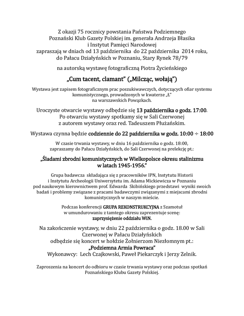 Z okazji 75 rocznicy powstania Państwa Podziemnego Poznański Klub Gazety Polskiej im. generała Andrzeja Błasika i Instytut Pamięci Narodowej zapraszają w dniach od 13 października do 22 października 2014 roku, do Pałacu Działyńskich w Poznaniu, Stary Rynek 78/79 na autorską wystawę fotograficzną Piotra Życieńskiego „Cum tacent, clamant” („Milcząc, wołają”) Wystawa jest zapisem fotograficznym prac poszukiwawczych, dotyczących ofiar systemu komunistycznego, prowadzonych w kwaterze „Ł” na warszawskich Powązkach. Uroczyste otwarcie wystawy odbędzie się 13 października o godz. 17:00. Po otwarciu wystawy spotkamy się w Sali Czerwonej z autorem wystawy oraz red. Tadeuszem Płużańskim. Wystawa czynna będzie codziennie do 22 października w godz. 10:00 ÷ 18:00 W czasie trwania wystawy, w dniu 16 października o godz. 18:00, zapraszamy do Pałacu Działyńskich, do Sali Czerwonej na prelekcję pt.: „Śladami zbrodni komunistycznych w Wielkopolsce okresu stalinizmu w latach 1945-1956.” Grupa badawcza składająca się z pracowników IPN, Instytutu Historii i Instytutu Archeologii Uniwersytetu im. Adama Mickiewicza w Poznaniu pod naukowym kierownictwem prof. Edwarda Skibińskiego przedstawi wyniki swoich badań i problemy związane z pracami badawczymi związanymi z miejscami zbrodni komunistycznych w naszym mieście. Podczas konferencji GRUPA REKONSTRUKCYJNA z Szamotuł w umundurowaniu z tamtego okresu zaprezentuje scenę: zaprzysiężenie oddziału WiN. Na zakończenie wystawy, w dniu 22 października o godz. 18.00 w Sali Czerwonej w Pałacu Działyńskich odbędzie się koncert w hołdzie Żołnierzom Niezłomnym pt.: „Podziemna Armia Powraca” Wykonawcy: Lech Czajkowski, Paweł Piekarczyk i Jerzy Zelnik. Zaproszenia na koncert do odbioru w czasie trwania wystawy oraz podczas spotkań Poznańskiego Klubu Gazety Polskiej.