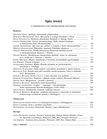 Spis treści Z HERMENEUTYKI PROBLEMÓW FILOZOFII Rozprawy Zbigniew Król: Apologia matematyki pitagorejskiej .......................................................... Wojciech Wrotkowski: Aἰών. Wieczność w teologii Heraklita z Efezu .......................... Piotr Pasterczyk: Miniatura platońskiej dialektyki w dialogu Teajtet ............................. Leszek Skowroński: Zarzut systematycznego błędu interpretacyjnego w tłumaczeniu Etyki nikomachejskiej .......................................................................... Leszek Skowroński: Jaki sens ma „dobro” w księdze I Etyki nikomachejskiej? ............. Mikołaj Domaradzki: Platońskie inspiracje Filońskiej alegorezy . ................................... Tomasz Pawlikowski: Źródła historyczne klasycznej definicji prawdy w sformułowaniach Tomasza z Akwinu . .................................................................... Tomasz Bartel: Metafizyczna interpretacja definicji: veritas est adaequatio rei et intellectus u Tomasza z Akwinu ......................................................................... Paweł Milcarek: Miejsce Awicebrona w tworzeniu się metafizyki egzystencjalnej ................... Jan Krokos: Prawda sumienia ................................................................................................. Aleksander Lisowski: Wpływ filozofii arabskiej na przekształcenie metafizyki w ontologię .................................................................................................. Wojciech Starzyński: Punkt wyjścia i przedmiot metafizyki w ujęciu Suareza . ............ Bogusław Paź: Zasada racji jako naczelna zasada poznania i bytu w wykładni F.Ch. Baumeistera ......................................................................................................... Seweryn Blandzi, Danilo Facca: Czym właściwie jest podmiot . ................................... Dariusz Łukasiewicz: Podstawy i główne zasady teodycei Bernarda Bolzano ............... Maciej Soin: Wittgenstein – prawda i pewność .................................................................... Seweryn Blandzi: Aktualność myśli Kantowskiej ............................................................... Norbert Leśniewski: „Logika” – ontologia – fenomenologia. Próba interpretacji filozofii Heideggera (1919–1929) .............................................. Jakub Duraj: Działaniowy kontekst realizacji znaczeń ....................................................... Mateusz Bonecki: Wzajemne uwikłanie poręczności i obecności w kontekście praktycznego rozumienia prawdy u Heideggera ....................................................... 5 21 33 49 67 83 95 111 123 139 155 171 189 207 223 239 249 265 281 291 Tłumaczenia Przemysław Parszutowicz: O dyskusjach Cassirera z Heideggerem . ............................ 305 Ernst Cassirer: Kant a problem metafizyki . ....................................................................... 313 Hans-Georg Gadamer: Parmenides Platona i jego oddziaływanie ................................... 337 Recenzje Anna Drabarek: Intuicja. Poznanie bezpośrednie, Wyższa Szkoła Handlu i Prawa im. Ryszarda Łazarskiego, Warszawa 2006. Rec. Grzegorz Pyszczek . .................. 351 Jan Krokos: Sumienie jako poznanie, Warszawa 2004. Rec. Maciej Bała ....................... 354 Noty o Autorach . ...................................................................................................................... 359 Contents Articles Zbigniew Król: An Apology of Pythagorean Mathematics ............................................... Wojciech Wrotkowski: Aἰών. Eternity in Theology of Heraclitus of Ephesus . ............ Piotr Pasterczyk: Miniature Dialectis in Plato’s Theatetus .............................................. Leszek Skowroński: On a Systematic Error in the Polish Translation of the Nicomachean Ethics . ......................................................................................... Leszek Skowroński: What is the Meaning of ‘Good’ in Book I of Nicomachean Ethics? . .............................................................................................. Mikołaj Domaradzki: Platonic Inspirations of Philo’s Allegorical Method ................... Tomasz Pawlikowski: Historical Sources of the Classical Conception of Truth in Thomas Aquinas ....................................................................................... Tomasz Bartel: Metaphysical Interpretations of ‘Veritas est aedequatio rei et intelectus’ in Thomas Aquinas . .......................................................................... Paweł Milcarek: Avicebron – A Giant of Circumstances in Existential Metaphysic ................ Jan Krokos: The Truth of Conscience ................................................................................... Aleksander Lisowski: How Arabian Philosophy Contributed to Transform Metaphysics into Ontology . ................................................................. Wojciech Starzyński: The Starting Point and Development of Metaphysics in Francisco Suarez ....................................................................................................... Bogusław Paź: Principium rationis in Ch. F. Baumeister ................................................... Seweryn Blandzi, Danilo Facca: What is to Be Properly Called ‘Subject’. Genealogy of a Concept ............................................................................................... Dariusz Łukasiewicz: Premises and Main Claims of Theodicy by Bernard Bolzano ............... Maciej Soin: Wittgenstein: Truth and Certainty ................................................................... Seweryn Blandzi: A Perennial Aspect of Kant’s Philosophy . .......................................... Norbert Leśniewski: Logic, Ontology, Phenomenology – an Interpretation of Heidegger . ...................................