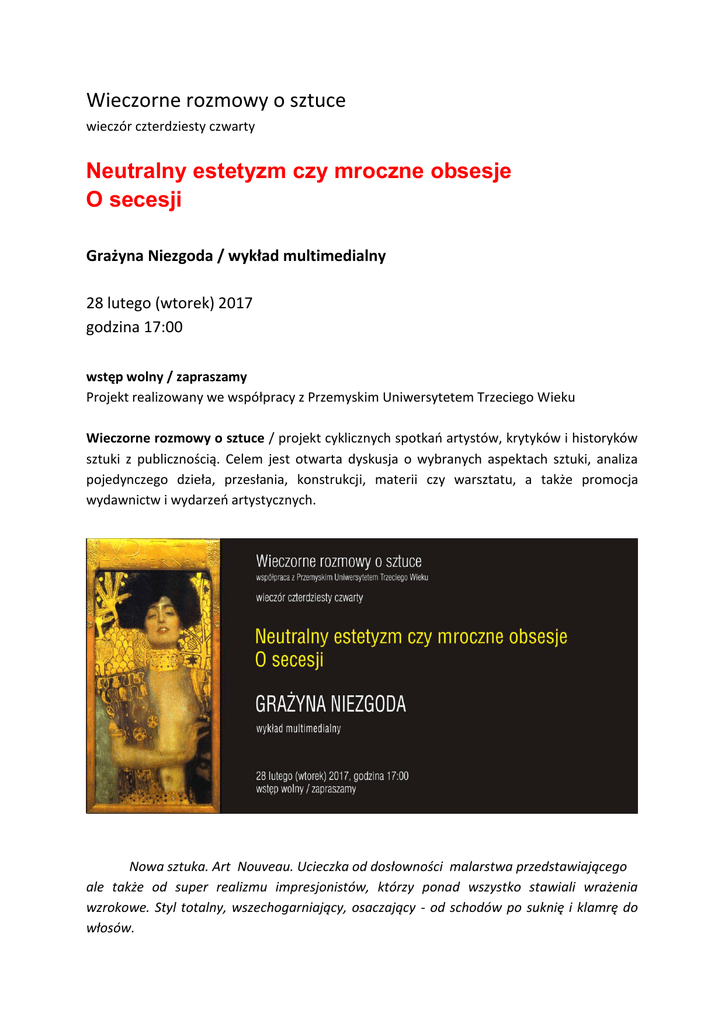Wieczorne rozmowy o sztuce wieczór czterdziesty czwarty Neutralny estetyzm czy mroczne obsesje O secesji Grażyna Niezgoda / wykład multimedialny 28 lutego (wtorek) 2017 godzina 17:00 wstęp wolny / zapraszamy Projekt realizowany we współpracy z Przemyskim Uniwersytetem Trzeciego Wieku Wieczorne rozmowy o sztuce / projekt cyklicznych spotkao artystów, krytyków i historyków sztuki z publicznością. Celem jest otwarta dyskusja o wybranych aspektach sztuki, analiza pojedynczego dzieła, przesłania, konstrukcji, materii czy warsztatu, a także promocja wydawnictw i wydarzeo artystycznych. Nowa sztuka. Art Nouveau. Ucieczka od dosłowności malarstwa przedstawiającego ale także od super realizmu impresjonistów, którzy ponad wszystko stawiali wrażenia wzrokowe. Styl totalny, wszechogarniający, osaczający - od schodów po suknię i klamrę do włosów. Owe kobiece włosy - długie i wijące się jak węże wybijają się na główny motyw. Salome, Judyta, Medea, wodnice, nimfy i harpie - śmiercionośne bohaterki o pięknych ciałach i wielkiej sile. Są uwolnione i niepodległe a miłośd do nich może zakooczyd się śmiercią. Secesja to przeczucie emancypacji kobiet ale i przyszłych dwóch wojen, bo wkrótce zginie wielu, wielu młodych mężczyzn. Te lęki kooca wieku uosabiają piękne, wyrafinowane, eleganckie Judyty upychające głowy Holofernesów do torebek. O szalonych kamienicach w Barcelonie, tęczowym szkle w Paryżu, złocie w Wiedniu, pawiach w Londynie i biżuterii w Nowym Jorku. O mrocznych nastrojach, mizoginizmie, psychoanalizie i zgubnym erotyzmie - opowiem - zapraszam - GN Grażyna Niezgoda / fotografka, antykwariuszka, galerzystka, krytyczka sztuki, rzeczoznawczyni Ministra Kultury w specjalizacji: ocena i wycena dzieła sztuki; biegła sądowa z zakresu sztuki i antyków. Zorganizowała 22 wystawy indywidualne fotografii. W 2007 roku odbyła się wystawa "Twarze między wierszami, książki ilustrowane fotografiami Grażyny Niezgody". W roku 2010 wraz z Kazimierzem Wiśniakiem opublikowała album "Narodziny obrazu". Jej prace prezentowano m.in. w albumach "Sztuka fotografii", "Fotografowie", "Mistrzowie polskiego pejzażu". ZAPRASZAMY www.bwaprzemysl.pl