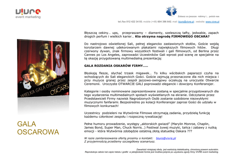 Zobacz co jeszcze robimy i… polub nas tel./fax 012 422 34 93; mobile (+48) 604 396 642; mail: [email protected] ; website: www.vivre.pl Błyszczą cekiny… ups, przepraszamy – diamenty, szeleszczą tafty, jedwabie, zapach drogich perfum i wielkich karier… Kto otrzyma nagrodę FIRMOWEGO OSCARA? Do nastrojowo oświetlonej Sali, pełnej elegancko zastawionych stołów, Goście wejdą korytarzem dawnej udekorowanym plakatami największych filmowych hitów. Długi czerwony dywan, znak firmowy wszystkich festiwali i gali filmowych, od Berlina przez Cannes po Los Angeles, zaprowadzi Uczestników Gali wprost pod scenę ze specjalnie na tę okazję przygotowaną multimedialną prezentacją: GALA ROZDANIA OSKARÓW FIRMY….. Błyskają flesze, słychać trzask migawek… To kilku wścibskich paparazzi czyha na wchodzących do Sali eleganckich Gości. Goście zajmują przeznaczone dla nich miejsca i przy muzyce granej przez zespół jazzowo-swingowy oczekują na uroczyste Otwarcie Ceremonii. Uroczyste OTWARCIE GALI poprowadzi elegancki i dowcipny Konferansjer. Kategorie i osoby nominowane zaprezentowane zostaną w specjalnie przygotowanych dla tego wydarzenia multimedialnych spotach wyświetlanych na ekranie. Odczytanie przez Przedstawicieli Firmy nazwisk Nagrodzonych Osób zostanie ozdobione niezwykłymi muzycznymi fanfarami. Bezpośrednio po kolacji Konferansjer zaprosi Gości do udziału w filmowych konkursach! Uczestnicy podzieleni na Wytwórnie Filmowe otrzymają zadania, przydzielą funkcję każdemu członkowi zespołu i rozpoczną rywalizację! GALA OSCAROWA Pełne humoru prowadzenie, występy „aktorskich gwiazd” (Marylin Monroe, Chaplin, James Bond, Super Man, Chuck Norris…) Festiwal żywej muzyki, tańca i zabawy z nutką emocji - która Wytwórnia zdobędzie ostatnią złotą statuetkę Oskara ??? W razie zainteresowania ofertą prosimy o kontakt: [email protected] Z przyjemnością prześlemy szczegółowy scenariusz. Zawartość niniejszej oferty jest wartością intelektualną, chronioną prawem autorskim. Reprodukcja całości lub części tekstu i grafiki w jakiejkolwiek formie jest możliwa jedynie po uzyskaniu zgody firmy VIVRE event marketing.