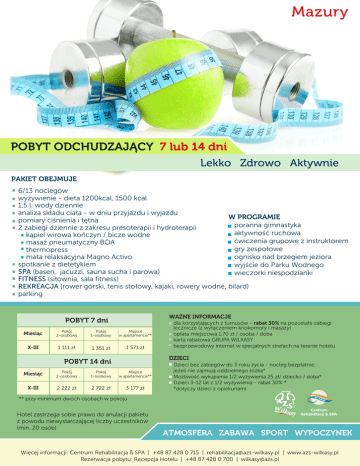 Mazury POBYT ODCHUDZAJĄCY 7 lub 14 dni Lekko Zdrowo Aktywnie PAKIET OBEJMUJE 6/13 noclegów wyżywienie - dieta 1200kcal, 1500 kcal 1,5 l. wody dziennie analiza składu ciała - w dniu przyjazdu i wyjazdu W PROGRAMIE pomiary ciśnienia i tętna poranna gimnastyka 2 zabiegi dziennie z zakresu presoterapii i hydroterapii aktywność ruchowa kąpiel wirowa kończyn / bicze wodne ćwiczenia grupowe z instruktorem masaż pneumatyczny BOA gry zespołowe thermopress mata relaksacyjna Magno Activo ognisko nad brzegiem jeziora spotkanie z dietetykiem wyjście do Parku Wodnego SPA (basen, jacuzzi, sauna sucha i parowa) wieczorki niespodzianki FITNESS (siłownia, sala fitness) REKREACJA (rower górski, tenis stołowy, kajaki, rowery wodne, bilard) parking WAŻNE INFORMACJE POBYT 7 dni Miesiąc Pokój 2-osobowy Pokój 1-osobowy Miejsce w apartamencie** X-III 1 111 zł 1 351 zł 1 571 zł dla korzystających z turnusów - rabat 30% na pozostałe zabiegi lecznicze (z wyłączeniem kriokomory i masaży) opłata miejscowa 1,70 zł / osoba / doba karta rabatowa GRUPA WILKASY bezprzewodowy internet w specjalnych strefach na terenie hotelu DZIECI POBYT 14 dni Miesiąc Pokój 2-osobowy Pokój 1-osobowy Miejsce w apartamencie** X-III 2 222 zł 2 722 zł 3 177 zł Dzieci bez zabiegów do 3 roku życia - nocleg bezpłatnie, jeżeli nie zajmują oddzielnego łóżka* Możliwość wykupienia 1/2 wyżywienia 25 zł/ dziecko / doba* Dzieci 3-12 lat z 1/2 wyżywienia - rabat 30% * *dotyczy dzieci z opiekunami ** przy minimum dwóch osobach w pokoju Hotel zastrzega sobie prawo do anulacji pakietu z powodu niewystarczającej liczby uczestników (min. 20 osób) ATMOSFERA ZABAWA SPORT WYPOCZYNEK Więcej informacji: Centrum Rehabilitacja & SPA | +48 87 428 0 715 | [email protected] | www.azs-wilkasy.pl Rezerwacja pobytu: Recepcja Hotelu | +48 87 428 0 700 | [email protected] ATMOSFERA ZABAWA SPORT WYPOCZYNEK Tanita Analizator Składu Ciała MC 780 MA wykorzystuje technologię umożliwiającą wykonywanie pomiaru segmentowego rozłożenia tkanki tłuszczowej i masy mięśni. Odczyt parametrów pomiarowych dla całego ciała zawiera: całkowita zawartość wody w kg i % masa protein w kg indeks masy ciała masa kości w kilogramach kg leg Score - wskaźnik masy mięśni nóg do masy ciała wskaźnik rozmieszczenia tkanki tłuszczowej wiek metaboliczny BMR - wskaźnik podstawowej przemiany materii kcal Te szczegółowe informacje pozwalają na obserwowanie nawet najmniejszych zmian, które mają miejsce w ciele badanej osoby i motywują do kontynuowania programu i dążenia do osiągnięcia założonego celu. Analizator składu ciała umożliwia: optymalizowanie kondycji zdrowotnej ocenę ogólnej sprawności stałą kontrolę proporcji masy mięśniowej i tłuszczowej ustalenie przemiany podstawowej kontrolę zawartości wody w organizmie i stanu odżywienia kontrolę utraty masy mięśniowej rehabilitację w chorobach serca Analizator posiada atest i potwierdzenie do klinicznego zastosowania. Posiada również certyfikat 93/42 EEC (unijna norma dla urządzeń medycznych). ZAPRASZAMY DO NAJNOWOCZEŚNIEJSZEGO CENTRUM REHABILITACJI W SERCU MAZUR Gdańsk Wilkasy 243 km Olsztyn Giżycko 5 km 133 km Białystok Warszawa 170 km 238 km www.azs-wilkasy.pl AZS COSA Ośrodek w Wilkasach | ul. Niegocińska 5, Wilkasy | 11-500 Giżycko | tel.: +48 87 428 0 700 fax: +48 87 428 0 701 | [email protected]