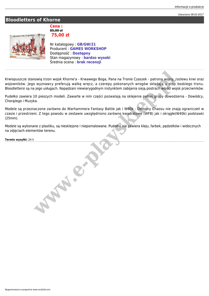 Informacje o produkcie Utworzono 08-03-2017 Bloodletters of Khorne Cena : 85,00 zł 75,00 zł Nr katalogowy : GB/GW/21 Producent : GAMES WORKSHOP Dostępność : Dostępny Stan magazynowy : bardzo wysoki Średnia ocena : brak recenzji p. pl Krwiopuszcze stanowią trzon wojsk Khorne'a - Krwawego Boga, Pana na Tronie Czaszek - patrona wojny, rozlewu krwi oraz wojowników. Jego wyznawcy preferują walkę wręcz, a czerepy pokonanych wrogów składają u stóp boskiego tronu. Bloodlettersi są na jego usługach. Napędzani niewiarygodnym instynktem zabijania sieją postrach wśród wojsk przeciwników. Pudełko zawiera 10 pieszych modeli. Zawarte w nim części pozwalają na sklejenie pełnej grupy dowodzenia - Dowódcy, Chorążego i Muzyka. ay sk le Modele są przeznaczone zarówno do Warhammera Fantasy Battle jak i W40k - Demony Chaosu nie znają ograniczeń w czasie i przestrzeni. Z tego powodu w zestawie uwzględniono zarówno kwadratowe (WFB) jak i okrągłe(W40k) podstawki (25mm). Modele są wykonane z plastiku, są niesklejone i niepomalowane. Pudełko nie zawiera kleju, farbek, pędzelków i widocznych na zdjęciach elementów terenu. w w w .e - pl Termin wysyłki: 24 h Wygenerowano w programie www.oscGold.com