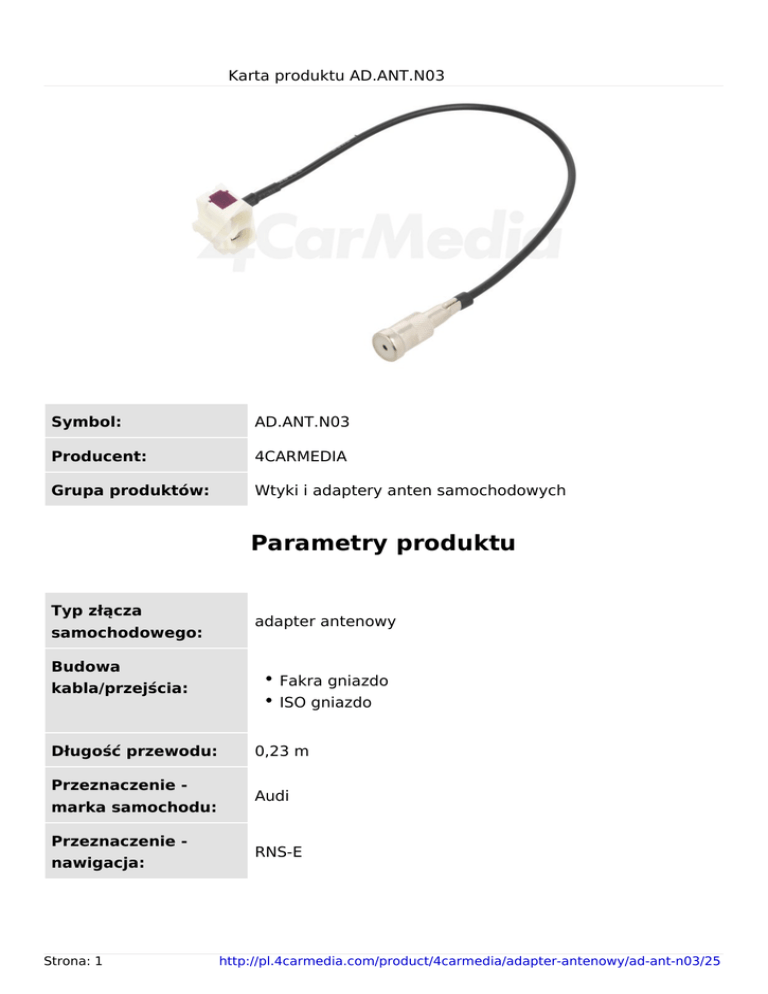 Karta produktu AD.ANT.N03 Symbol: AD.ANT.N03 Producent: 4CARMEDIA Grupa produktów: Wtyki i adaptery anten samochodowych Parametry produktu Typ złącza samochodowego: Budowa kabla/przejścia: Długość przewodu: Przeznaczenie marka samochodu: Przeznaczenie nawigacja: Strona: 1 adapter antenowy Fakra gniazdo ISO gniazdo 0,23 m Audi RNS-E http://pl.4carmedia.com/product/4carmedia/adapter-antenowy/ad-ant-n03/25 Karta produktu AD.ANT.N03 Opis: Adapter jest niezbędny przy zamianie radia na nawigację typu RNS- E. Zapewnia wygodę i bezpieczeństwo funkcjonowania nawigacji pomijając lutowanie i izolowanie odciętych przewodów. Adapter umożliwa profesjonalne podpięcie montowanej nawigacji przy pomocy oryginalnej wtyczki ISO-DIN. Informacje dodatkowe Masa brutto: Strona: 2 0,013 kg http://pl.4carmedia.com/product/4carmedia/adapter-antenowy/ad-ant-n03/25
